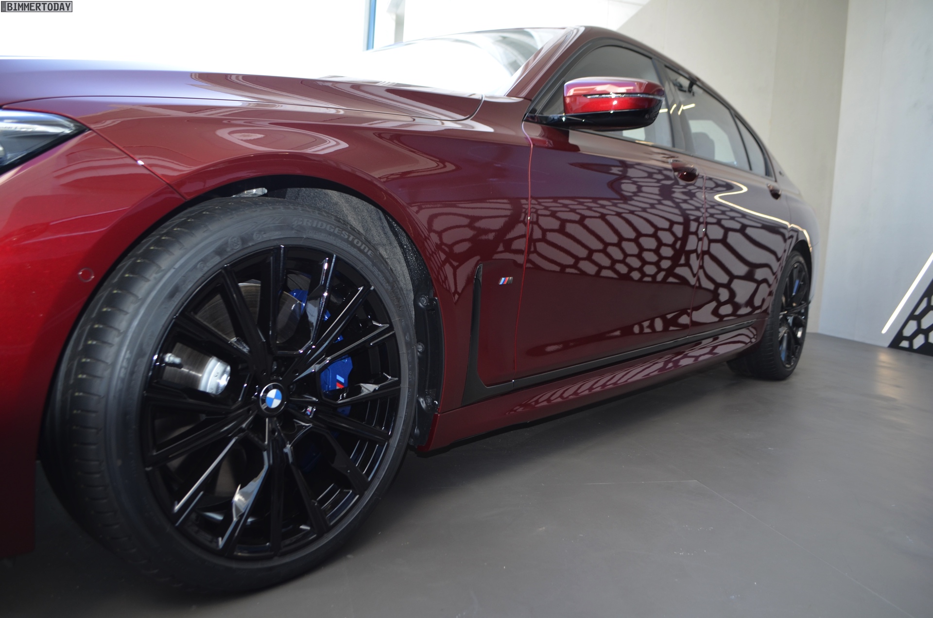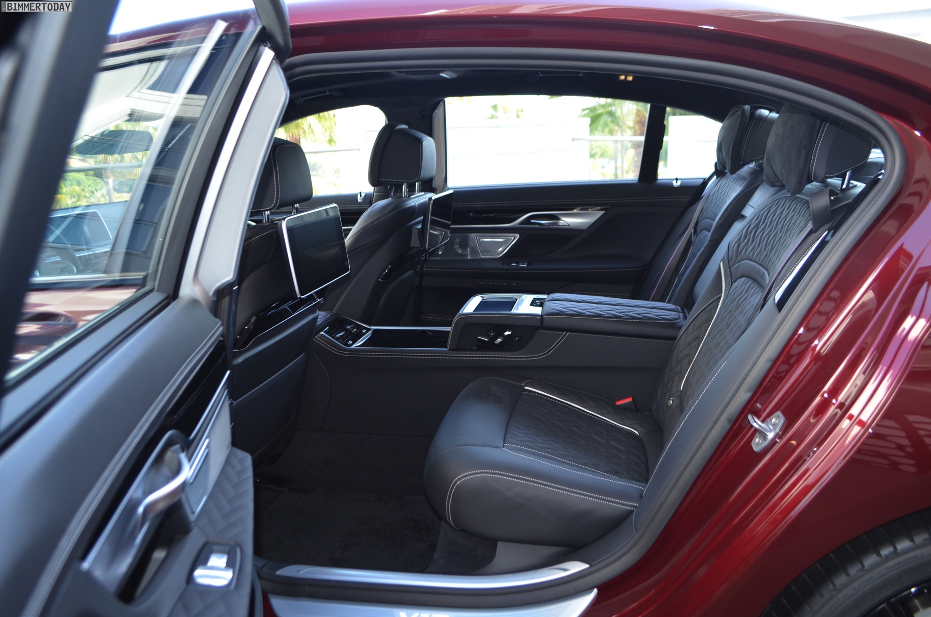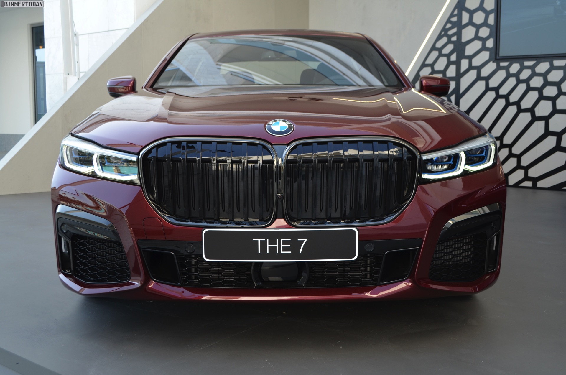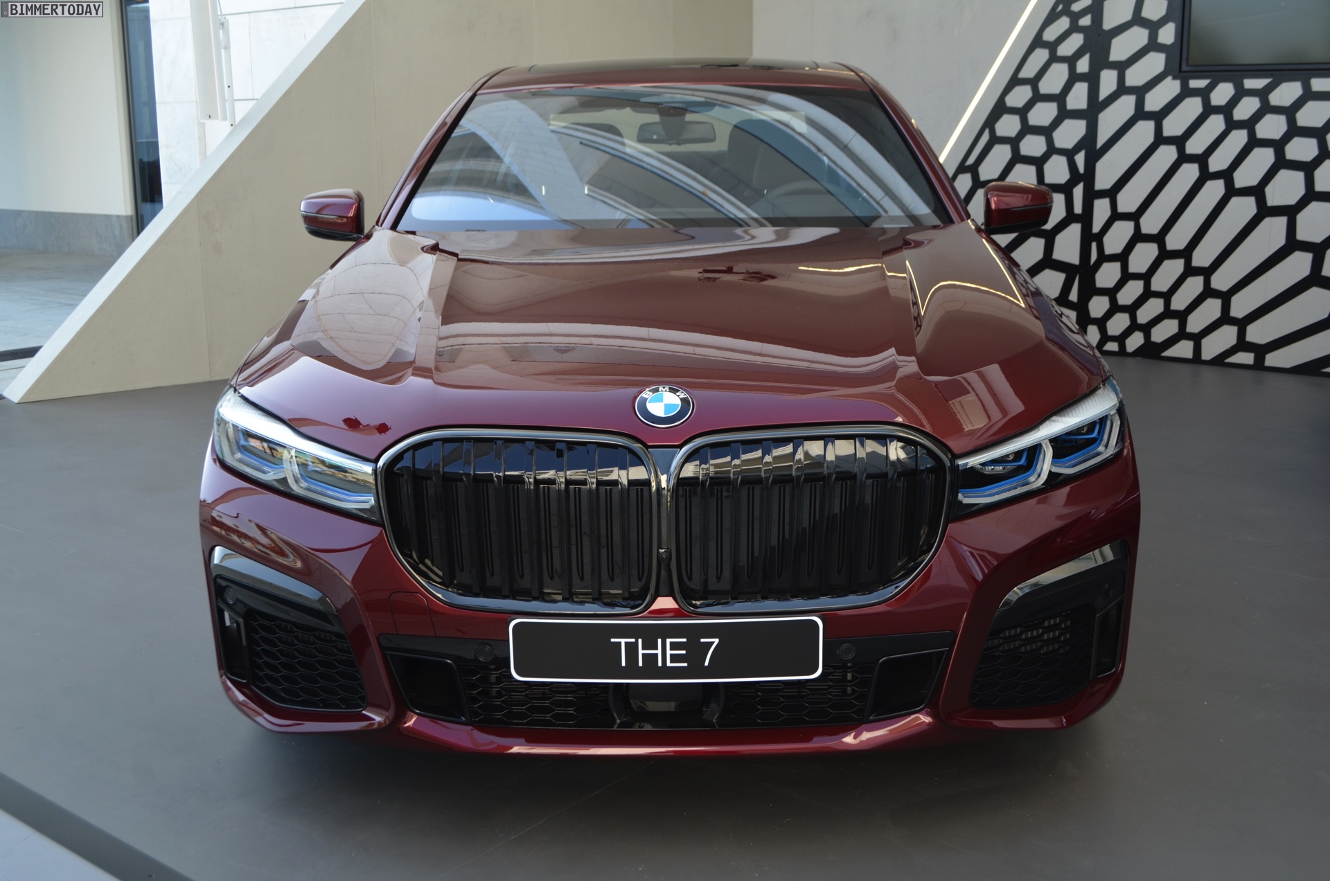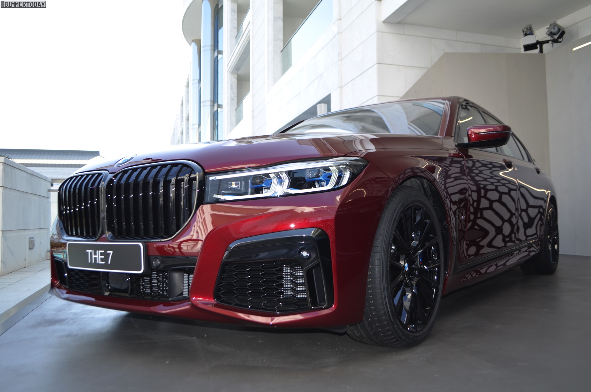 Unsere aktuellen Fotos zeigen das Topmodell mit auffälliger Individual-Lackierung in Aventurin-Rot und der Shadow Line mit erweiterten Umfängen. Letztere sorgt unter anderem dafür, dass die mächtigen Nieren an der Front in Hochglanzschwarz ausgeführt sind, wodurch der Gesamteindruck erheblich sportlicher wird. Schwarze Felgen und weitere Details in der dunkelsten aller Farben runden das besondere Exterieur ab und machen auch Laien klar, dass hier kein “gewöhnlicher 7er” unterwegs ist.