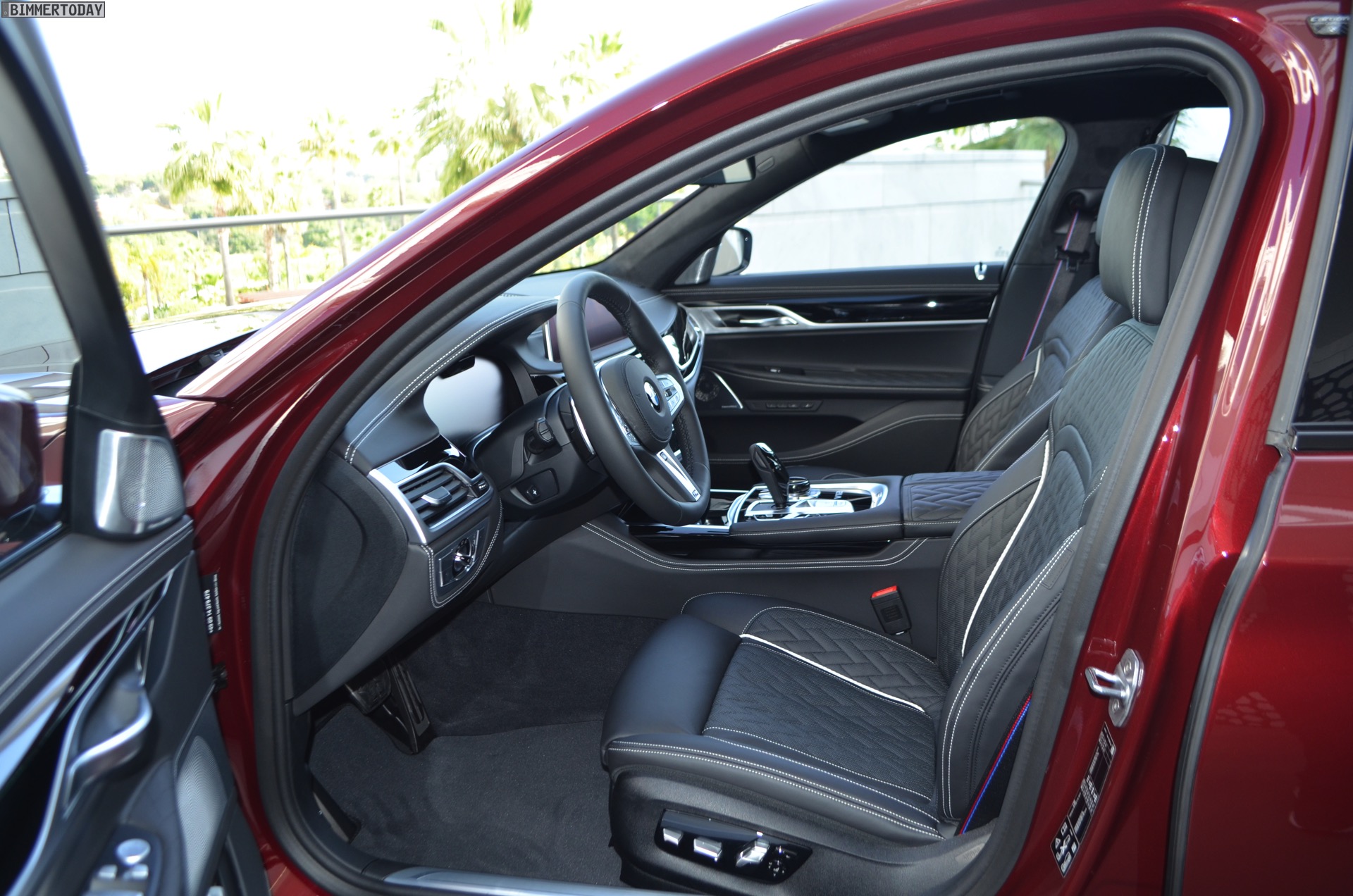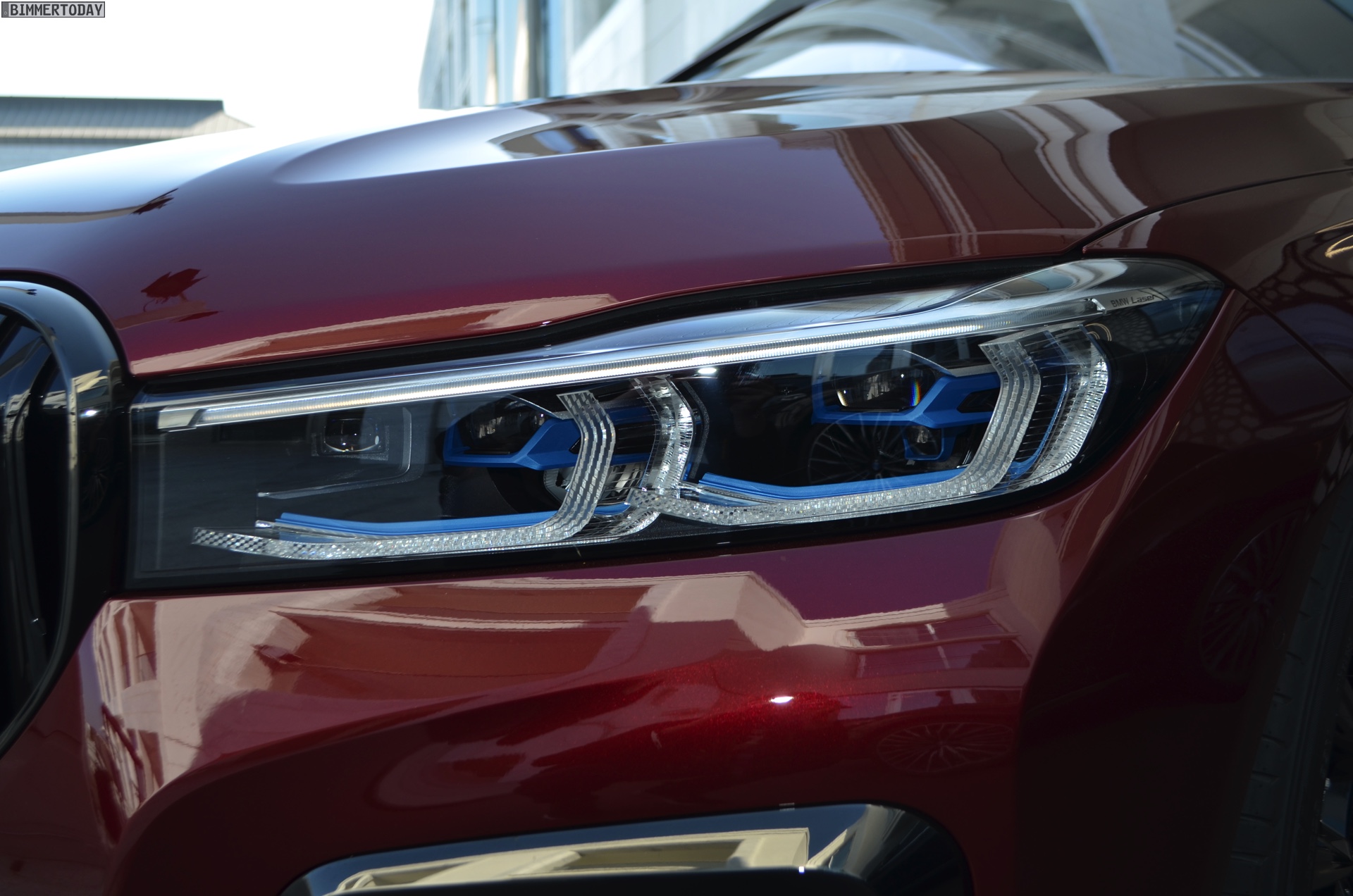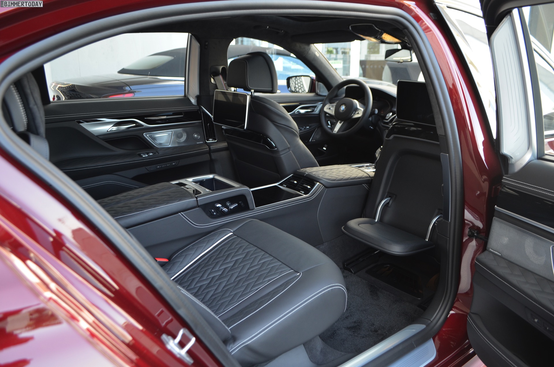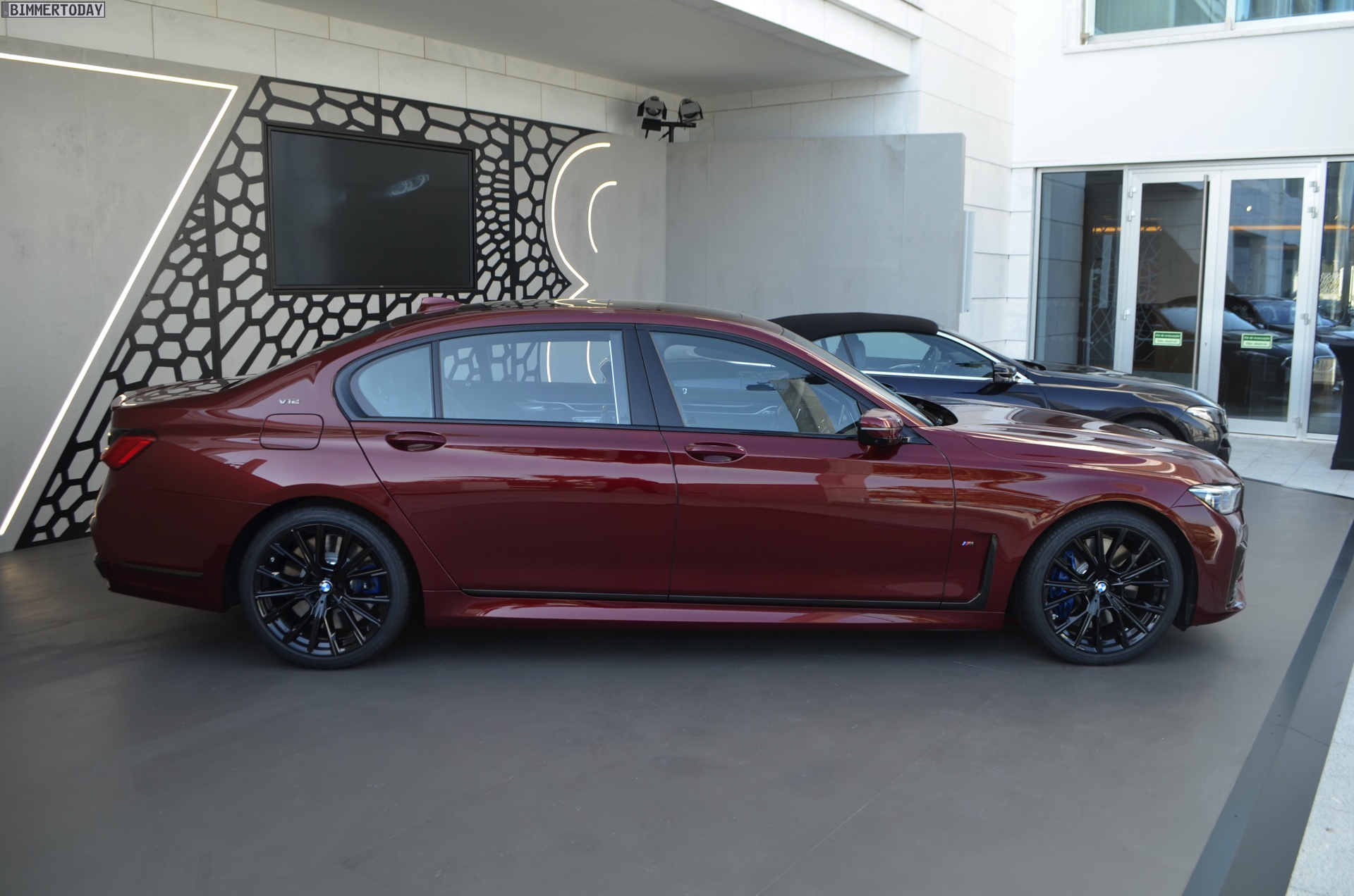Unsere aktuellen Fotos zeigen das Topmodell mit auffälliger Individual-Lackierung in Aventurin-Rot und der Shadow Line mit erweiterten Umfängen. Letztere sorgt unter anderem dafür, dass die mächtigen Nieren an der Front in Hochglanzschwarz ausgeführt sind, wodurch der Gesamteindruck erheblich sportlicher wird. Schwarze Felgen und weitere Details in der dunkelsten aller Farben runden das besondere Exterieur ab und machen auch Laien klar, dass hier kein “gewöhnlicher 7er” unterwegs ist.
