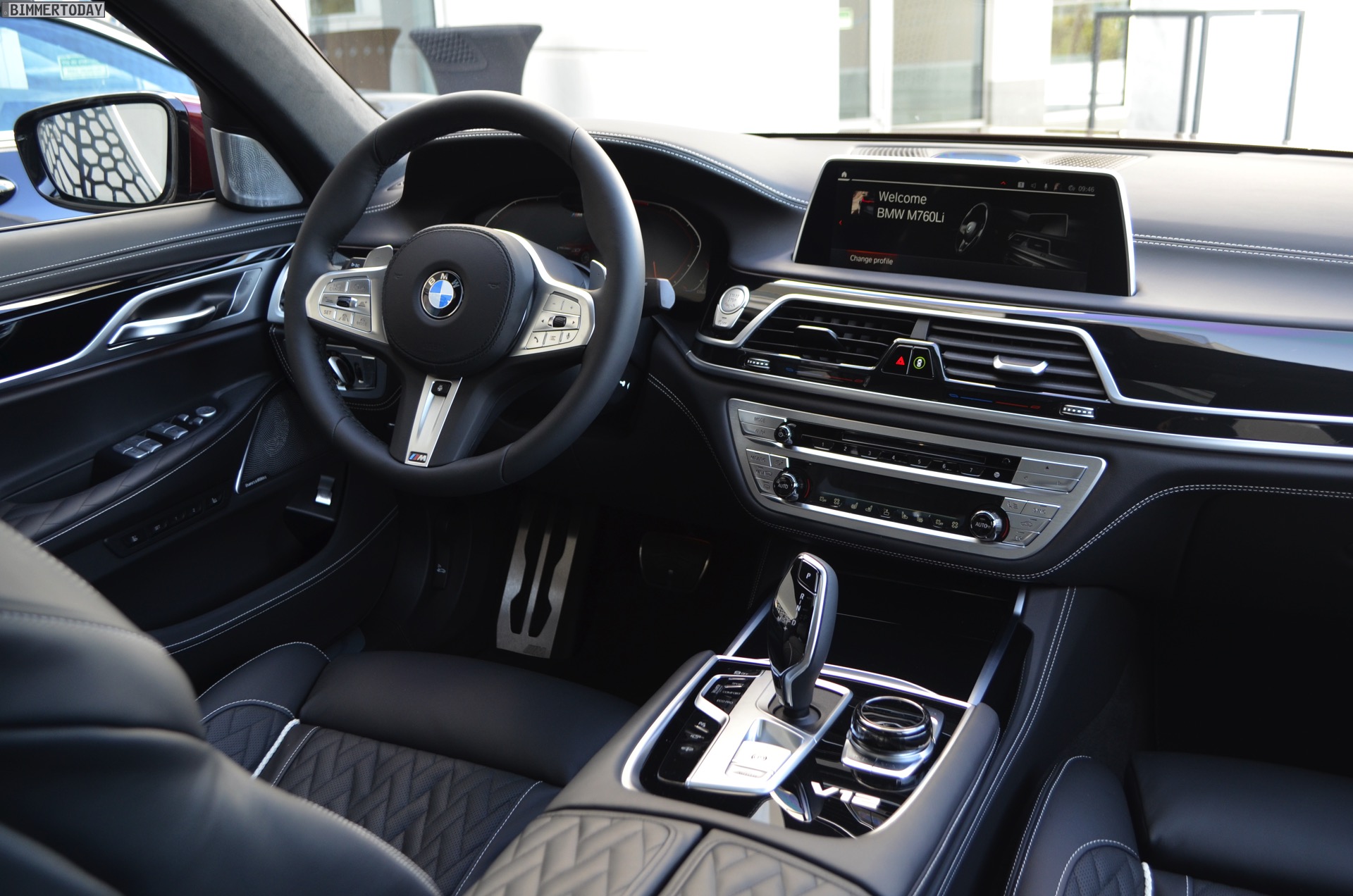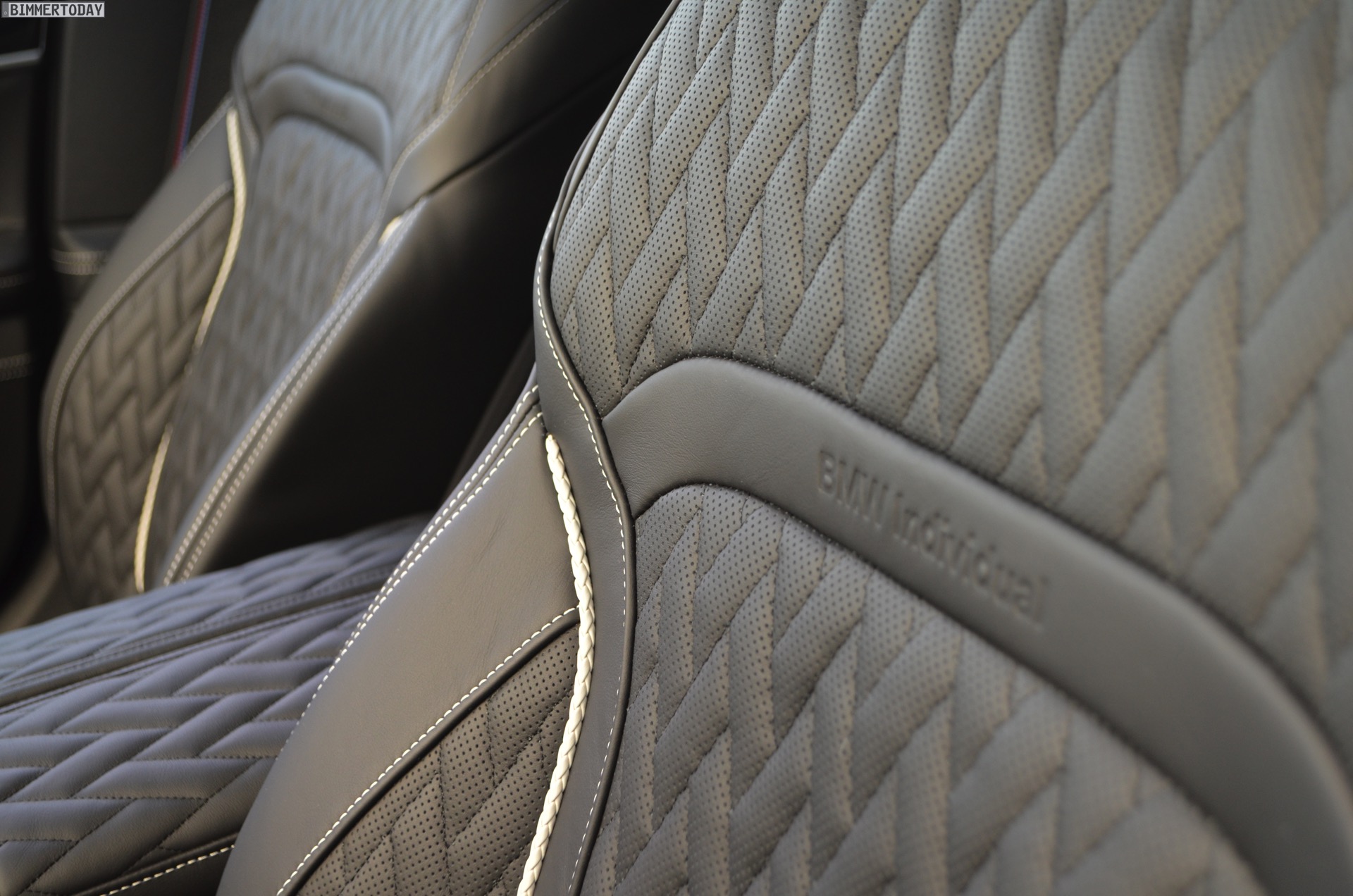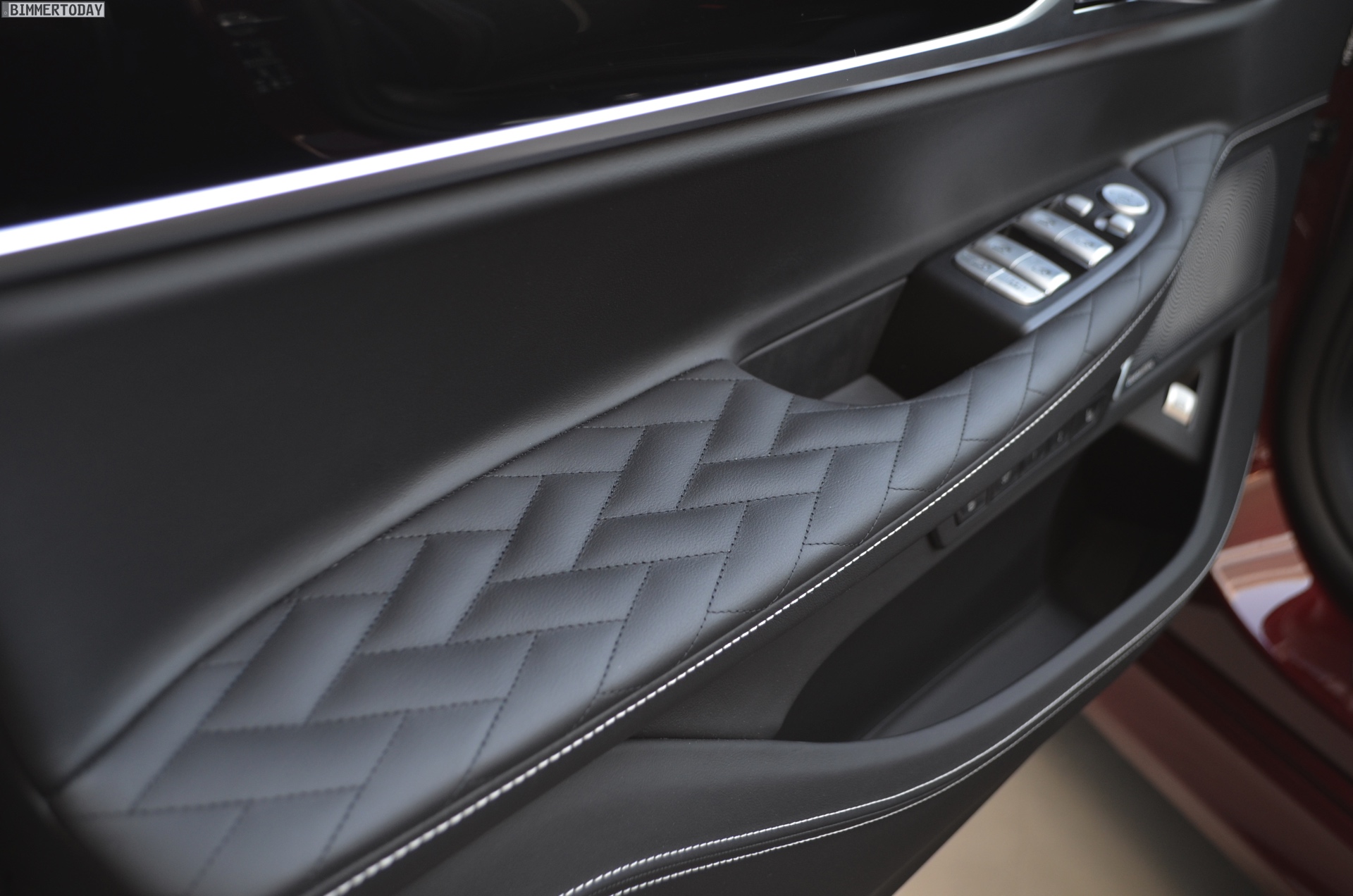Im Innenraum trägt der hier gezeigte M760Li die BMW Individual Volllederausstattung Merino Feinnarbe, die selbst im Topmodell noch über 8.000 Euro Aufpreis kostet. Die edle Steppung umfasst seit dem Facelift noch mehr Bereiche des Innenraums als bisher, unter anderem sind auch die Armauflagen in den Türen derart hochwertig bearbeitet. Weiße Kontrastnähte setzen luxuriöse Akzente.