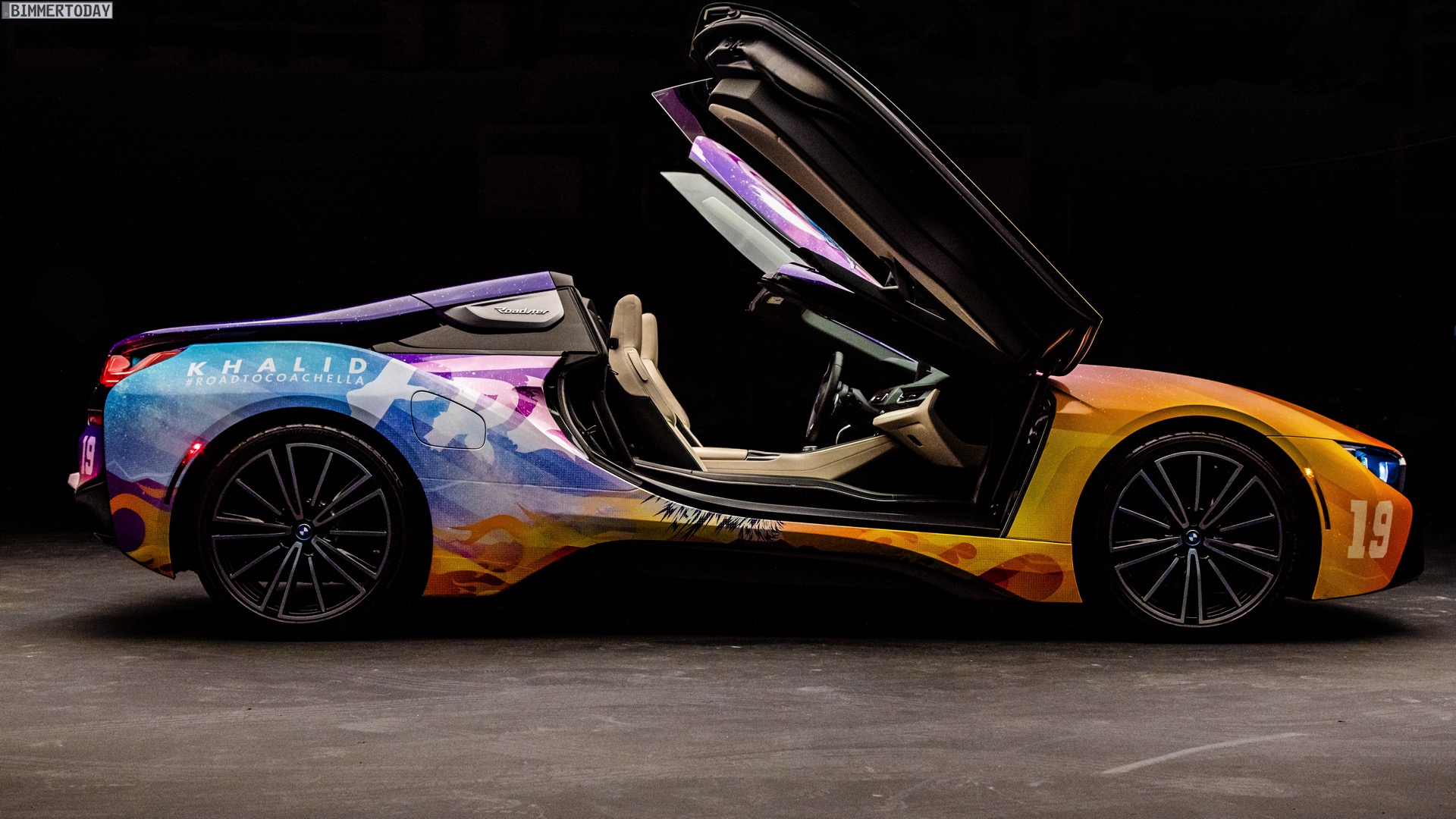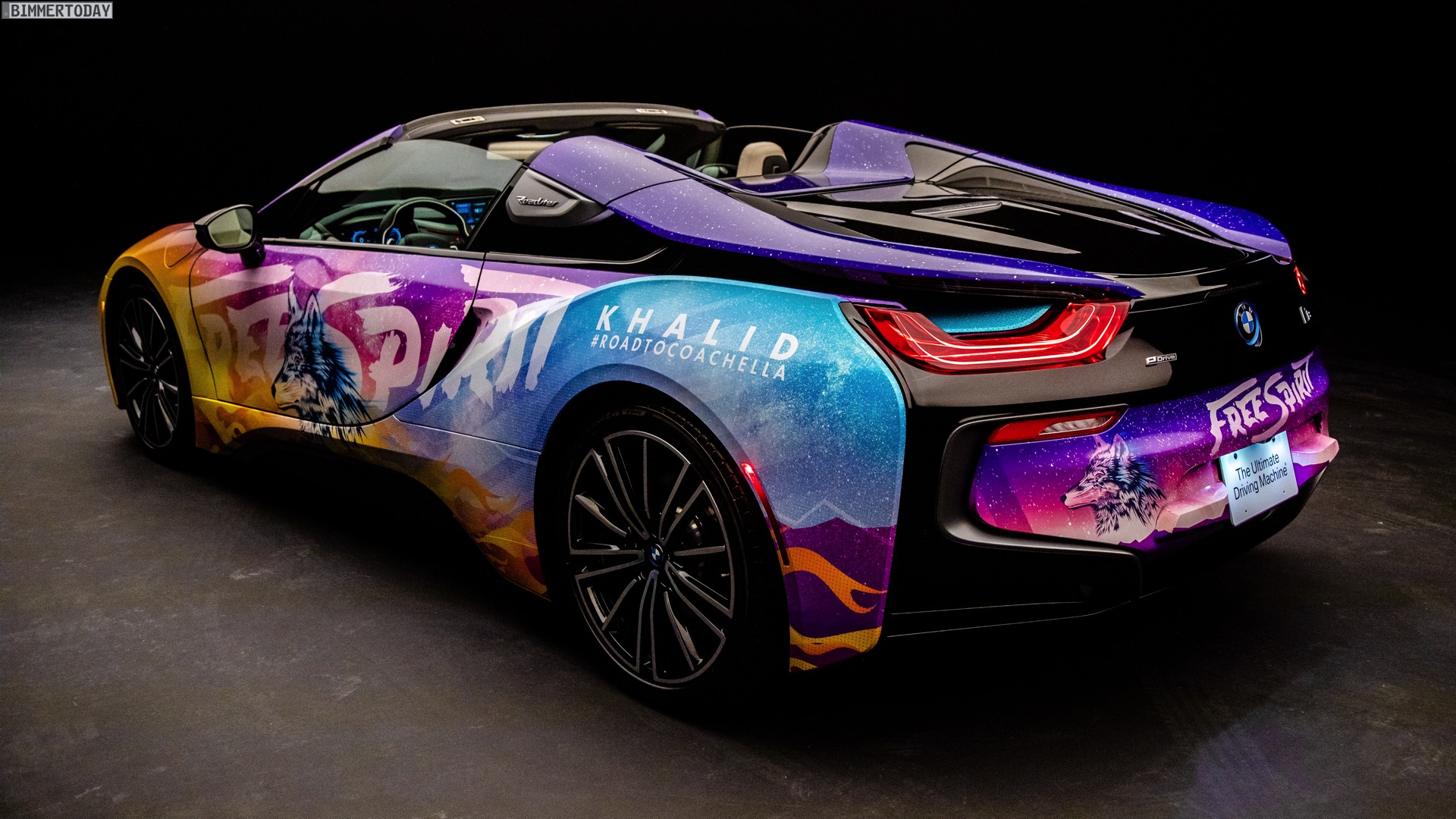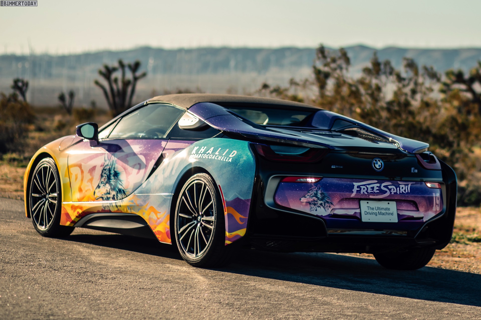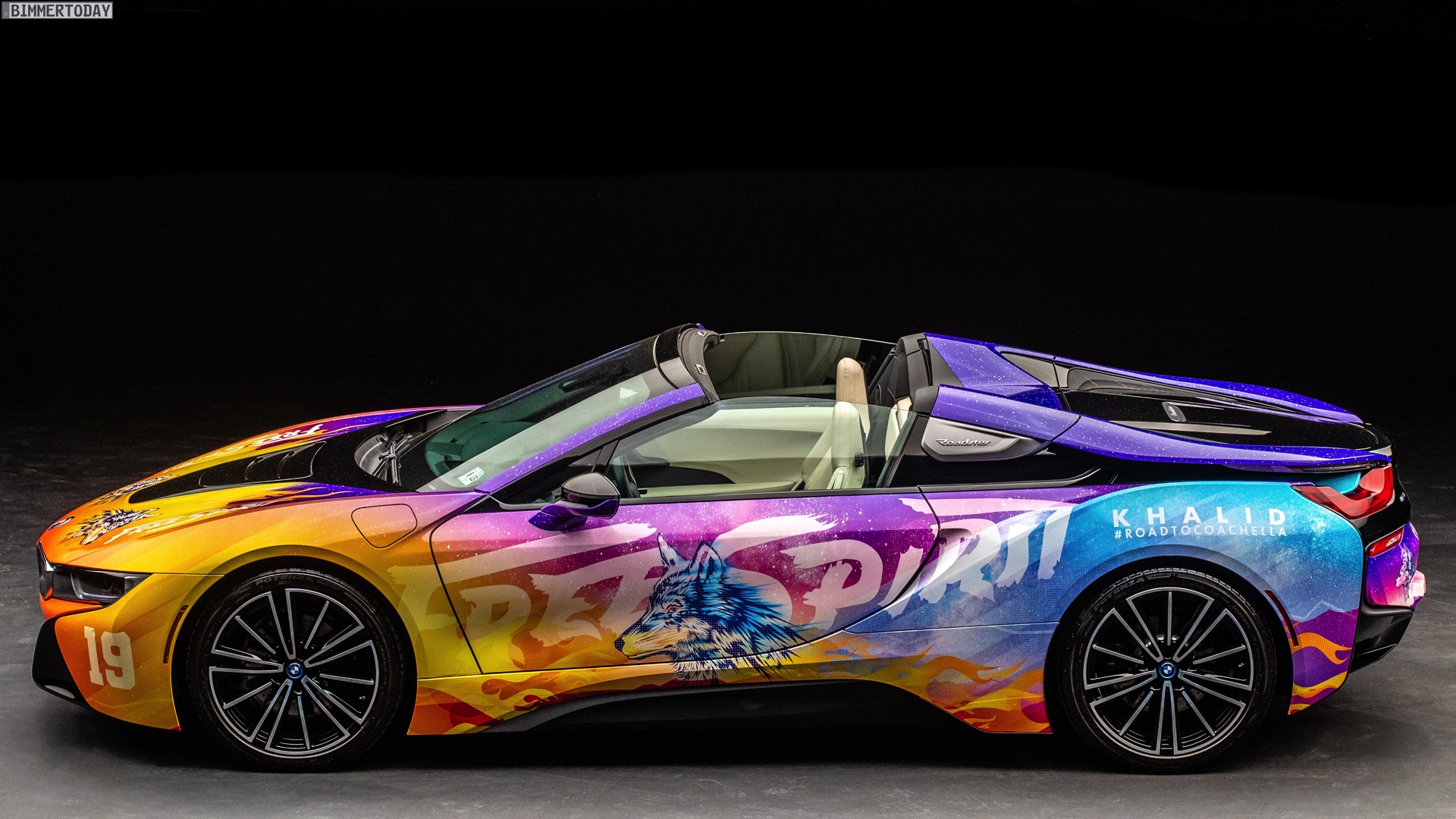 Fast wie ein offizielles BMW Art Car präsentiert sich der BMW i8 Roadster für Coachella Valley Music and Arts Festival 2019. Der offene Plug-in-Hybrid-Sportwagen trägt eine komplett von Soul-Sänger Khalid gestaltete und im wahrsten Sinne des Wortes knallbunte Außenhaut, die noch mehr Blicke auf den schon mit einfarbiger Lackierung äußerst vielbeachteten Roadster lenkt.