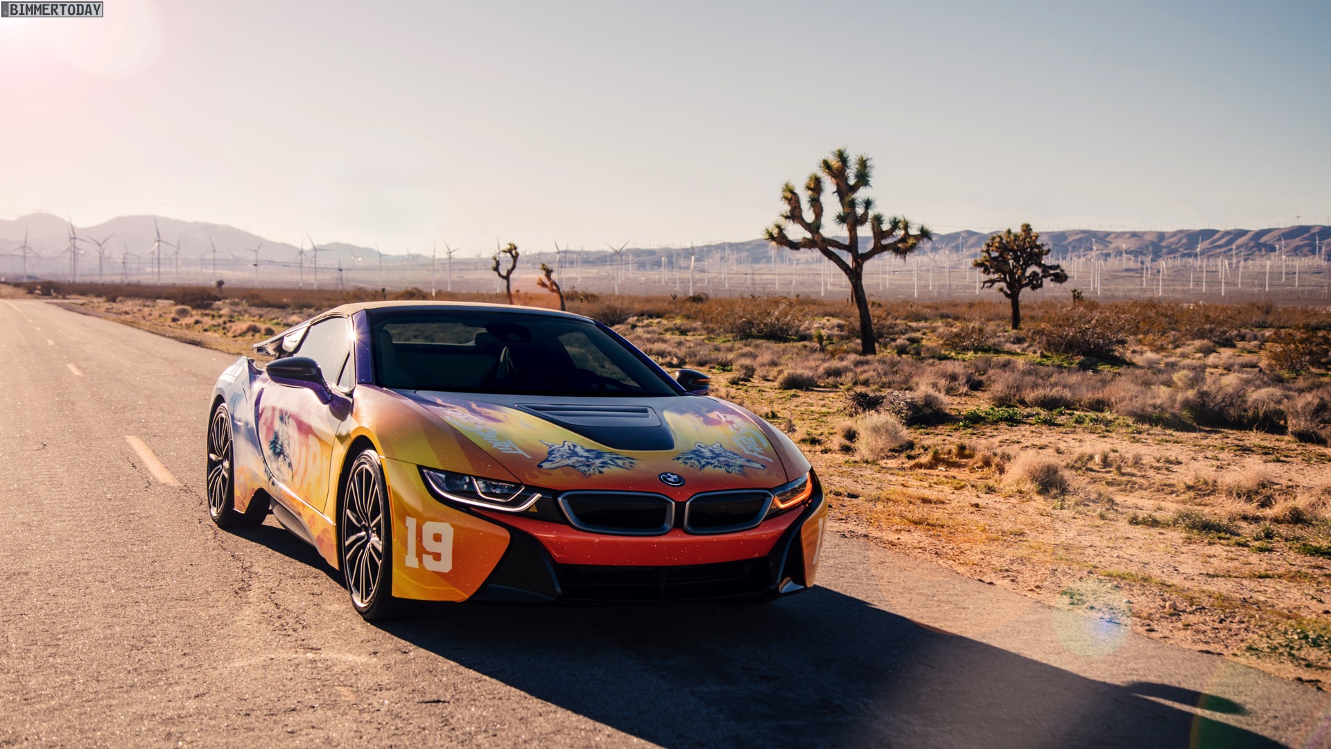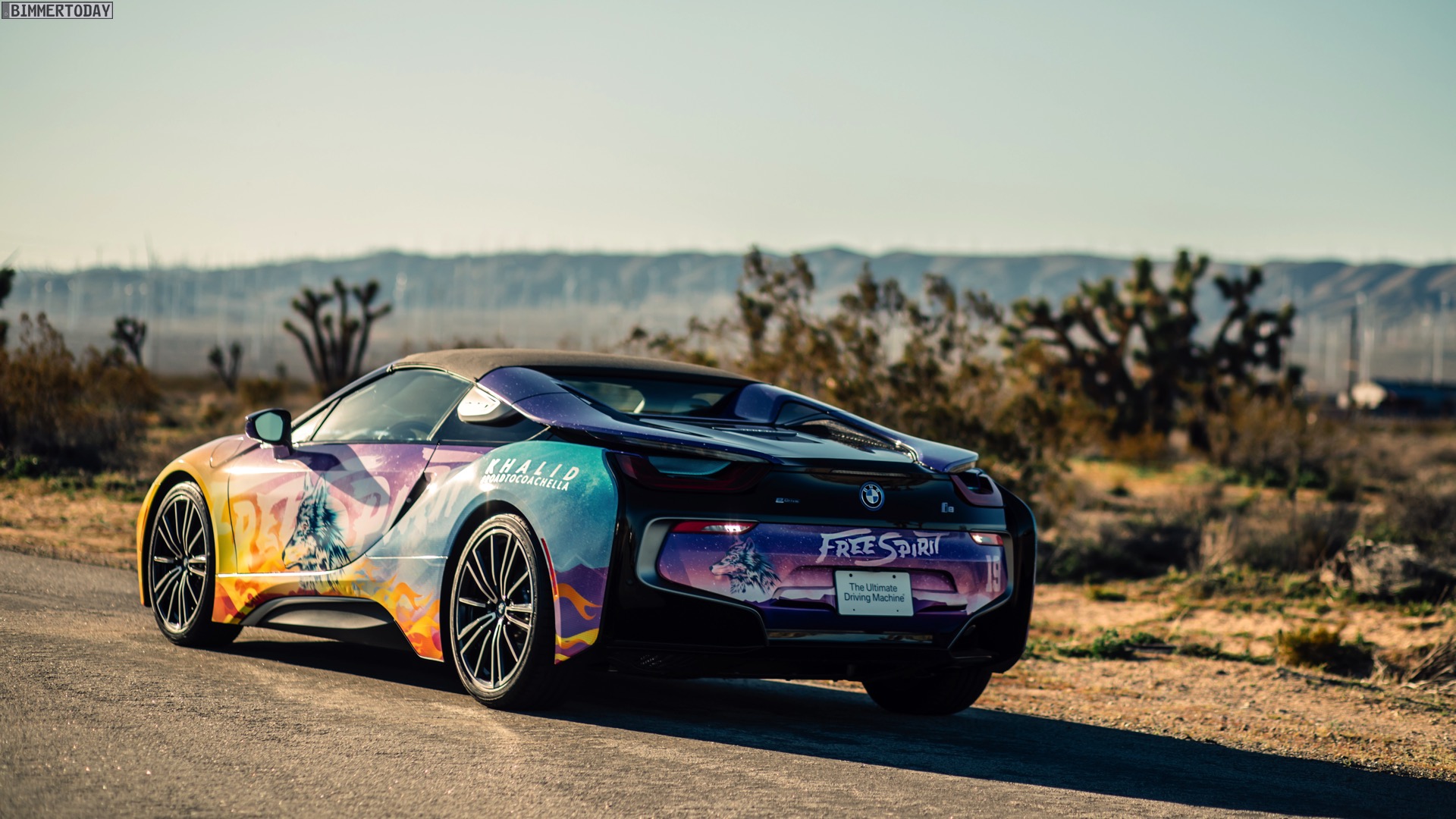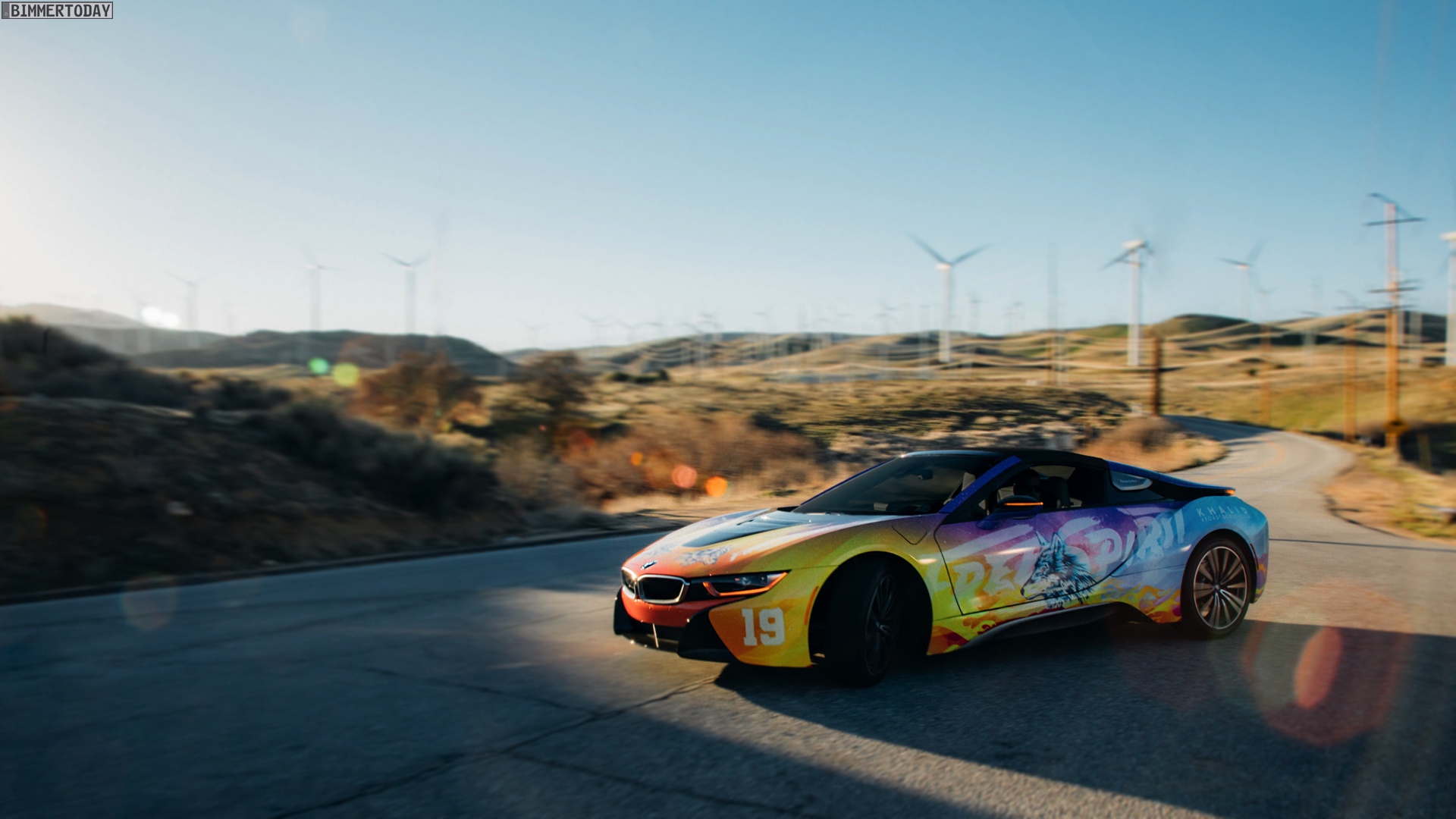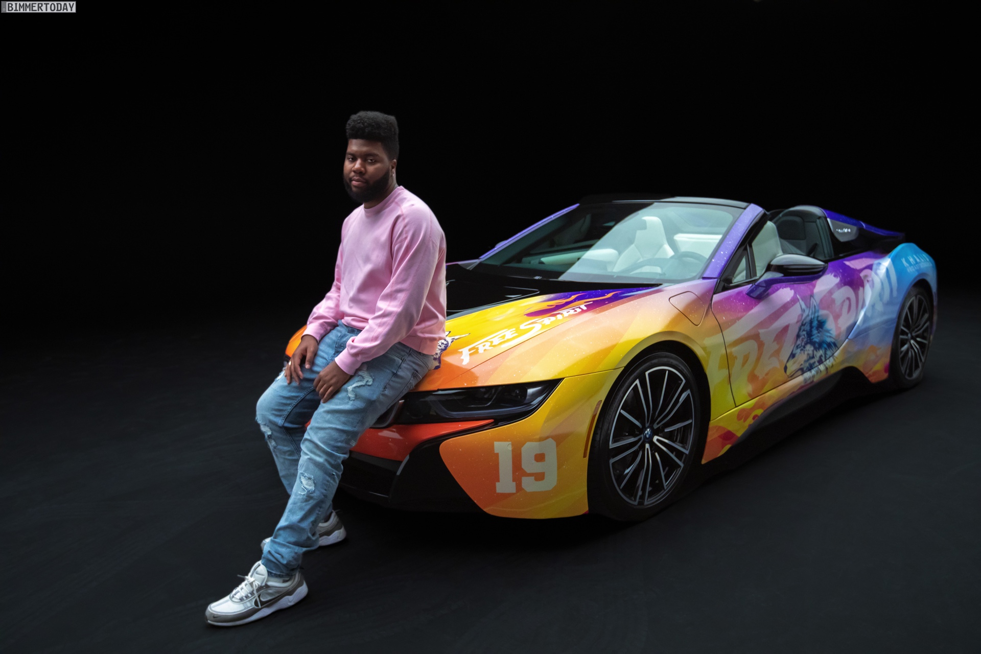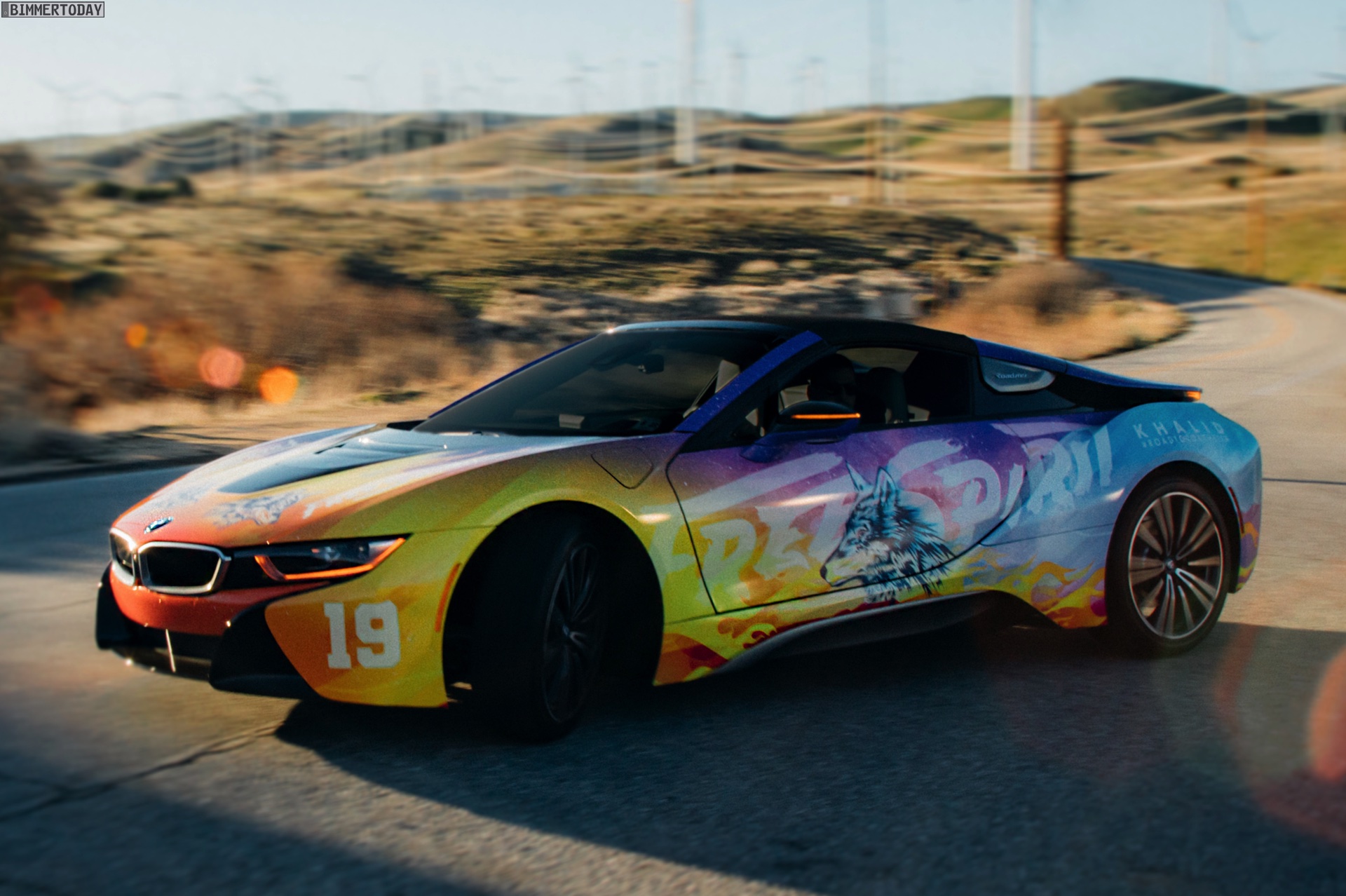 Fast wie ein offizielles BMW Art Car präsentiert sich der BMW i8 Roadster für Coachella Valley Music and Arts Festival 2019. Der offene Plug-in-Hybrid-Sportwagen trägt eine komplett von Soul-Sänger Khalid gestaltete und im wahrsten Sinne des Wortes knallbunte Außenhaut, die noch mehr Blicke auf den schon mit einfarbiger Lackierung äußerst vielbeachteten Roadster lenkt.