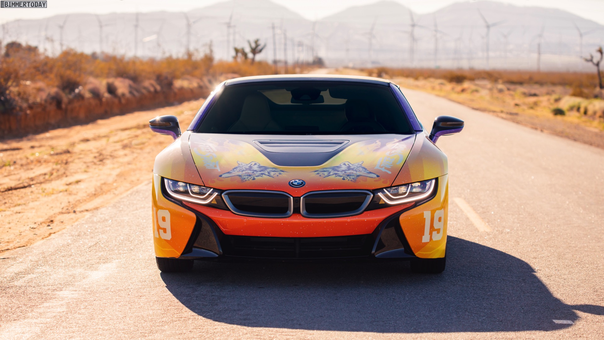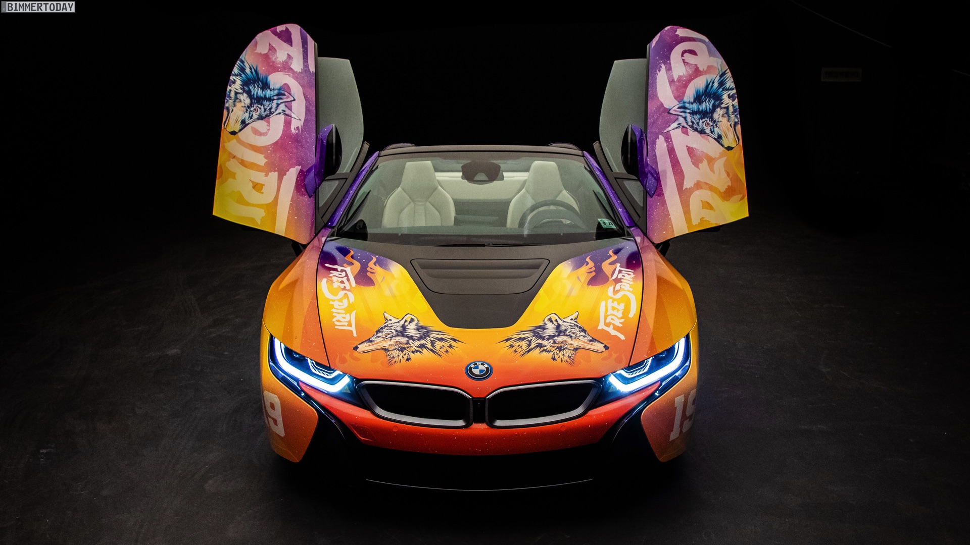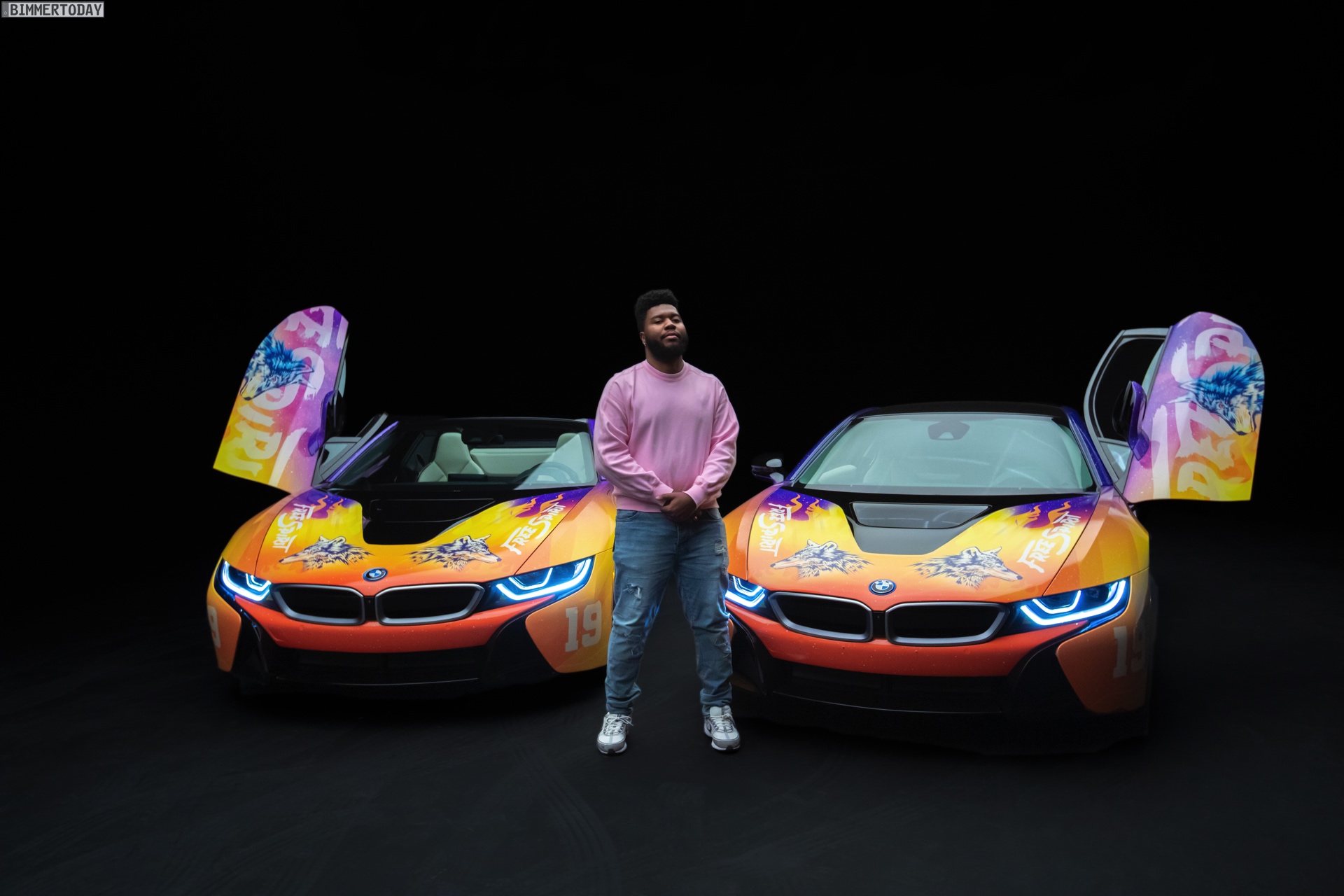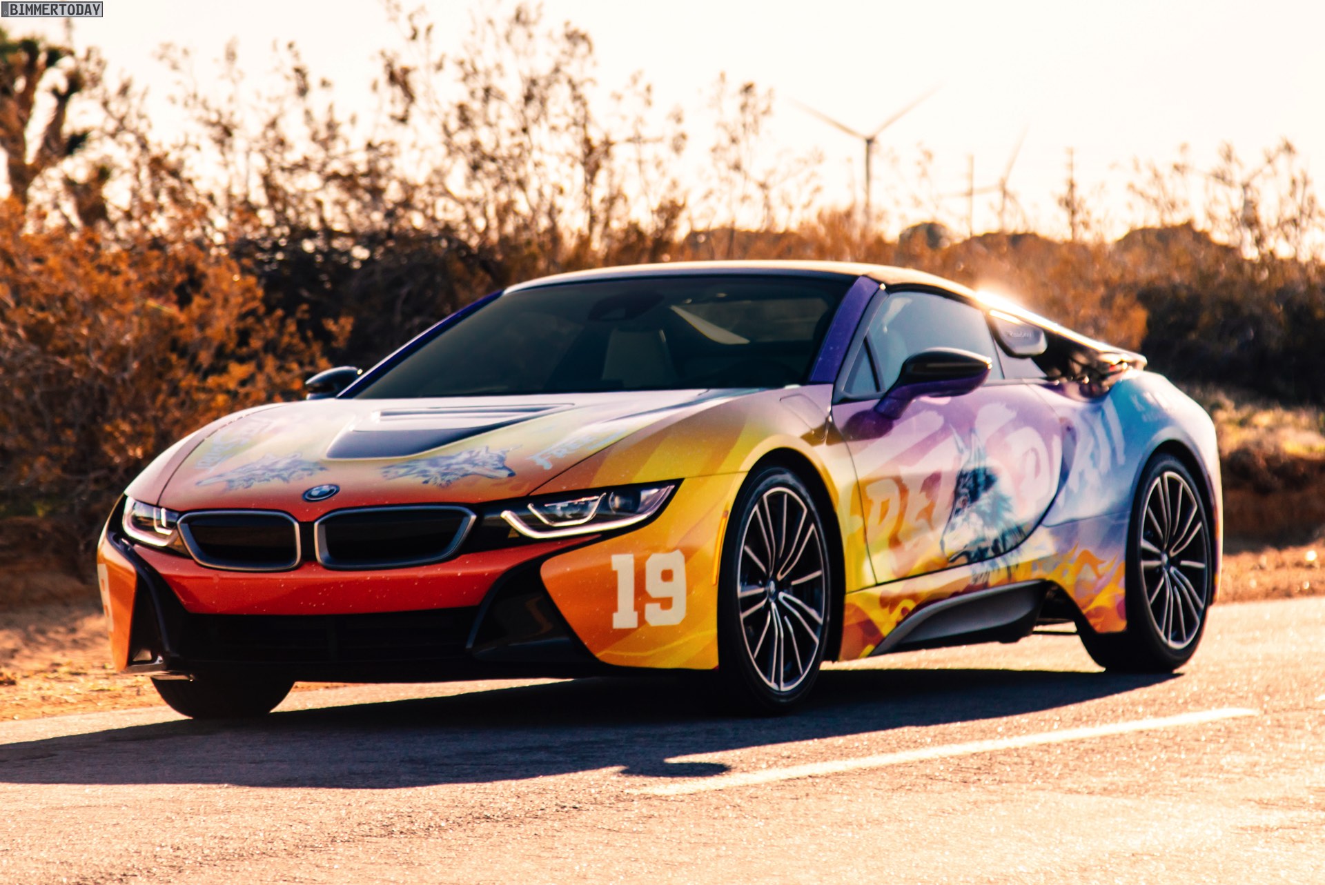 Fast wie ein offizielles BMW Art Car präsentiert sich der BMW i8 Roadster für Coachella Valley Music and Arts Festival 2019. Der offene Plug-in-Hybrid-Sportwagen trägt eine komplett von Soul-Sänger Khalid gestaltete und im wahrsten Sinne des Wortes knallbunte Außenhaut, die noch mehr Blicke auf den schon mit einfarbiger Lackierung äußerst vielbeachteten Roadster lenkt.