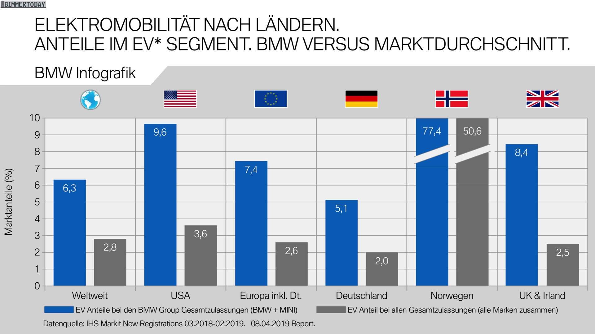 Die Nachfrage nach BMW mit Elektro- und Plug-in-Hybrid-Antrieb bewegt sich weiterhin auf hohem Niveau. Auch im März 2019 lagen die BMW-Marktanteile im EV-Segment deutlich über den Anteilen im Gesamtmarkt, was die frühe Entscheidung für ein breites Engagement im Bereich elektrifizierter Antriebe unübersehbar belohnt.