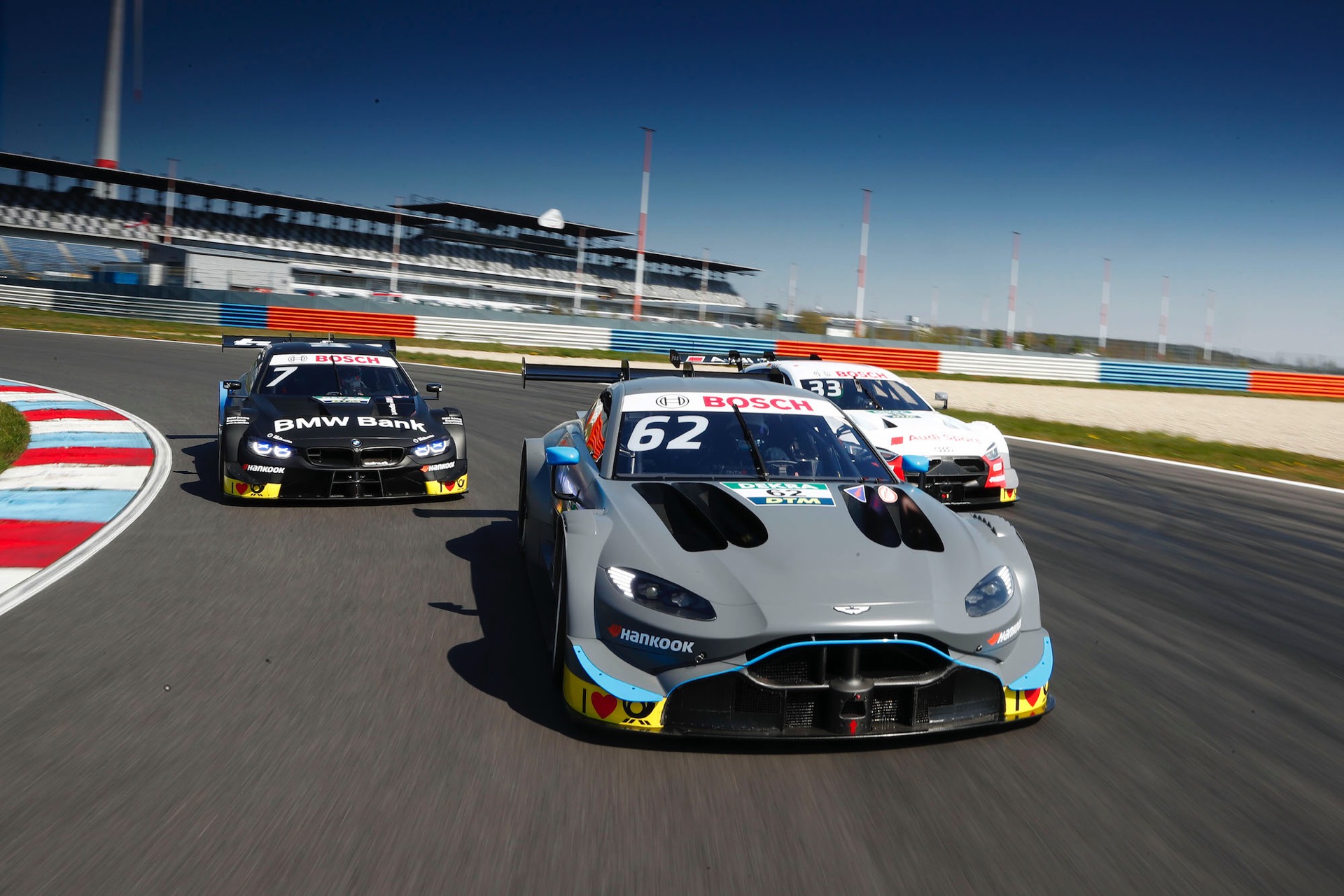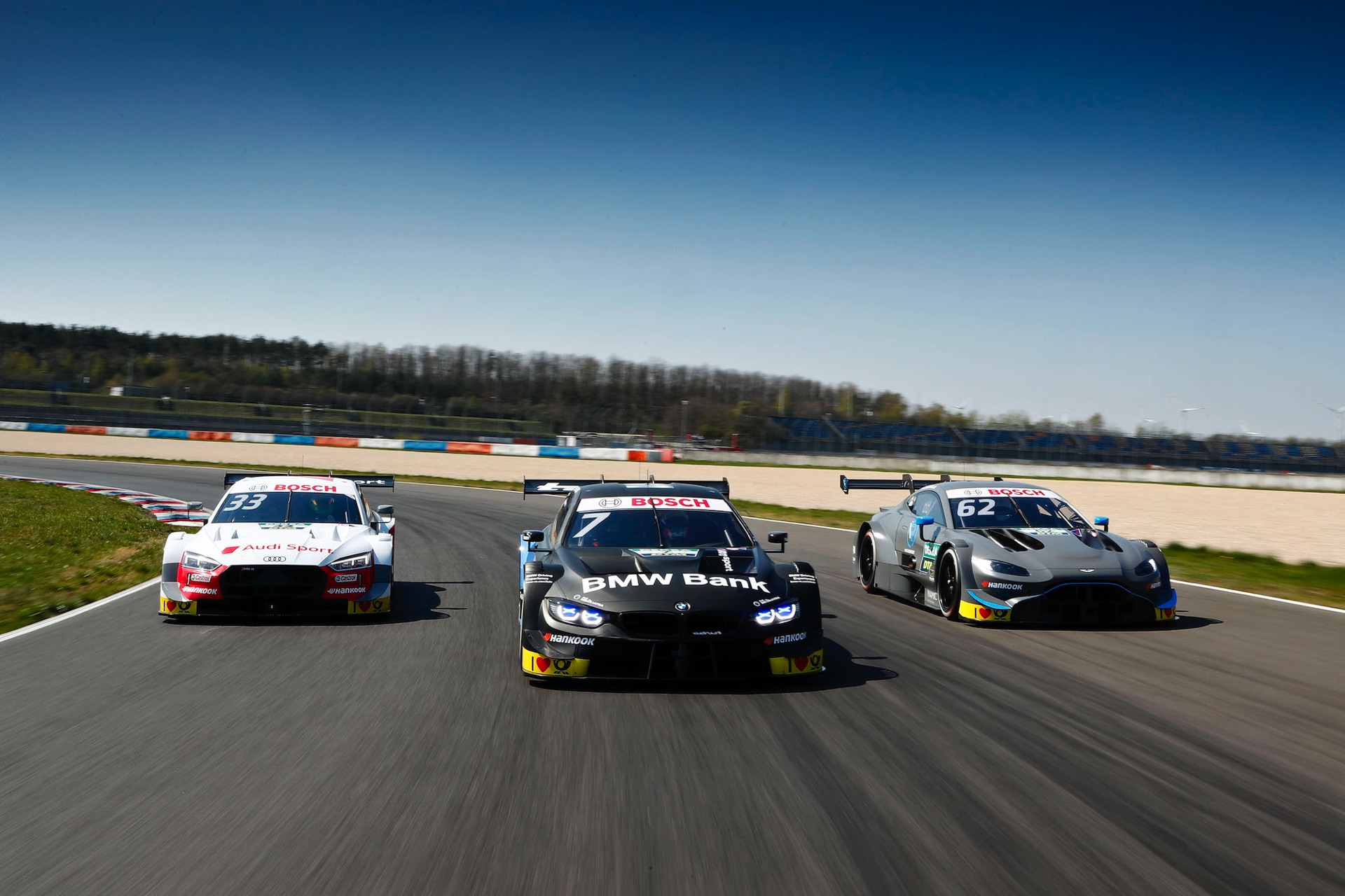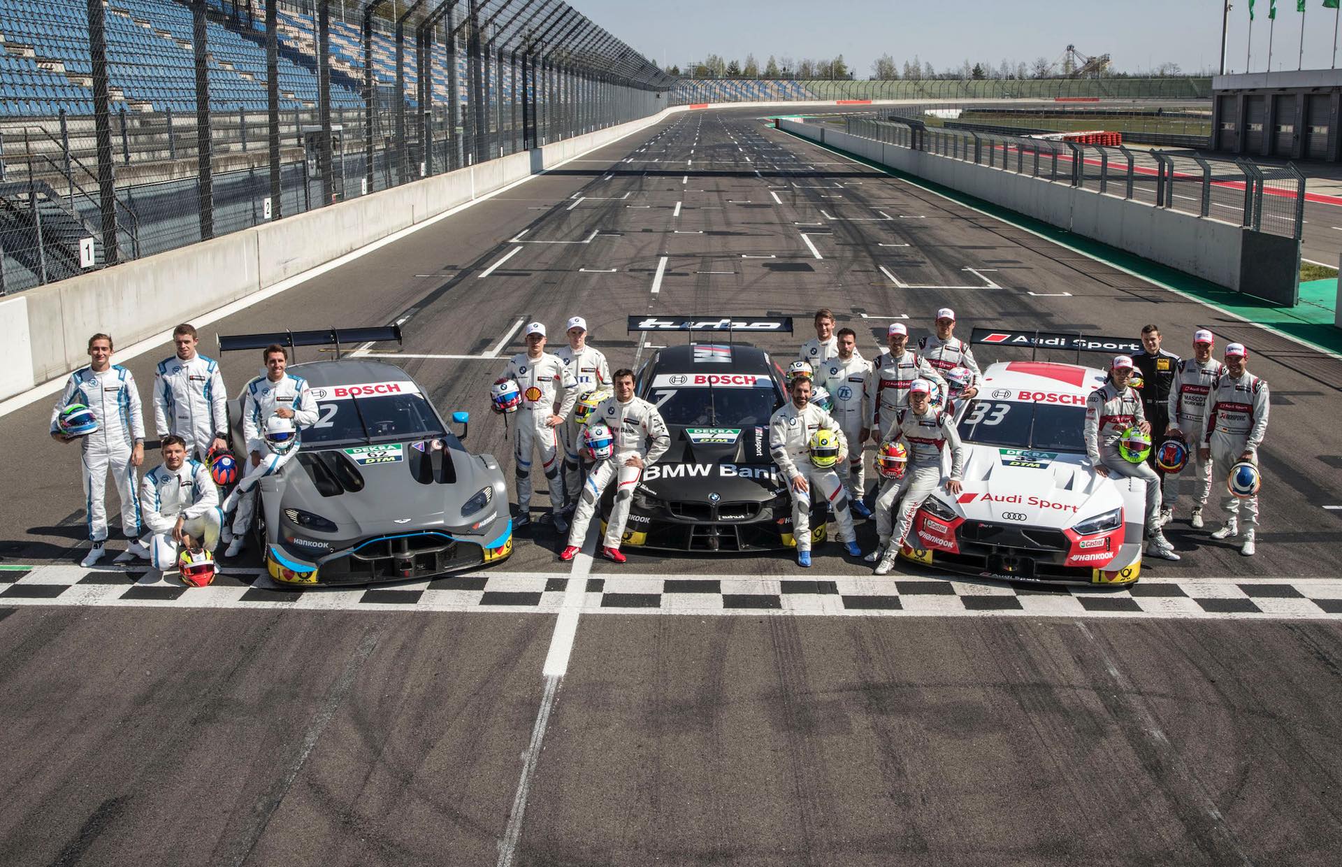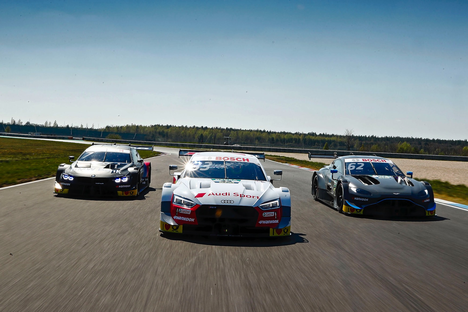Auf dem Lausitzring haben Aston Martin, Audi und BMW ihren ersten gemeinsamen DTM-Test mit ungetarnten Fahrzeugen der 2019er-Generation absolviert. Natürlich wurden die Testfahrten auch für ein Foto-Shooting genutzt, das die Fahrzeuge der drei Hersteller für die neue Saison Seite an Seite zeigt.