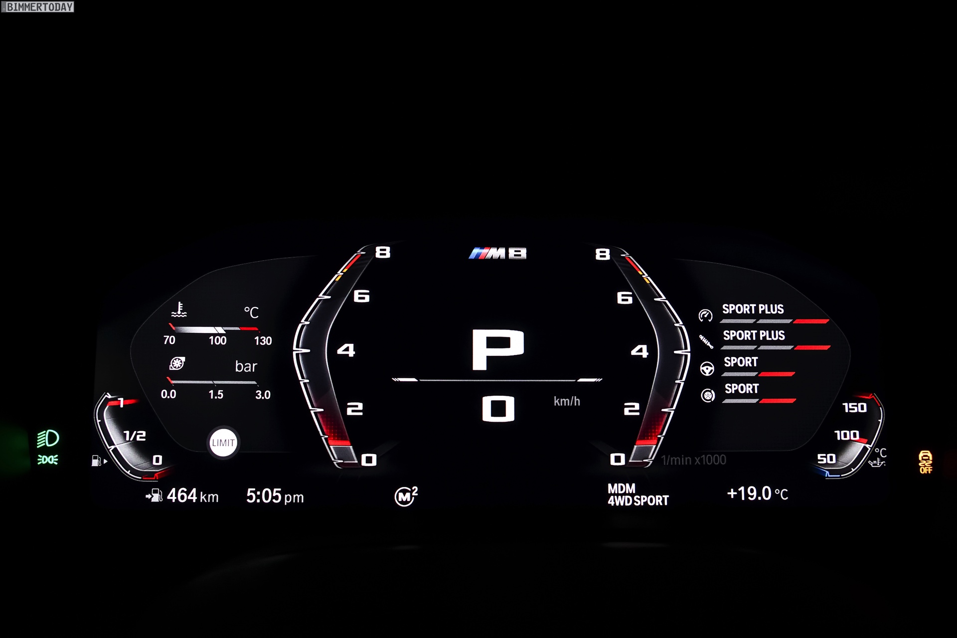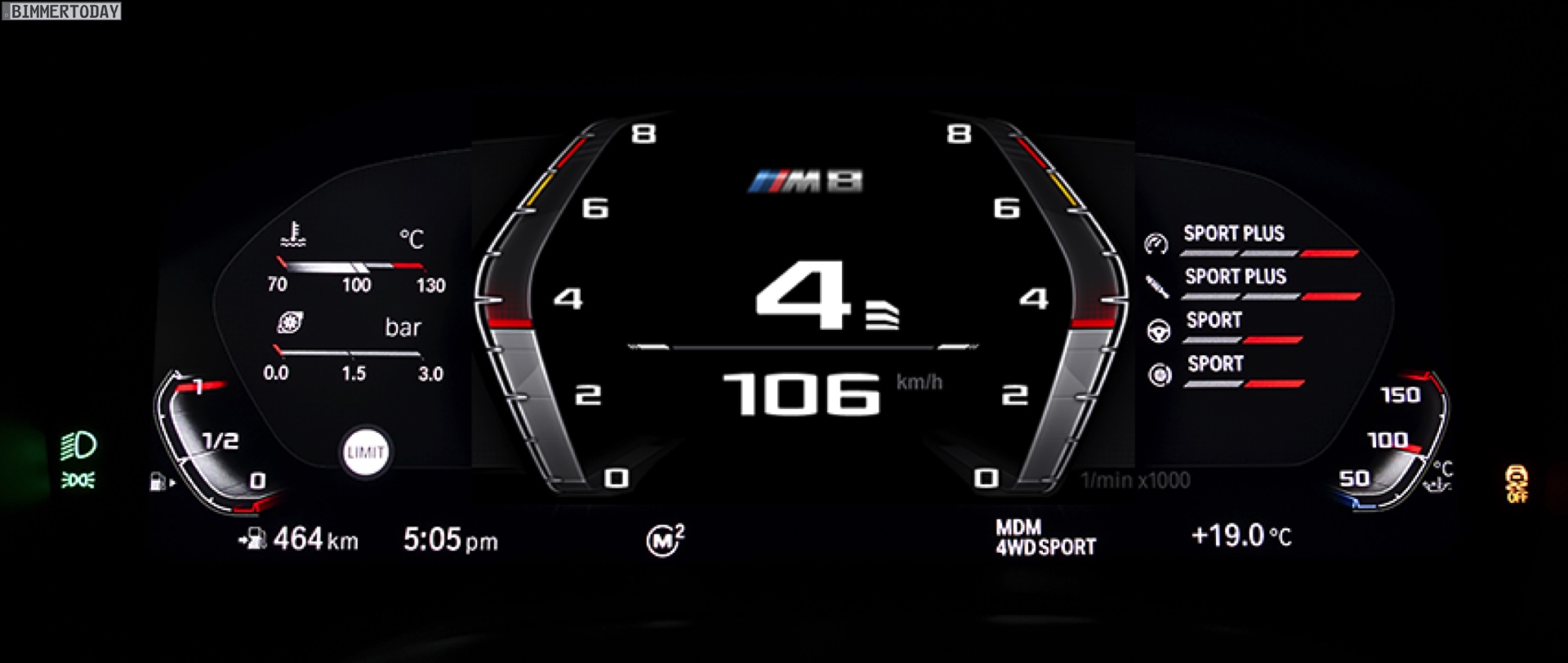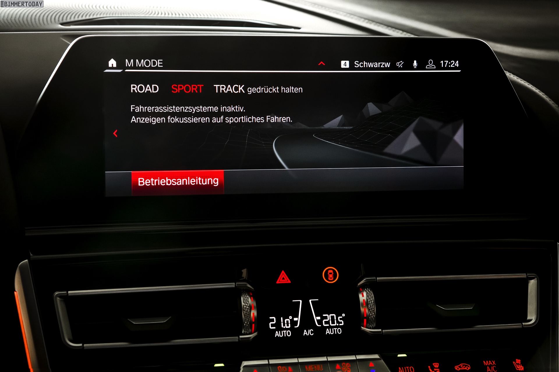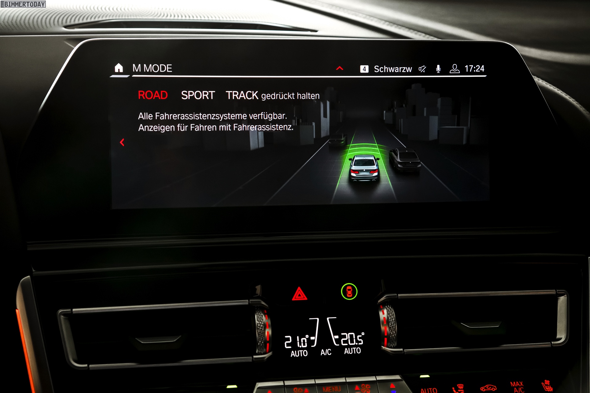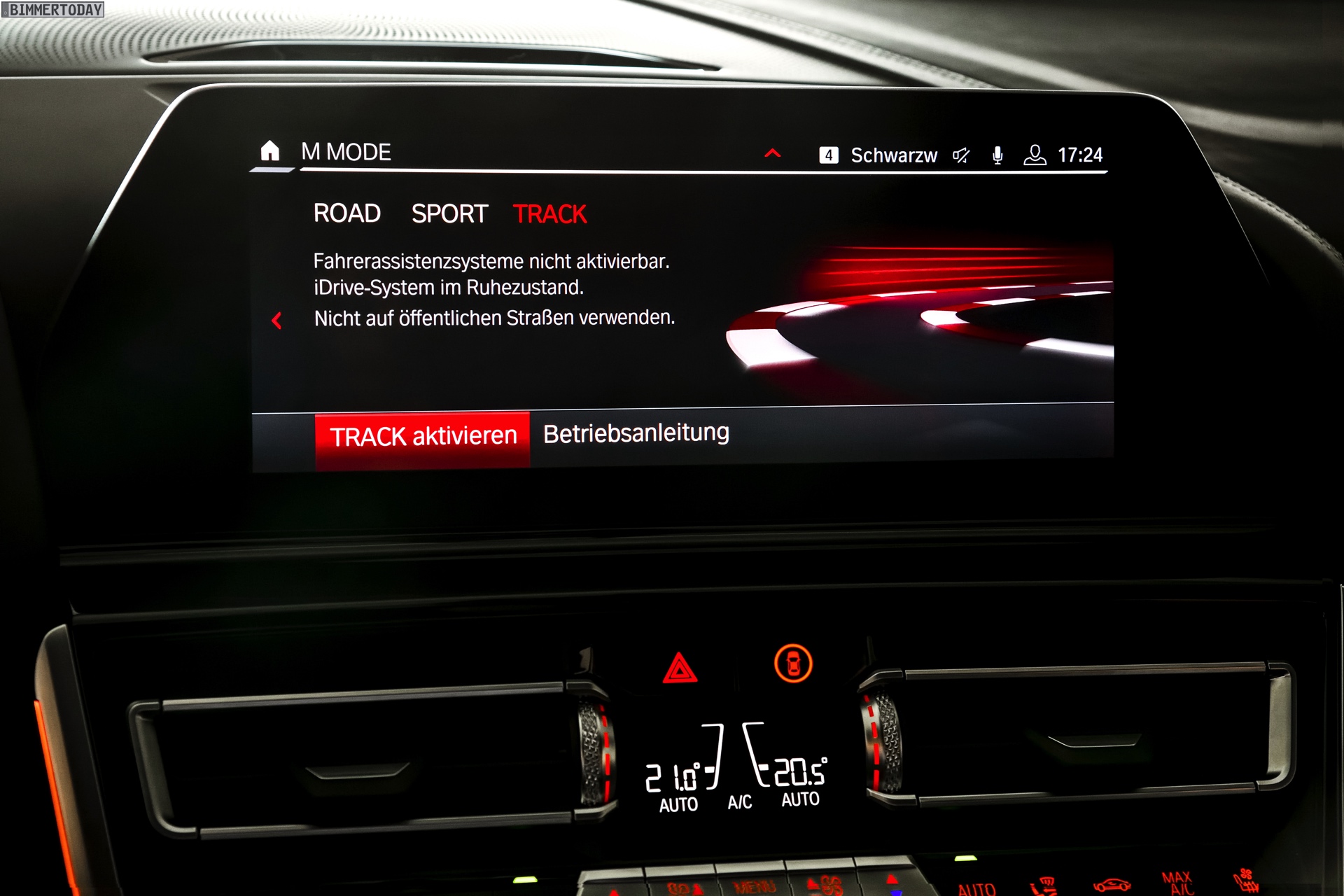 Immer zur Wahl stehen die Modi Road und Sport, im Fall der Competition-Modelle kommt der Track Mode hinzu. Letzterer wird durch einen langen Druck auf die M Mode-Taste aktiviert und konfiguriert den BMW M8 Competition für ambitionierte Rennstrecken-Fahrer: Alle Komfort- und Sicherheitssysteme sind deaktiviert, auch Sound- und Navigationssystem werden ausgeschaltet. Um die Aufmerksamkeit des Fahrers voll auf die Strecke zu lenken, ist das zentrale Infotainment-Display bei aktiviertem Track Mode stets vollkommen schwarz. Auch der M View Modus in Instrumenten- und Head-up-Display wird auf das Wesentlichste reduziert und verzichtet auf Angaben der Verkehrszeichenerkennung sowie eine Abstandsinformation zum Vordermann.