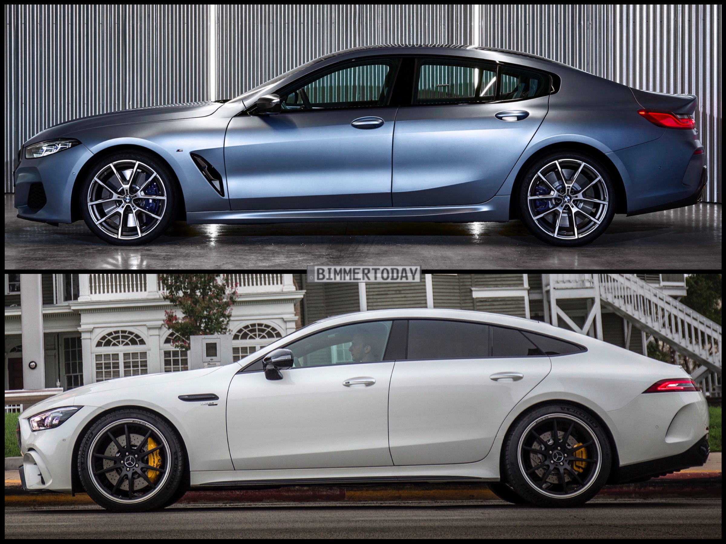 Mit dem neuen BMW 8er Gran Coupé erhält auch das Mercedes-AMG GT 4-Türer Coupé einen neuen Rivalen. Unser Bild-Vergleich zeigt die beiden viertürigen Coupés mit ausgesprochen sportlicher Positionierung Seite an Seite. Den 8er sehen wir mangels anderer Bilder als BMW M850i, abgesehen von den Details in Cerium Grey kann aber auch jede andere Motorisierung mit dem M Sportpaket auf den gleichen optischen Stand gebracht werden. Den Schwaben sehen wir als Mercedes-AMG GT 53 4Matic+ 4-Türer Coupé, also der mittleren Motorisierung.