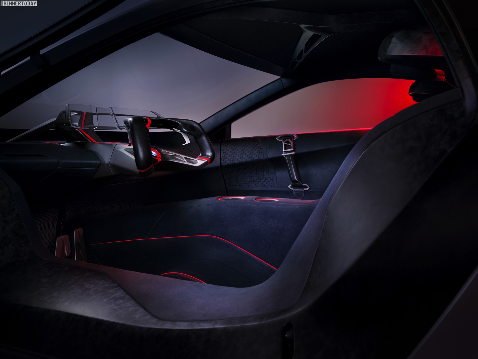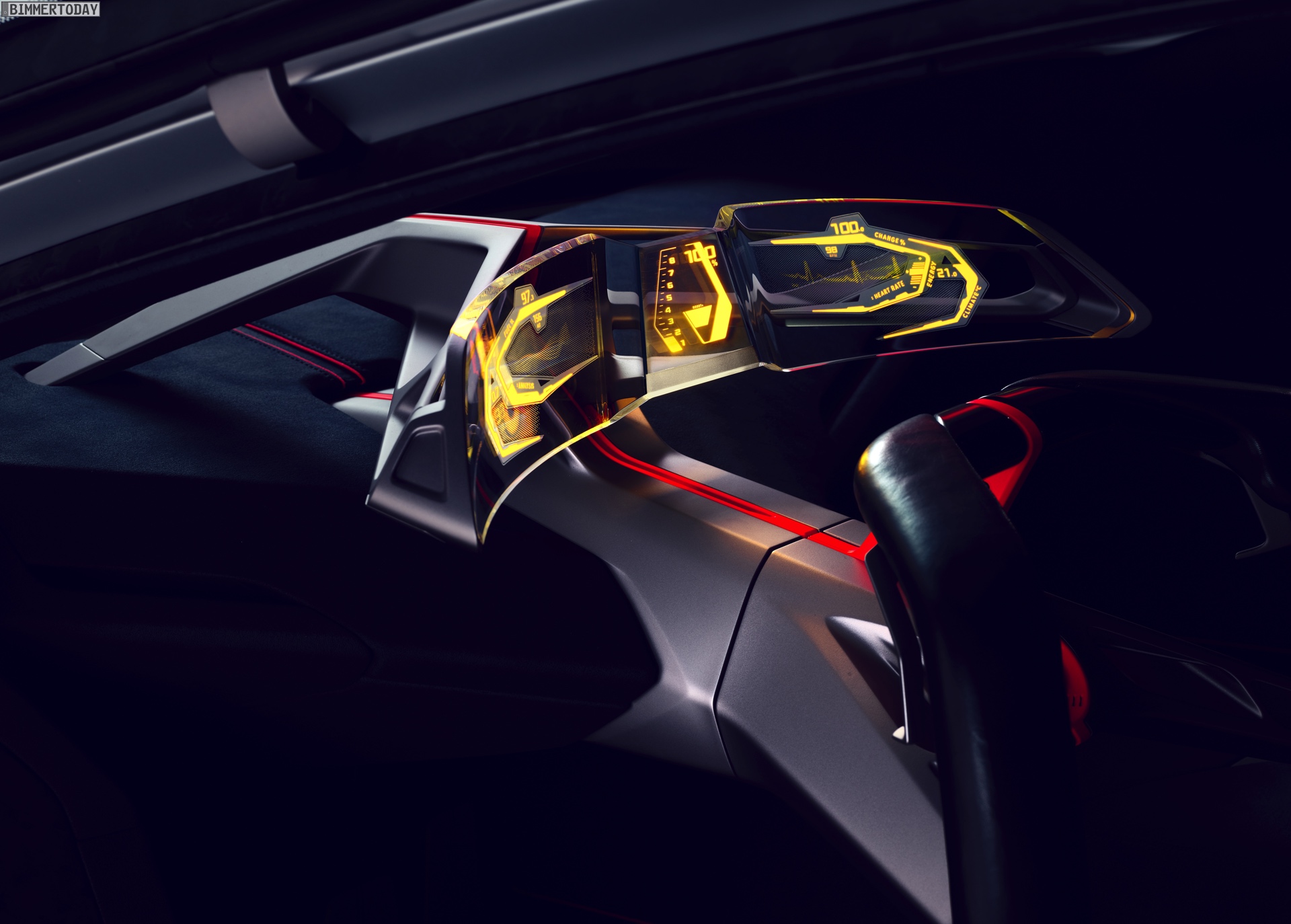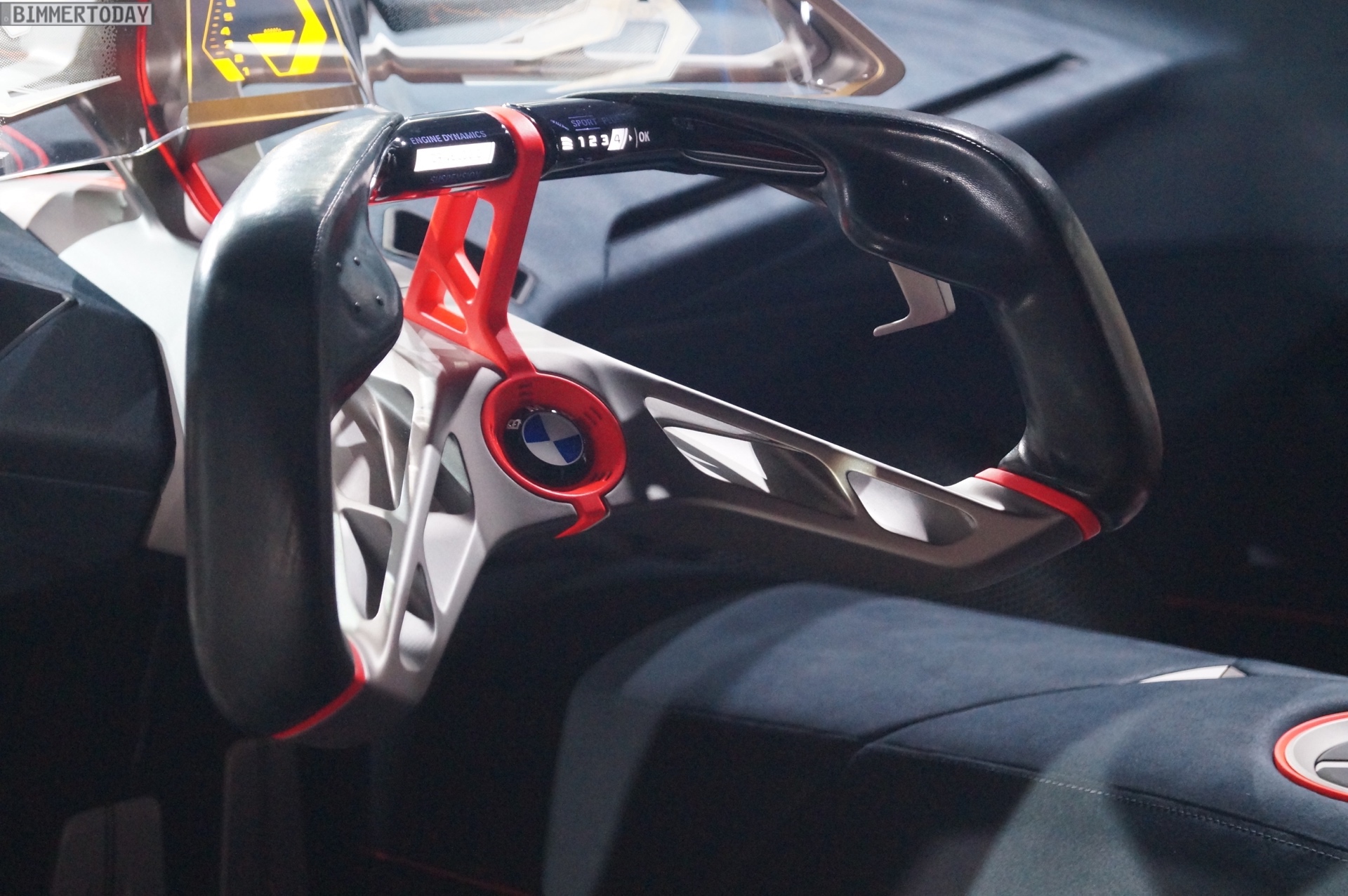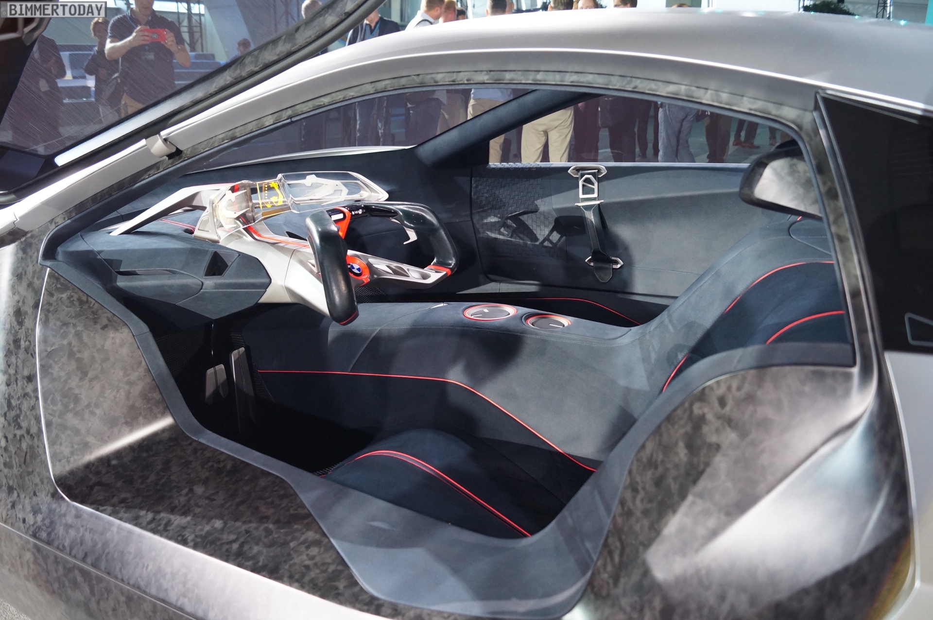 Im Innenraum steht ganz klar der Fahrer im Fokus. Sein Gesicht entriegelt den Sportwagen wenn er sich nähert, eine Berührung der Flügeltüren ebnet den Weg ins Cockpit. Zwei Sportsitze und eine konsequent auf das Wesentliche reduzierte Formensprache lenken die Aufmerksamkeit des Fahrers auf die Straße. Alle für die aktuelle Fahrsituation relevanten Informationen sieht er in einem vollflächig in die Frontscheibe integrierten Augmented-Reality Head-up-Display – was zumindest aus heutiger Sicht nach Zukunftsmusik klingt. Aber so ähnlich klang es auch, als BMW 2009 erstmals von einem Hybrid-Sportwagen mit Dreizylinder-Motor erzählte, der es auf 2 Liter Normverbrauch bringt.