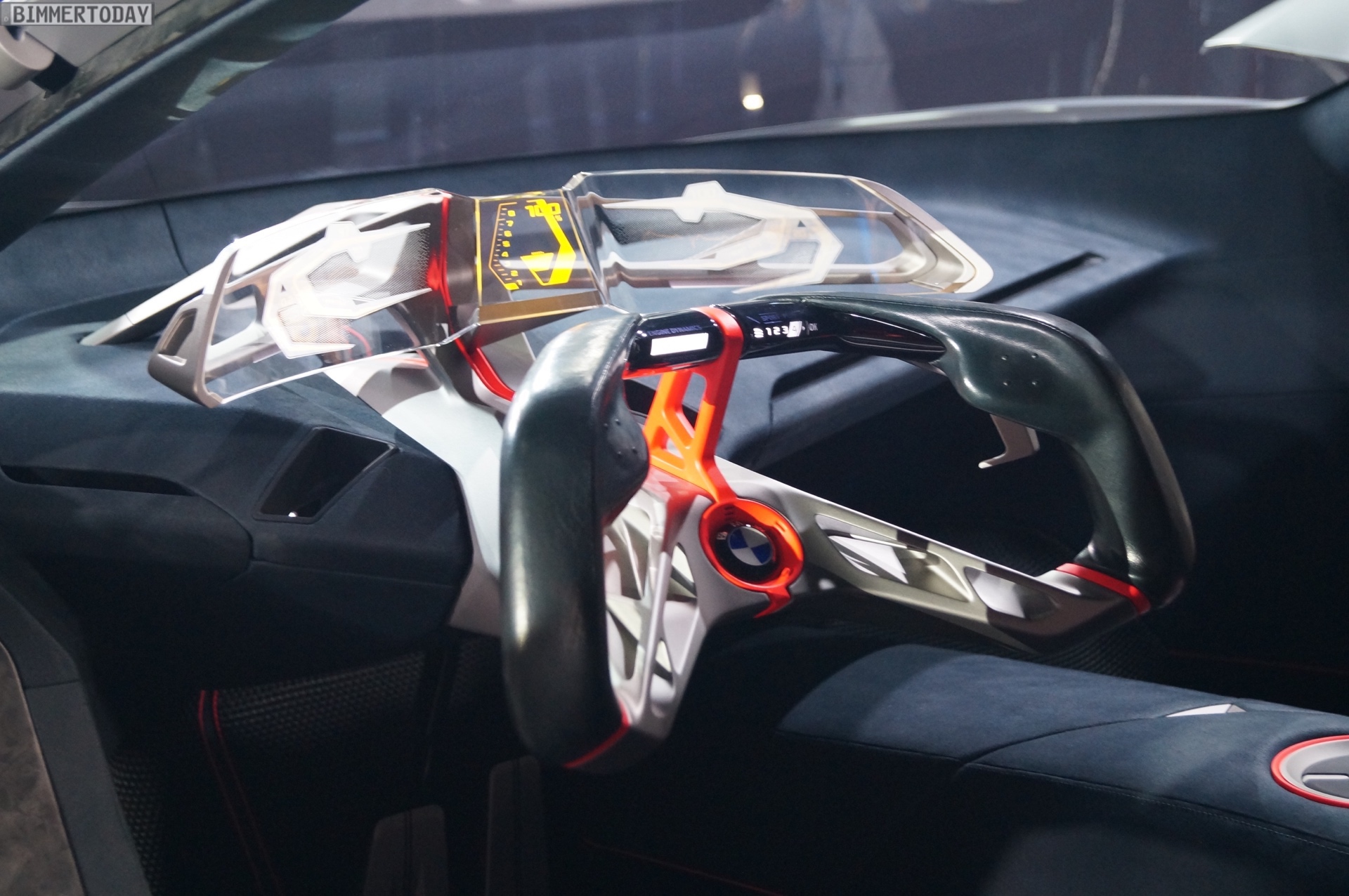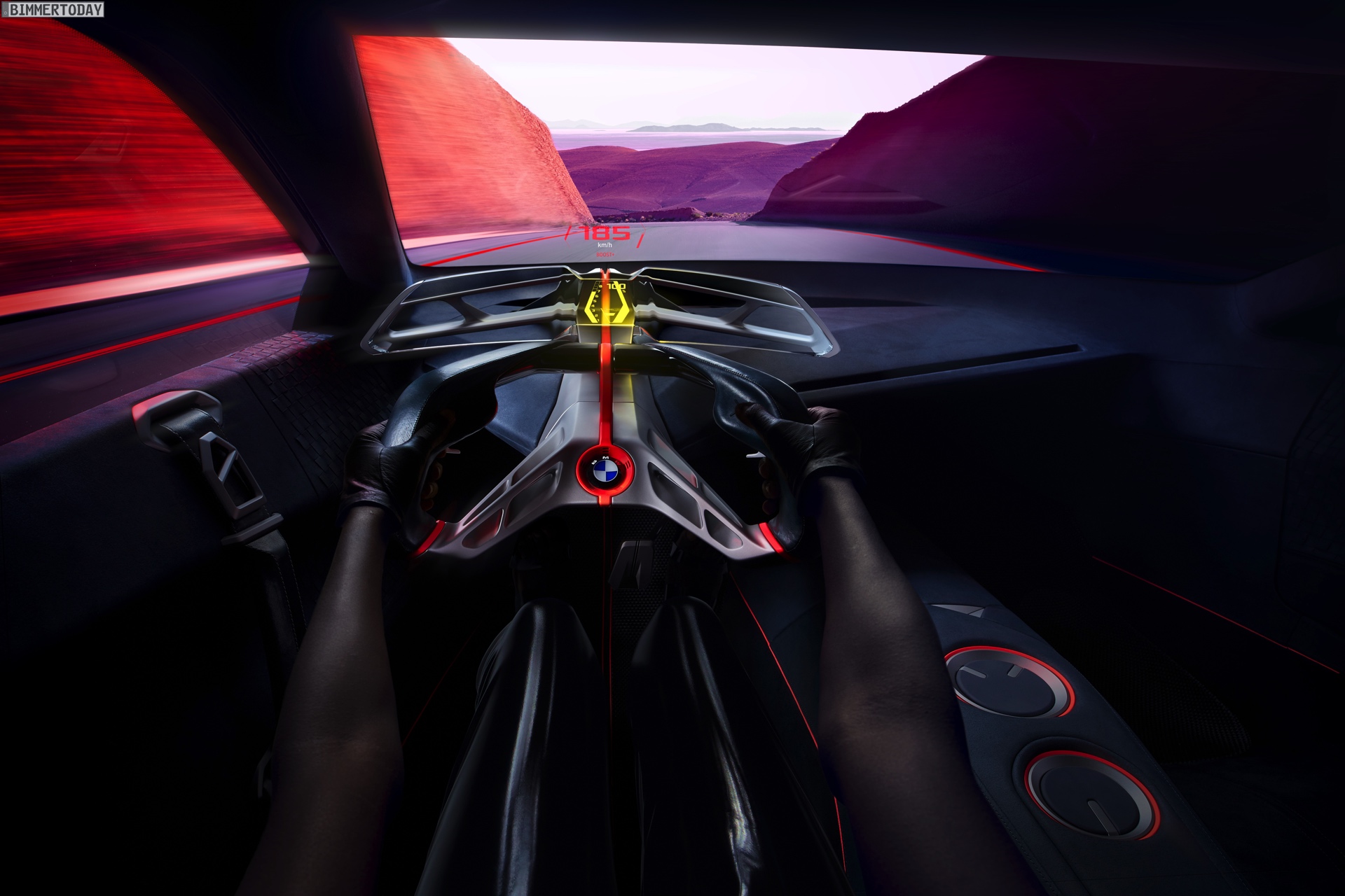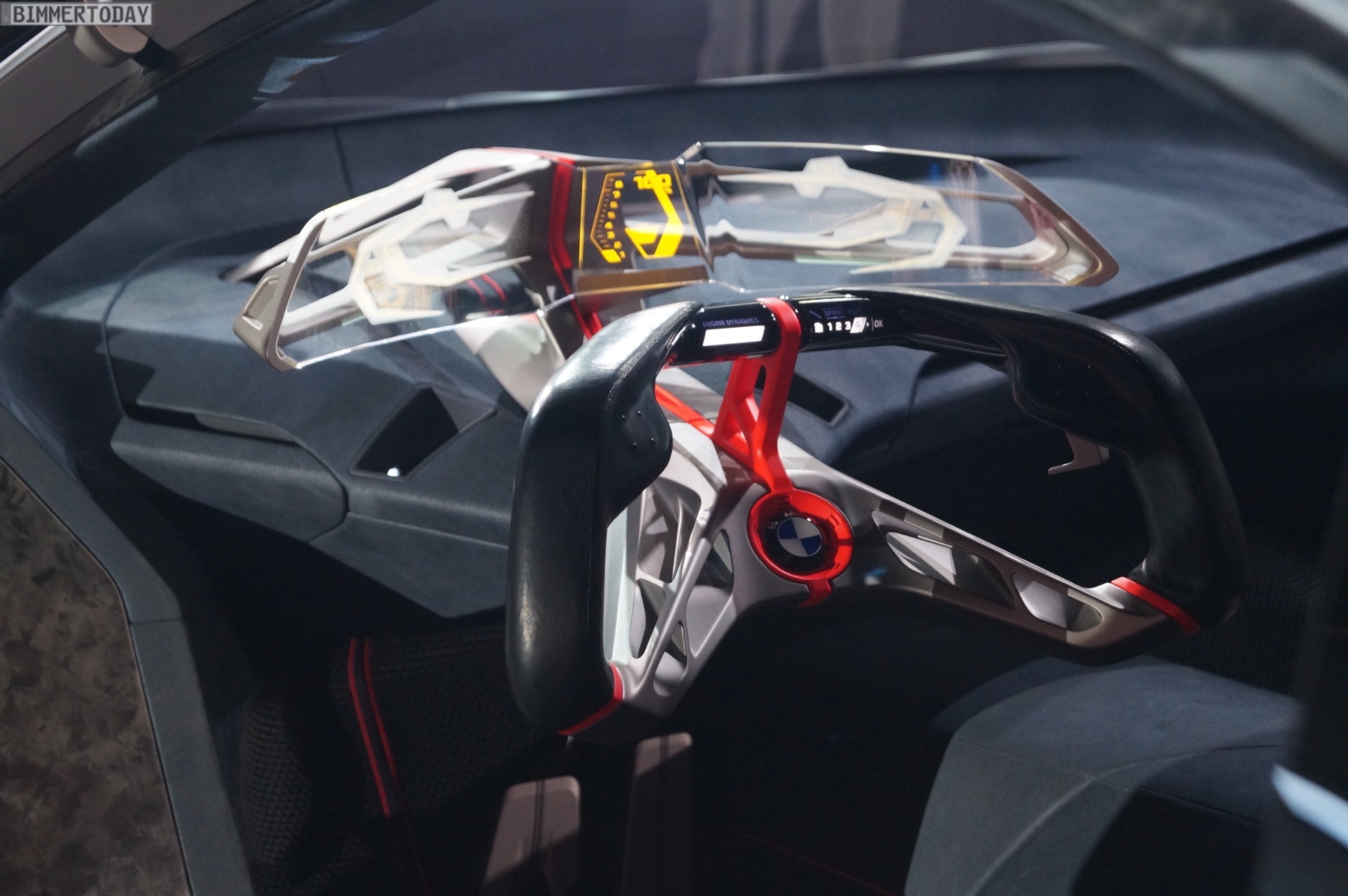 Im Innenraum steht ganz klar der Fahrer im Fokus. Sein Gesicht entriegelt den Sportwagen wenn er sich nähert, eine Berührung der Flügeltüren ebnet den Weg ins Cockpit. Zwei Sportsitze und eine konsequent auf das Wesentliche reduzierte Formensprache lenken die Aufmerksamkeit des Fahrers auf die Straße. Alle für die aktuelle Fahrsituation relevanten Informationen sieht er in einem vollflächig in die Frontscheibe integrierten Augmented-Reality Head-up-Display – was zumindest aus heutiger Sicht nach Zukunftsmusik klingt. Aber so ähnlich klang es auch, als BMW 2009 erstmals von einem Hybrid-Sportwagen mit Dreizylinder-Motor erzählte, der es auf 2 Liter Normverbrauch bringt.