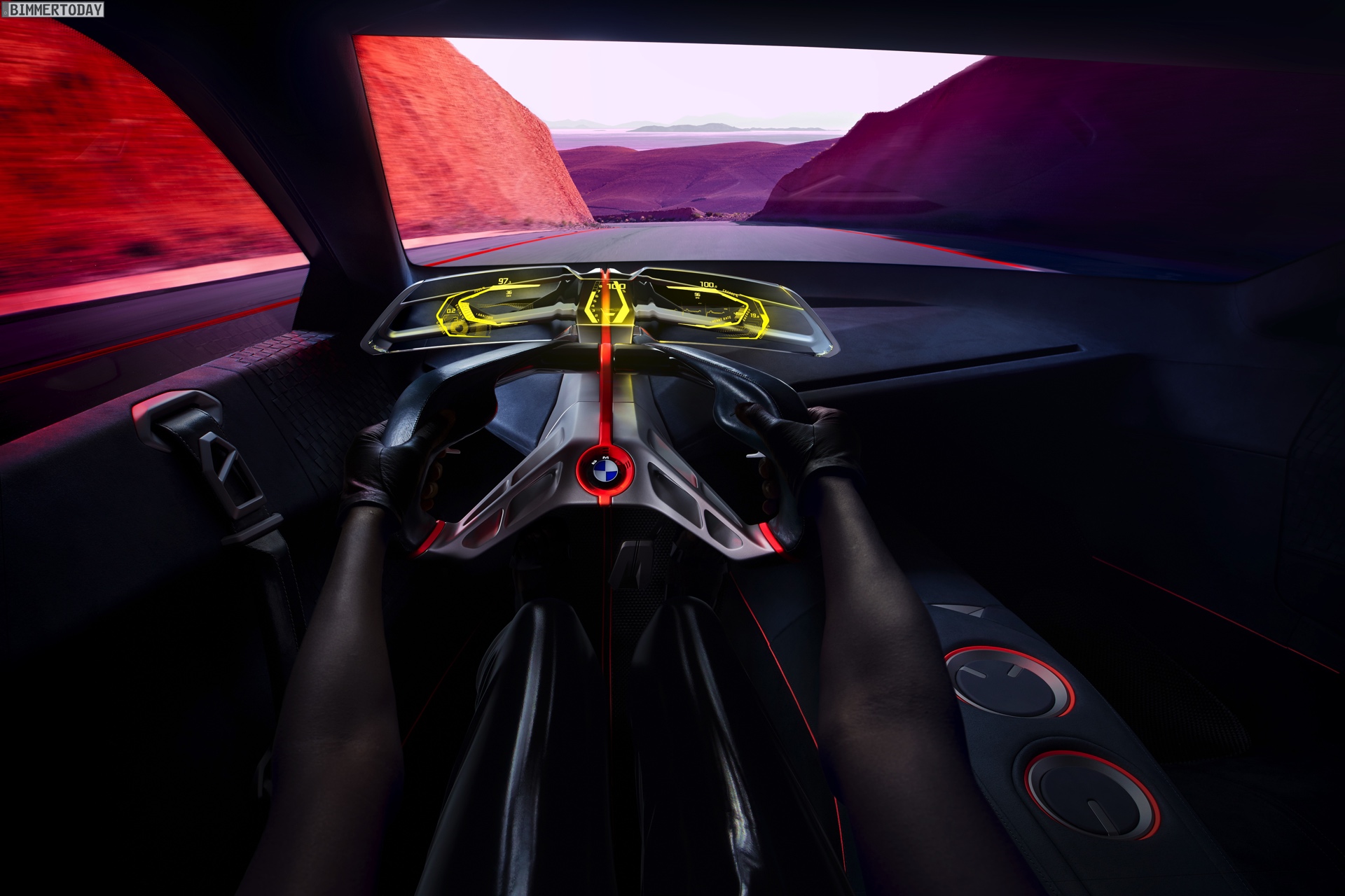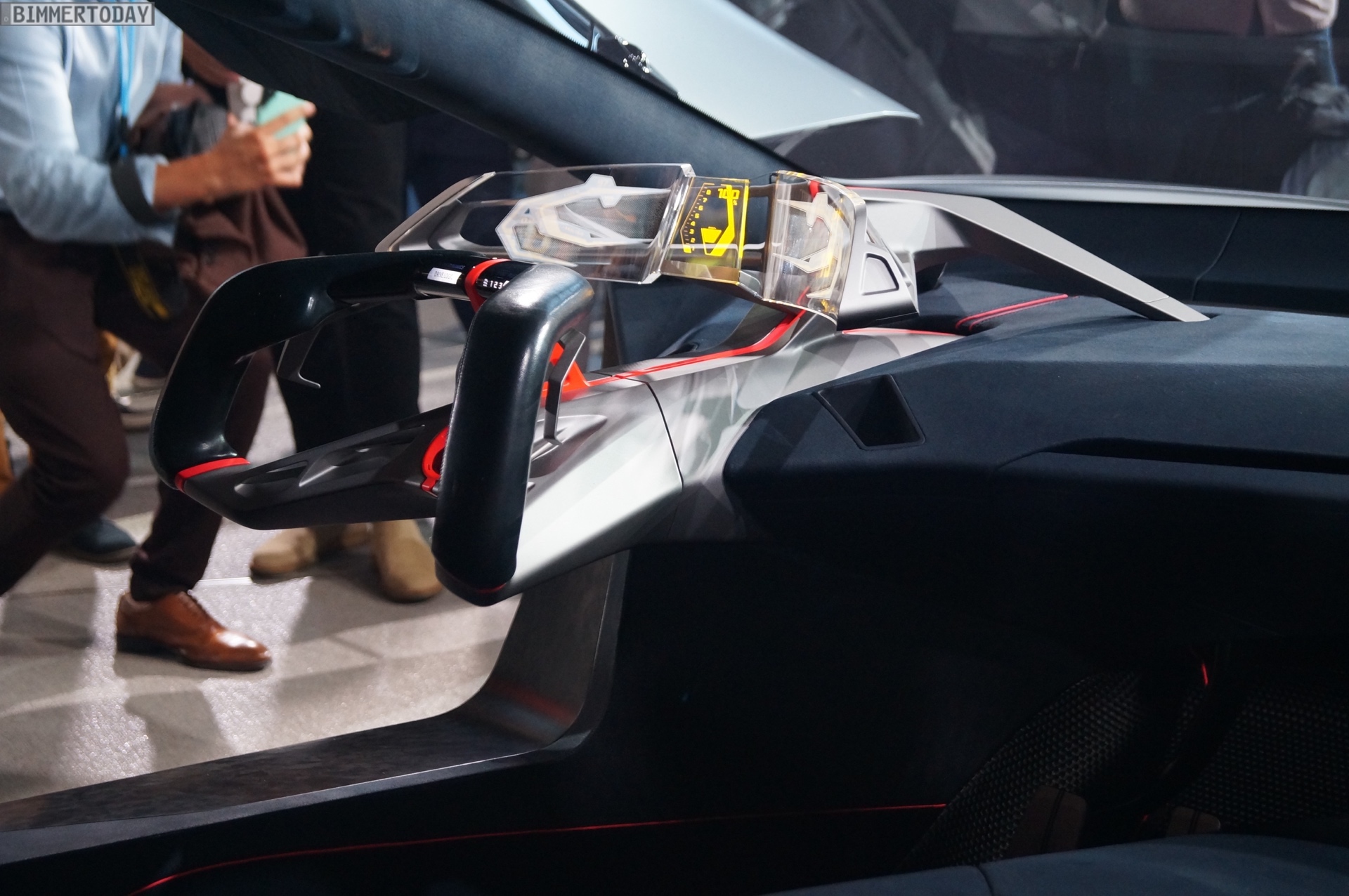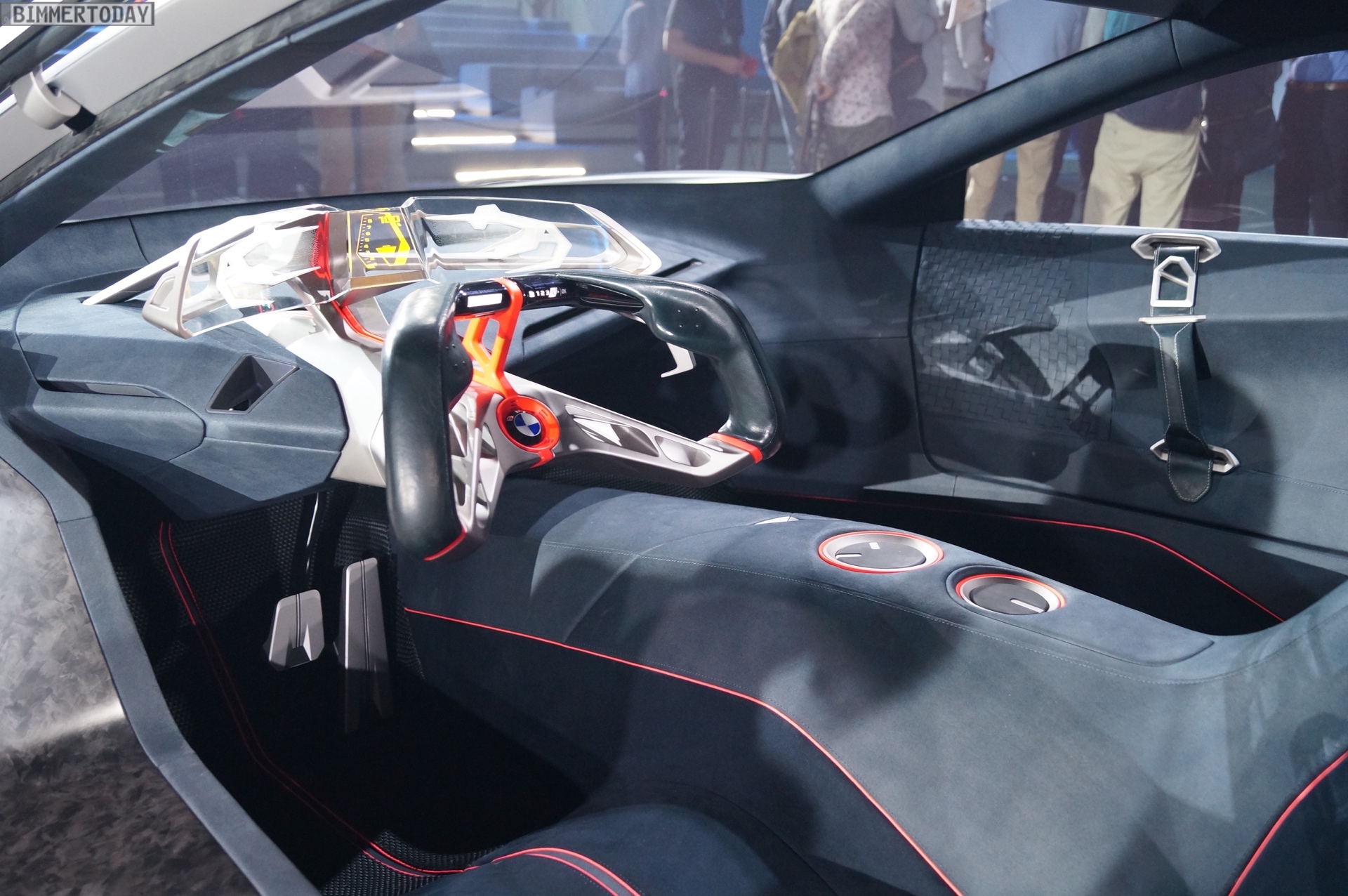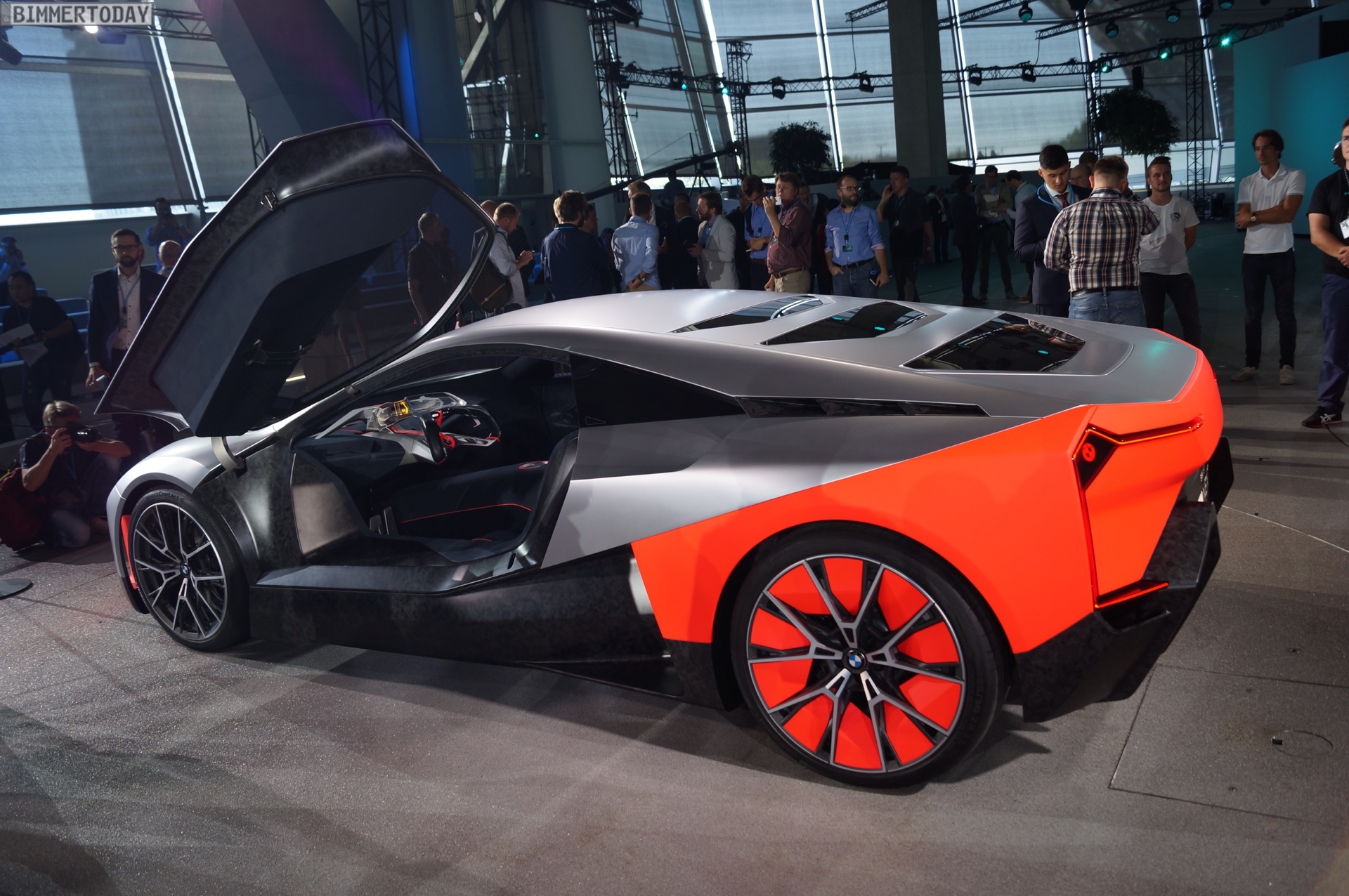 Im Innenraum steht ganz klar der Fahrer im Fokus. Sein Gesicht entriegelt den Sportwagen wenn er sich nähert, eine Berührung der Flügeltüren ebnet den Weg ins Cockpit. Zwei Sportsitze und eine konsequent auf das Wesentliche reduzierte Formensprache lenken die Aufmerksamkeit des Fahrers auf die Straße. Alle für die aktuelle Fahrsituation relevanten Informationen sieht er in einem vollflächig in die Frontscheibe integrierten Augmented-Reality Head-up-Display – was zumindest aus heutiger Sicht nach Zukunftsmusik klingt. Aber so ähnlich klang es auch, als BMW 2009 erstmals von einem Hybrid-Sportwagen mit Dreizylinder-Motor erzählte, der es auf 2 Liter Normverbrauch bringt.