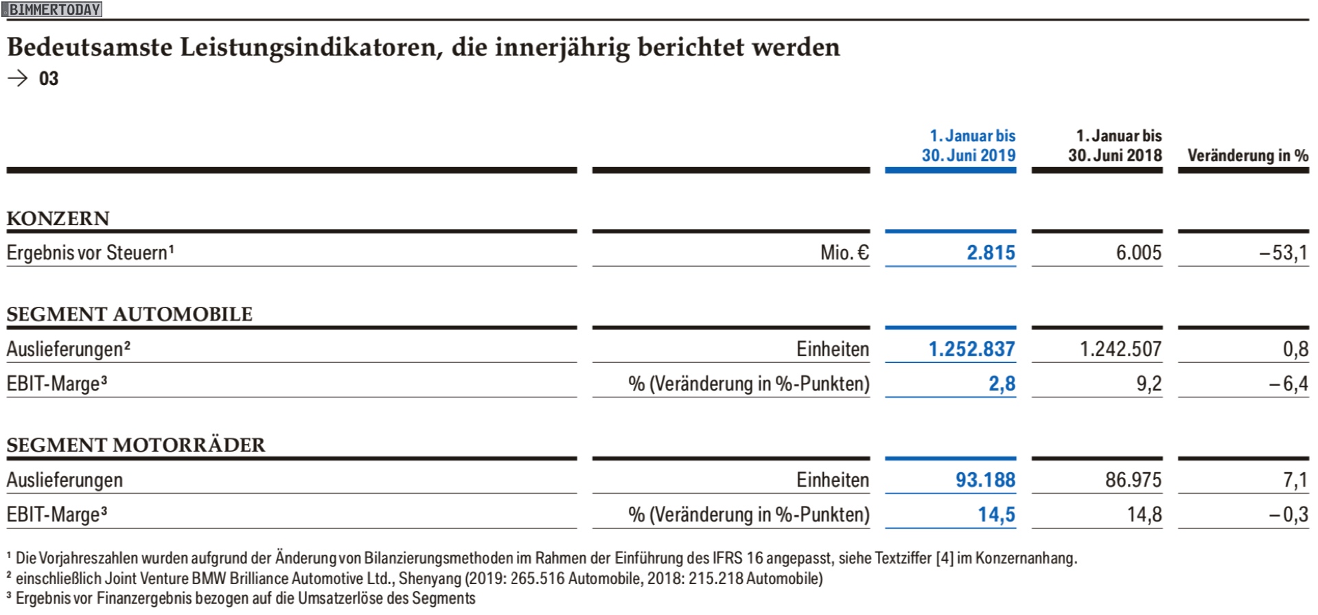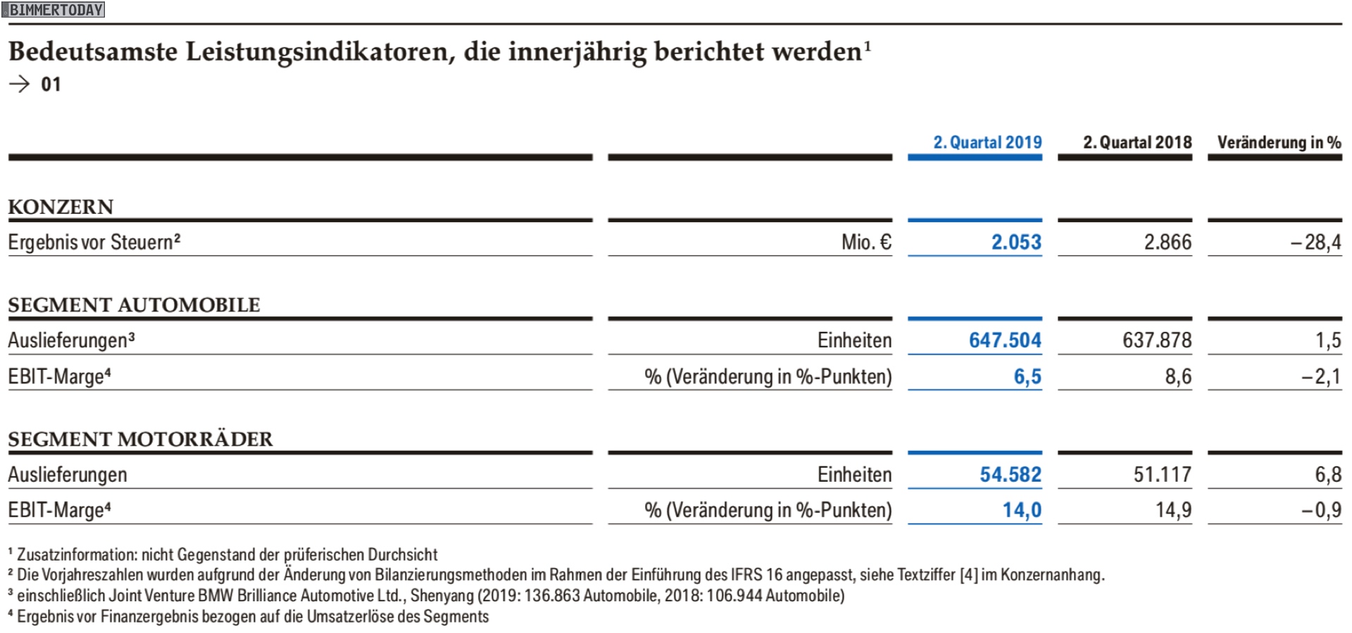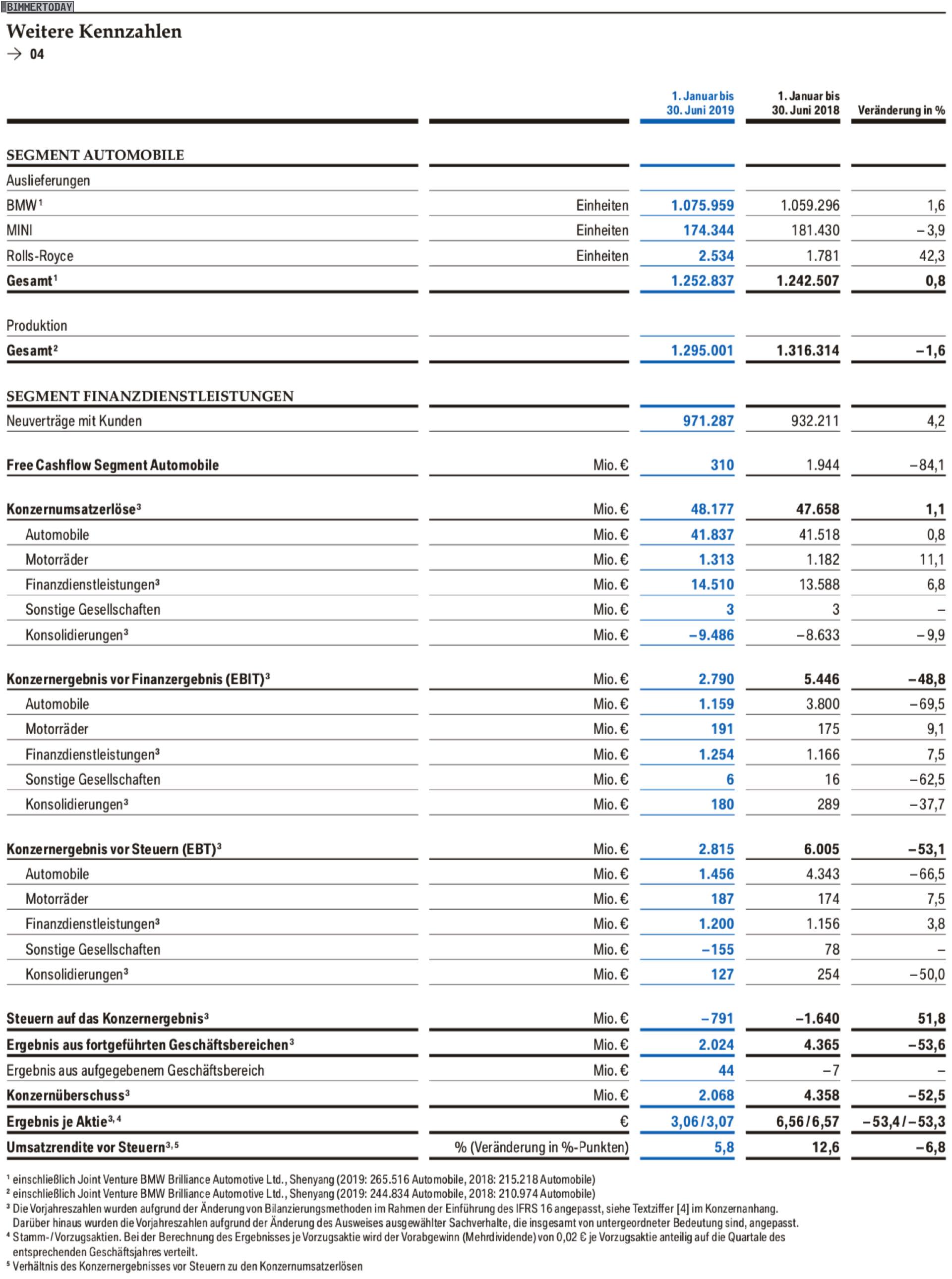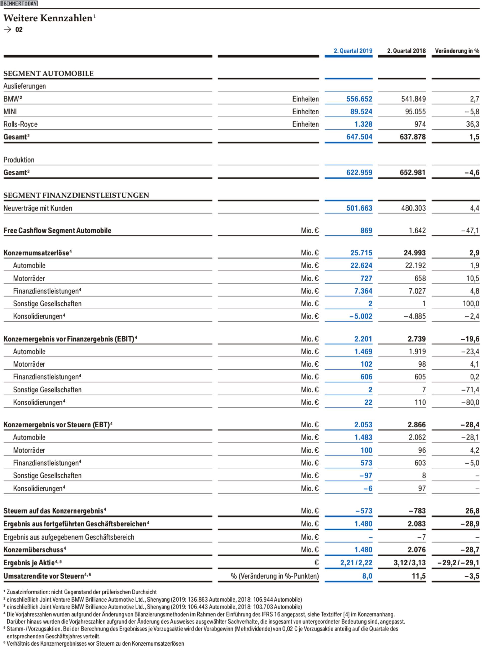 Basis der vergleichsweise starken, aber keineswegs rosaroten Zahlen ist die erneute Absatz-Steigerung. Im zweiten Quartal 2019 konnten die Verkäufe im Vergleich zum Vorjahr um 1,5 Prozent auf 647.504 BMW, MINI und Rolls-Royce gesteigert werden. Der Umsatz stieg dabei um 2,9 Prozent auf 25,715 Milliarden Euro. Das Ergebnis vor Finanzergebnis (EBIT) lag bei 2,2 Milliarden Euro und damit deutliche 19,6 Prozent unter dem Vorjahr. Insgesamt konnte der Konzern in Q2 2019 einen Überschuss von 1,48 Milliarden Euro erwirtschaften.