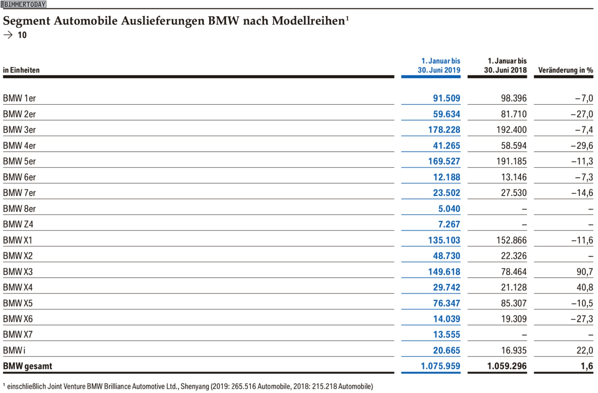 Beim Blick auf den weltweiten Absatz einzelner Baureihen stechen im ersten Halbjahr 2019 erneut die X-Modelle hervor. Der BMW X3 konnte dank größerer Produktions-Kapazitäten um 90,7 Prozent auf 149.618 Einheiten zulegen und ist damit hinter 3er und 5er die drittwichtigste Baureihe. Knapp dahinter folgt mit dem BMW X1 ein weiteres X-Modell. Alle anderen Baureihen blieben im ersten Halbjahr im vier- oder fünfstelligen Bereich.