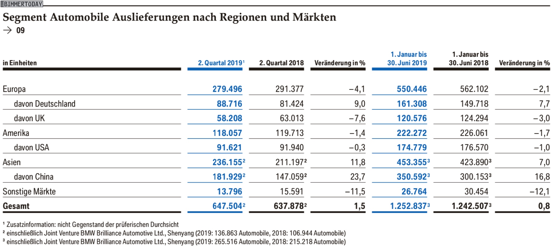 Regional betrachtet stützt sich das Wachstum der BMW Group 2019 vor allem auf Asien. Während der Heimat-Kontinent Europa genau wie Amerika schwächelt und knapp unter den Zahlen des Vorjahres bleibt, kann Asien dank starker Zuwächse in China weiter zulegen. Im ersten Halbjahr 2019 wurden über 36 Prozent aller Fahrzeuge in Asien verkauft, Amerika steht nur für knappe 18 Prozent. Wichtigste Region bleibt Europa mit einem Anteil von fast 44 Prozent.