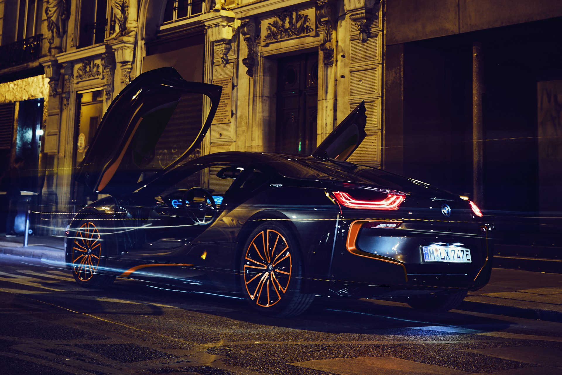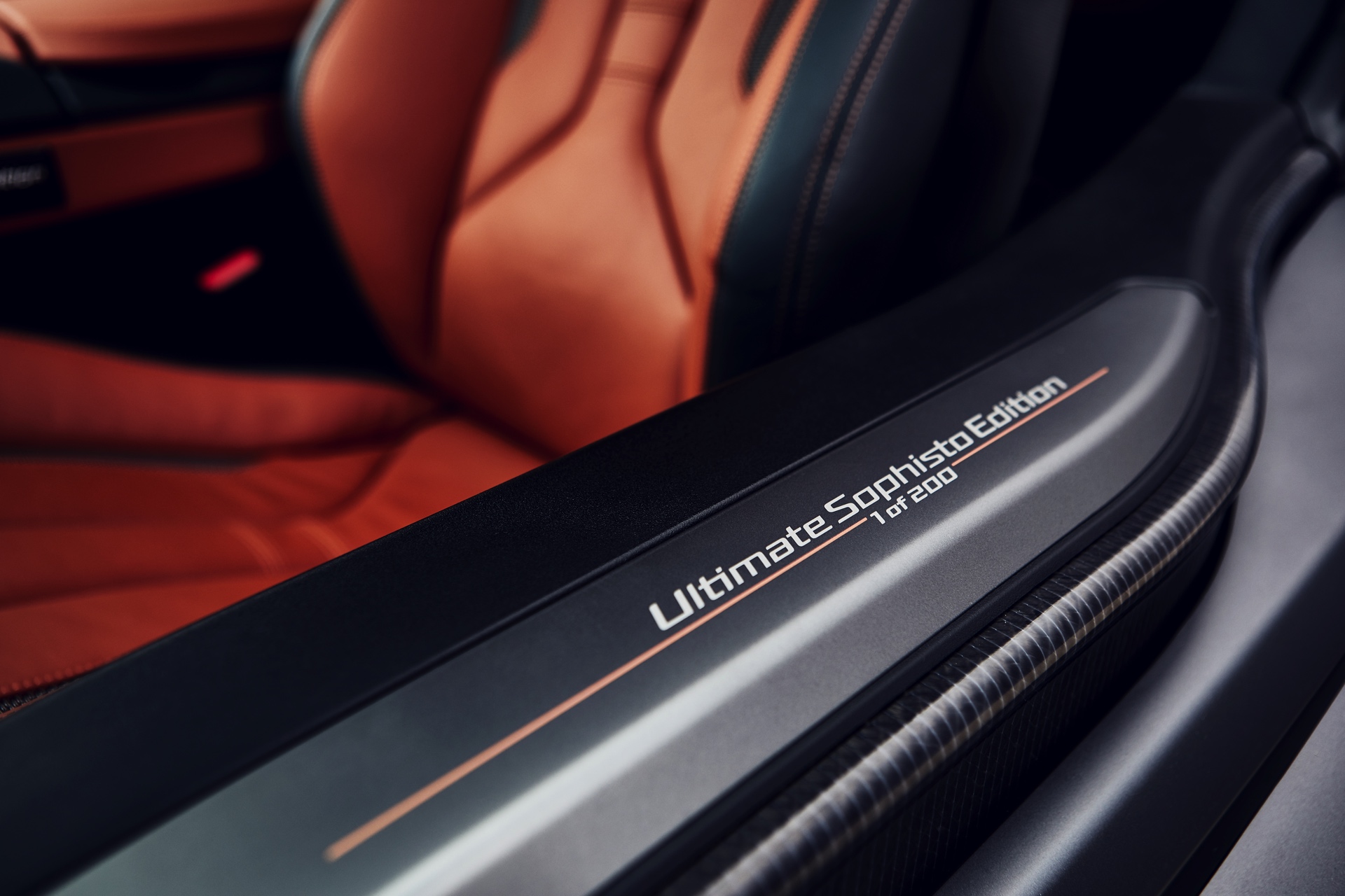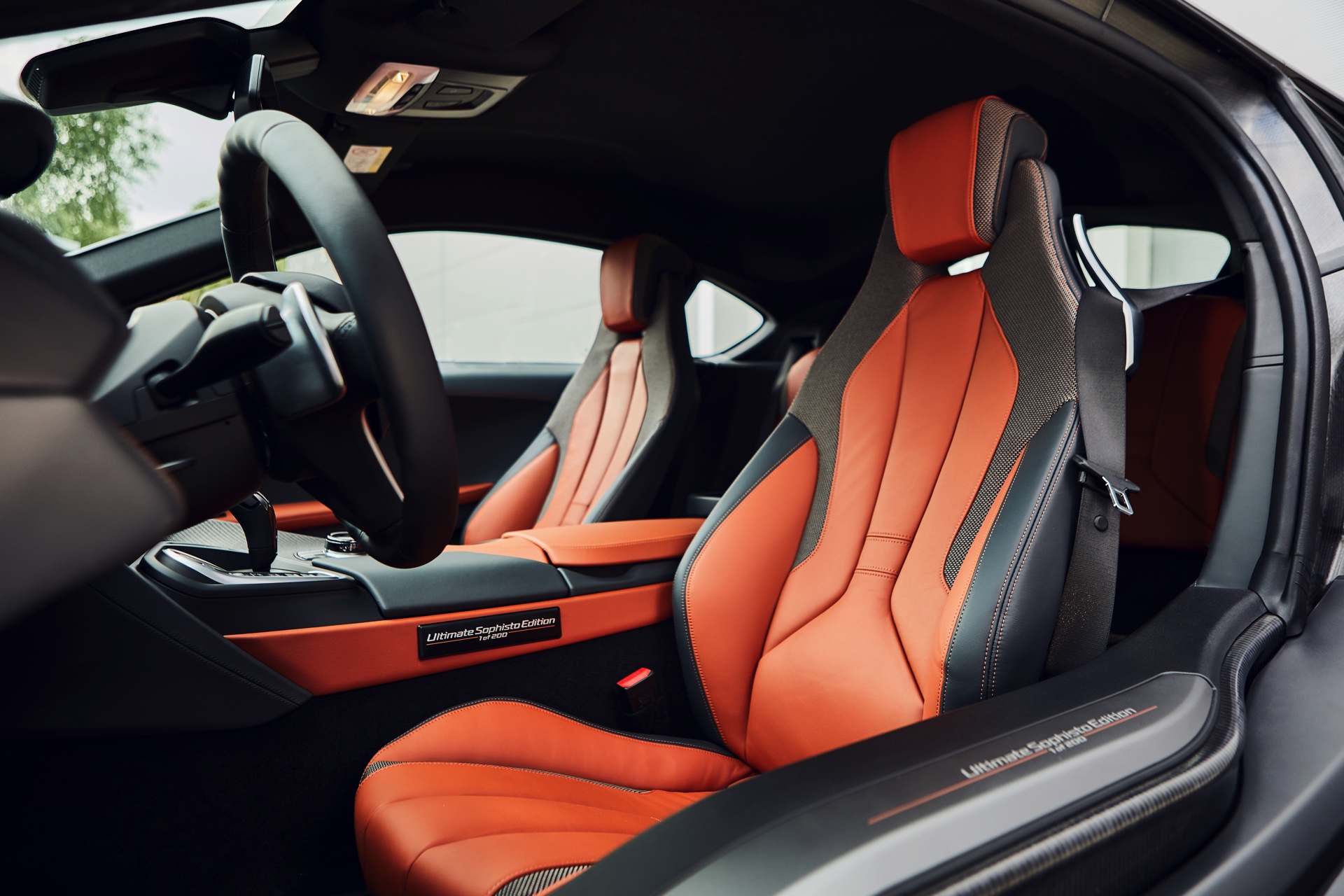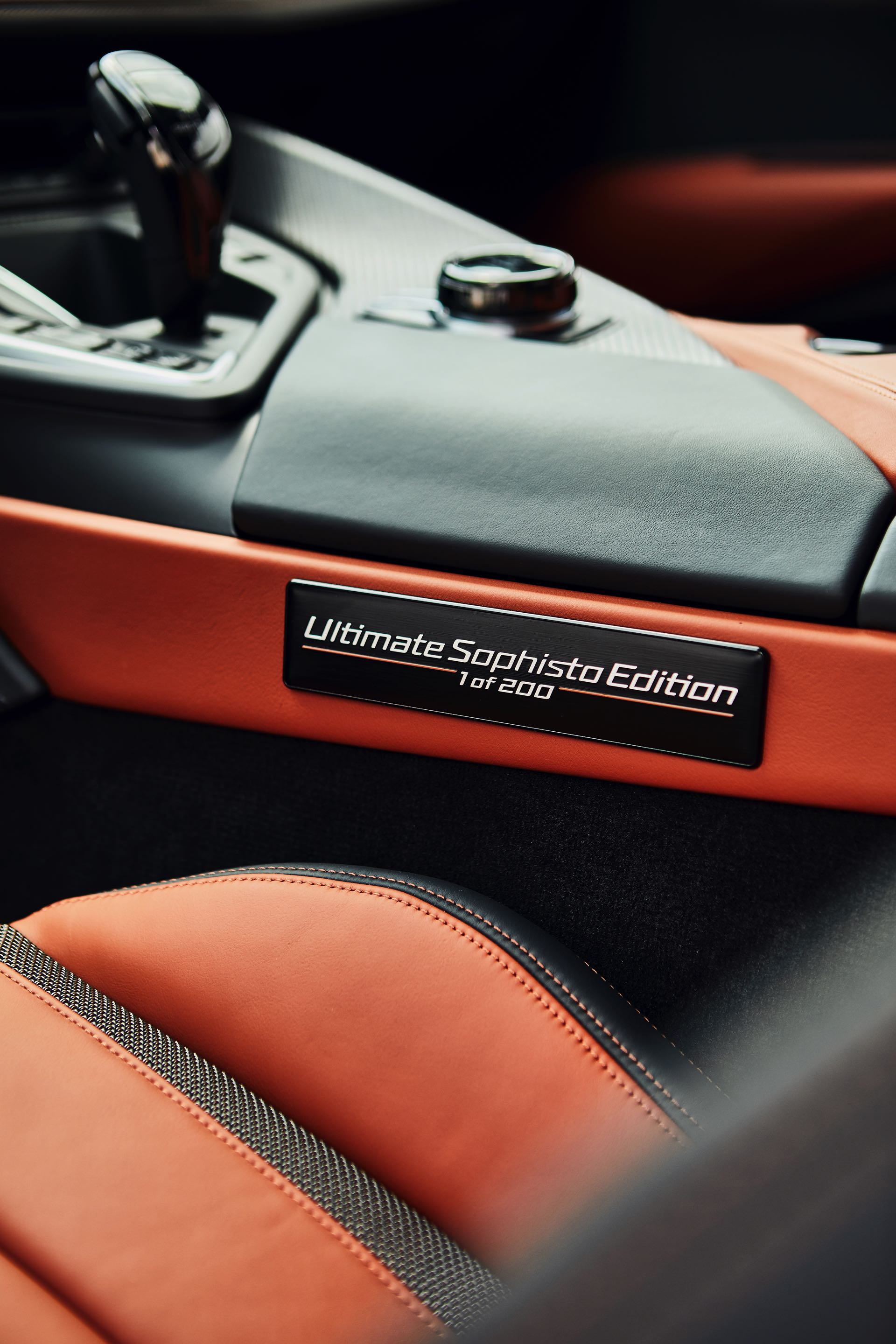 Gleich beim Einstiegen durch die Flügeltüren weisen die Leisten auf dem Schweller und eine Plakette auf der Mittelkonsole auf die Exklusivität des Sondermodells hin. Alle Exemplare der BMW i8 Ultimate Sophisto Edition kommen mit dem Interieur-Design Accaro in den Farben Schwarz und E-Copper sowie umfassender Serienausstattung vom Head-up-Display über Keramik-Bedienelemente bis hin zum Harman Kardon Soundsystem.