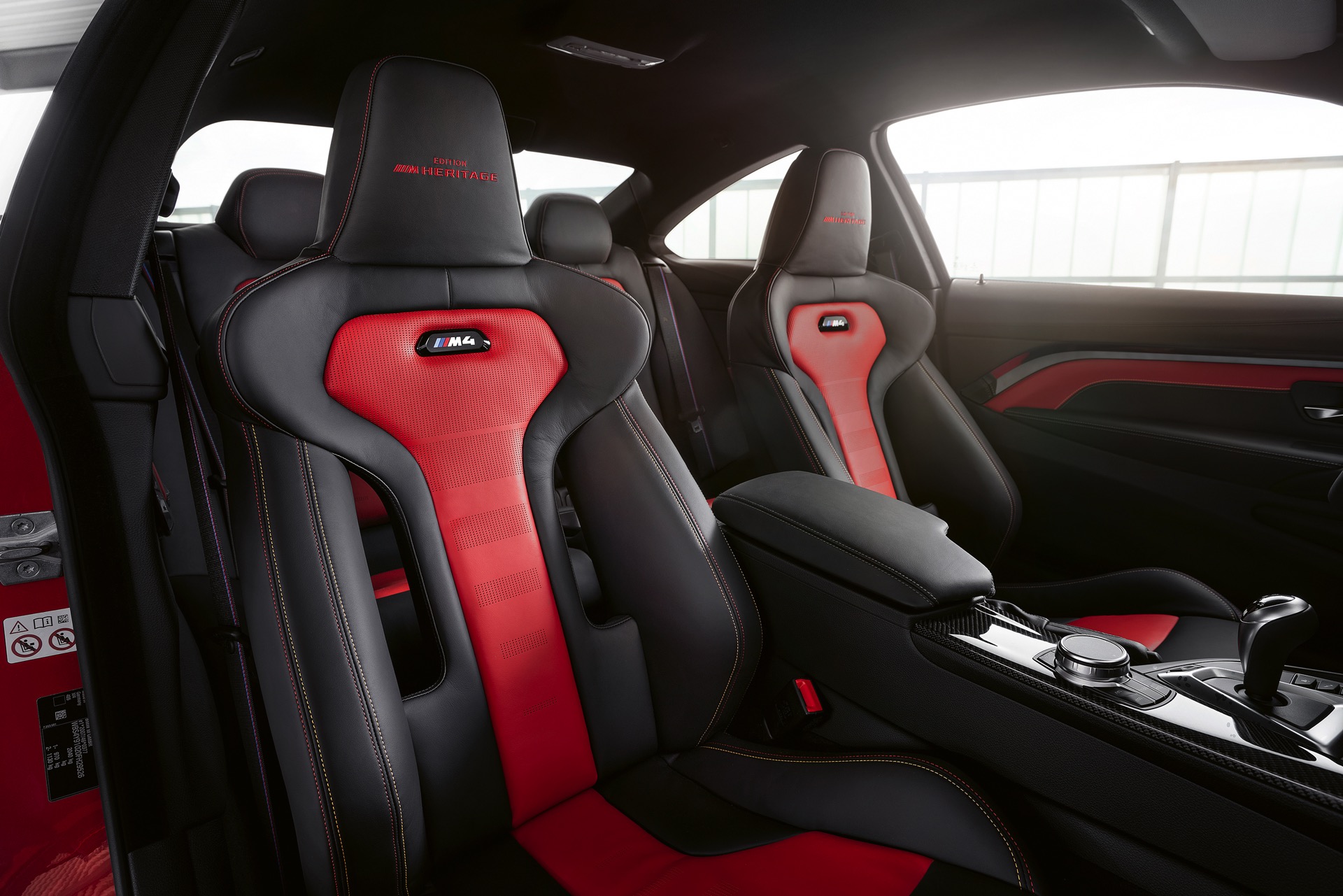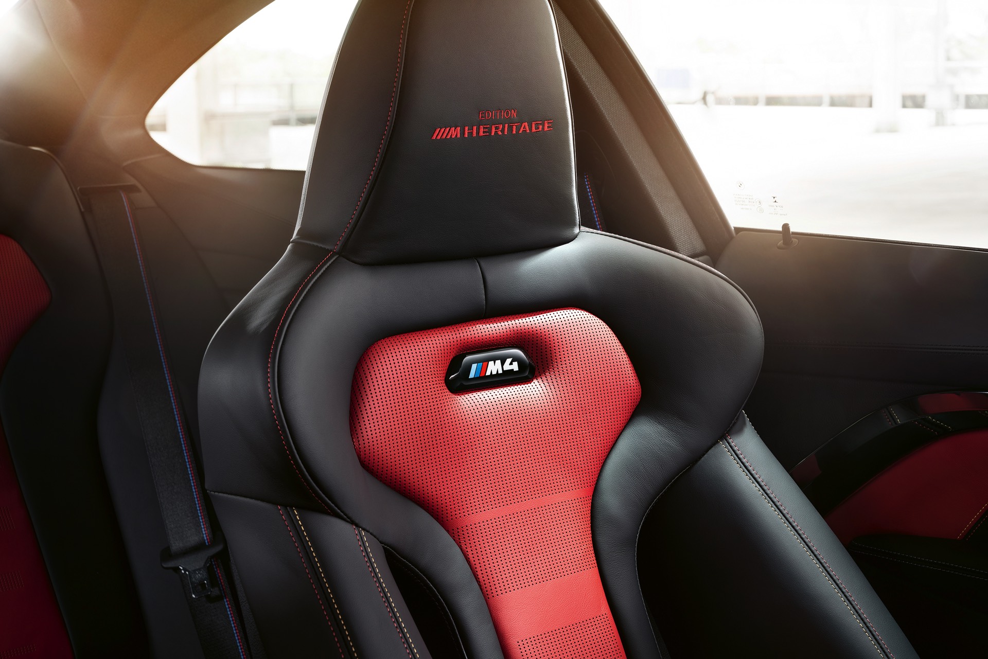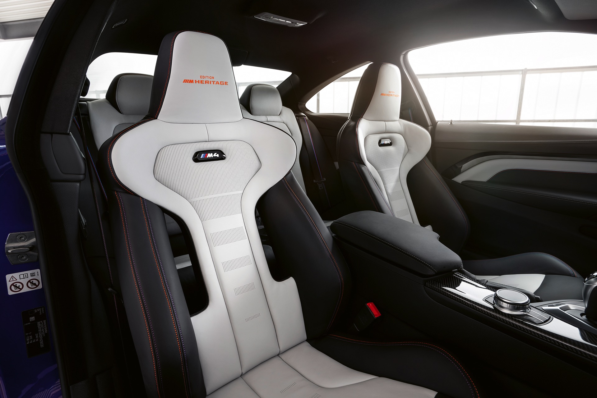 Auch im Innenraum spielen kräftige Farben die Hauptrolle: Alle 750 Exemplare der BMW M4 Edition ///M Heritage laufen mit Vollleder-Ausstattung in Bicolor-Ausführung vom Band. Alle Modelle in Laguna Seca Blue kommen mit Sitzen in Silverstone und Schwarz sowie farbigen Kontrastnähten in Türkis, Fahrzeuge in Velvet Blue tragen die gleichen Farben in Verbindung mit zweifarbigen Kontrastnähten in Velvet Blue und Orange. Das Sondermodell in Imolarot kommt mit Sitzen in Rot und Schwarz sowie Kontrastnähten in Gelb und Rot.
