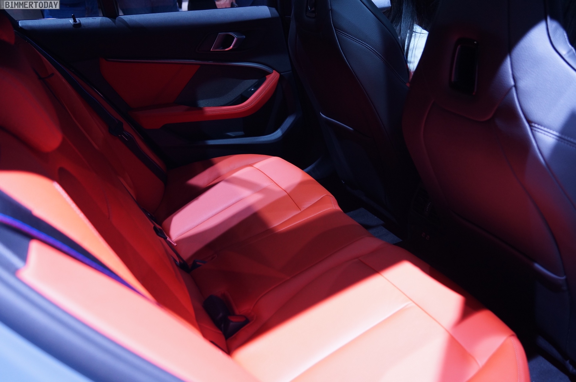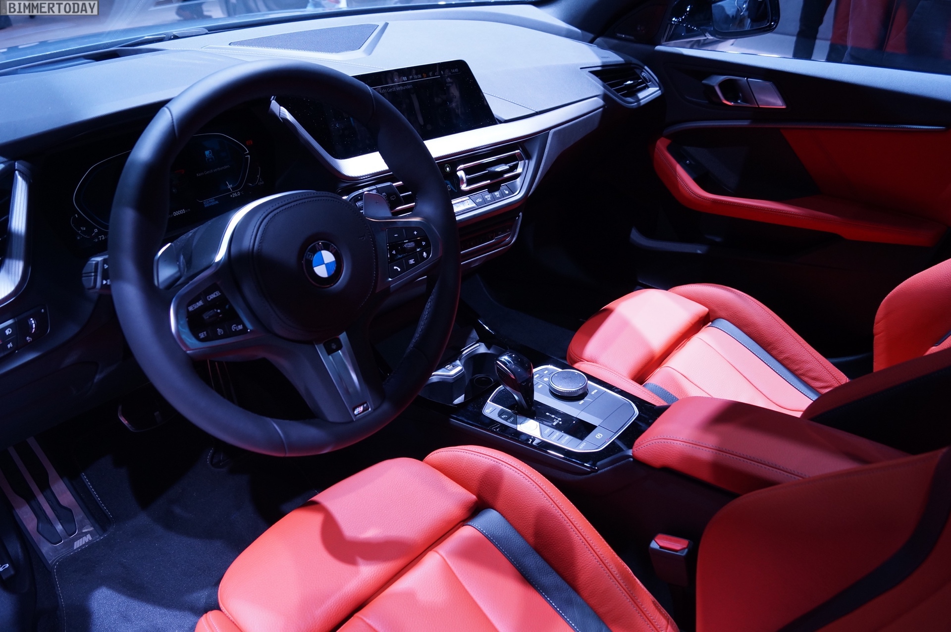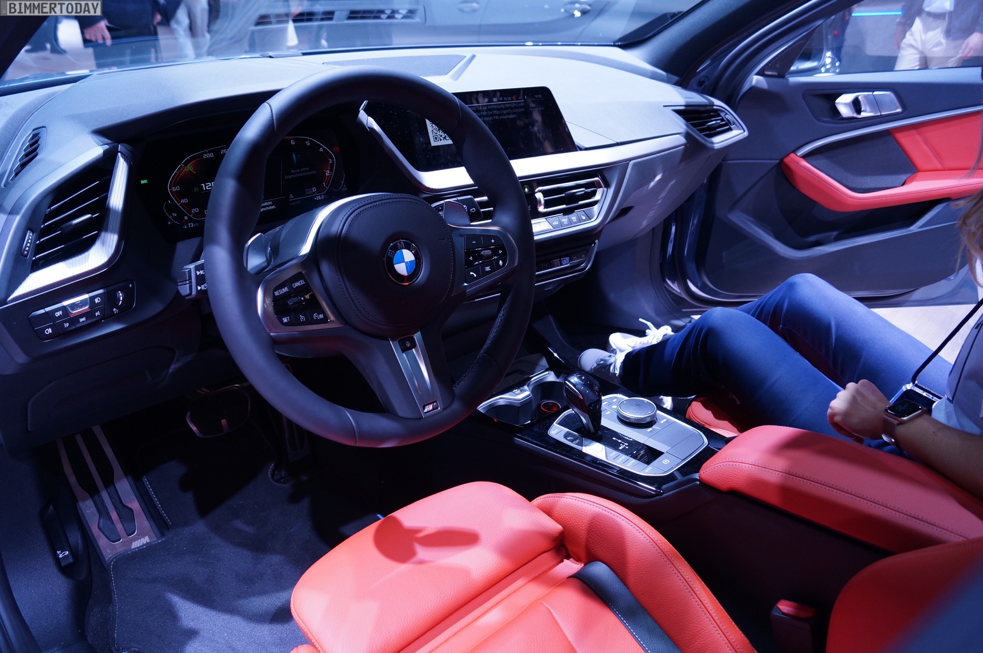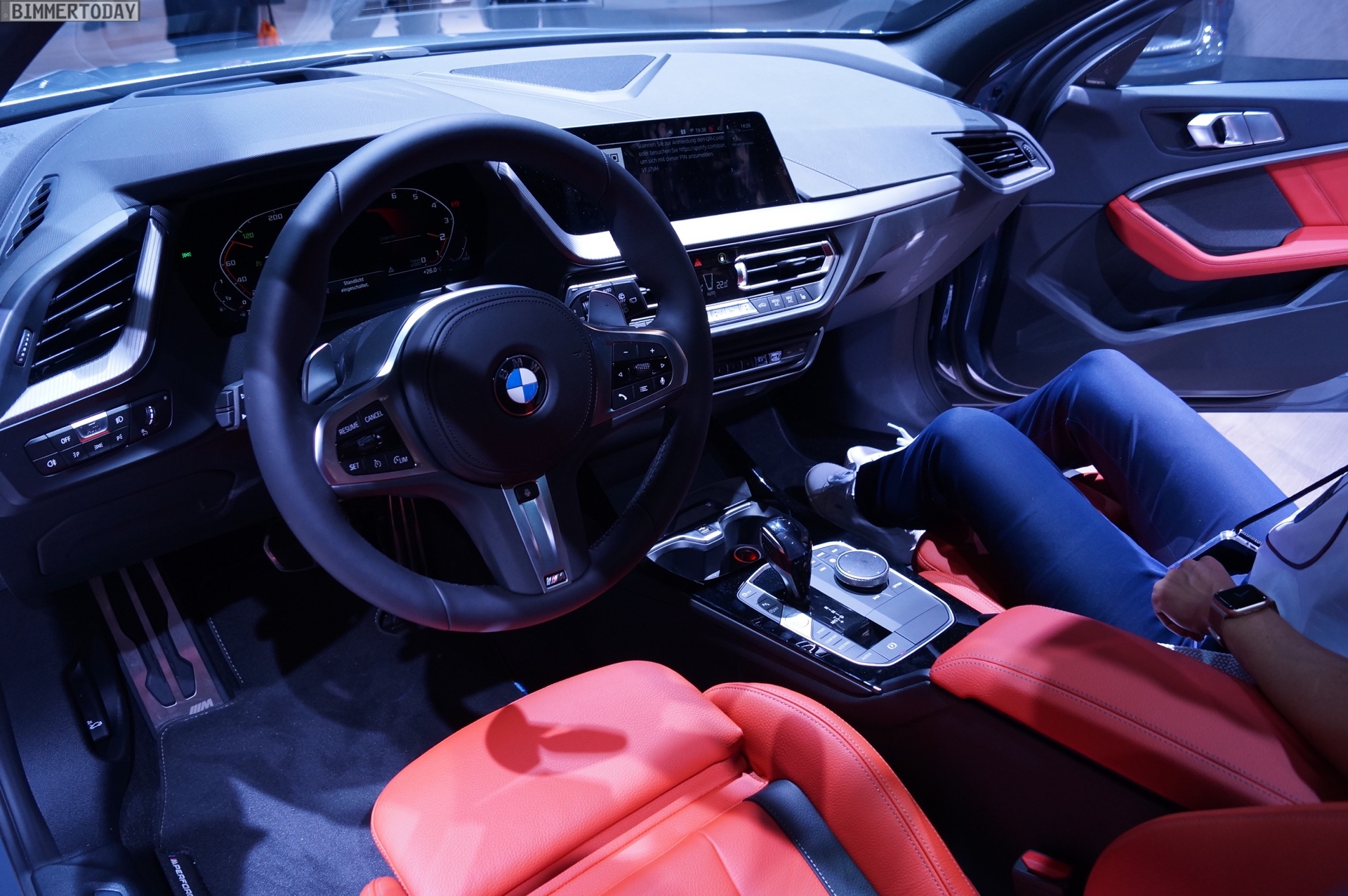 Unsere Live-Fotos von der IAA 2019 zeigen den M135i mit den 18 Zoll großen Leichtmetallrädern V-Speiche 554 in Orbitgrau, im Innenraum setzt die Lederausstattung Dakota in Magma Rot farbige Akzente: