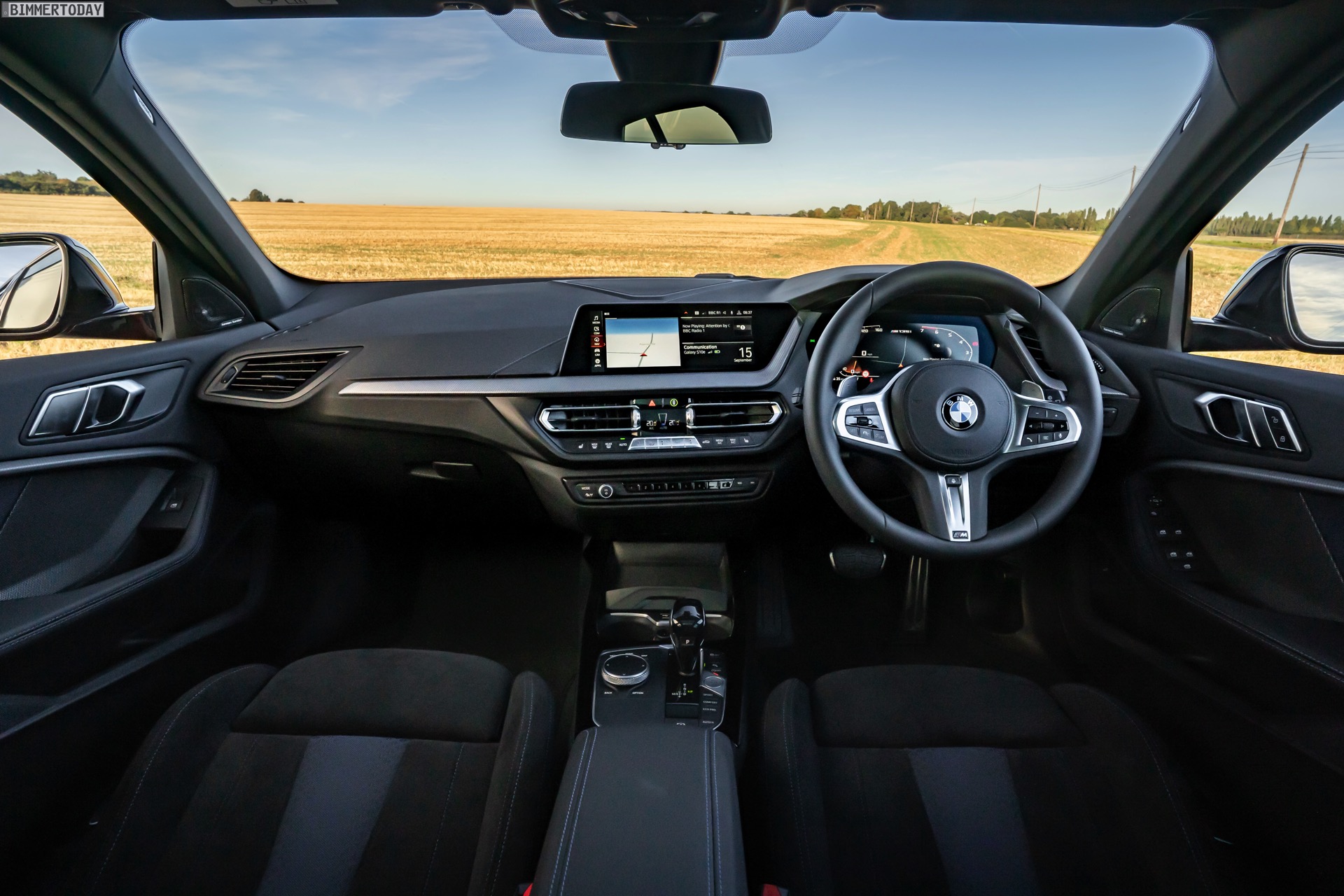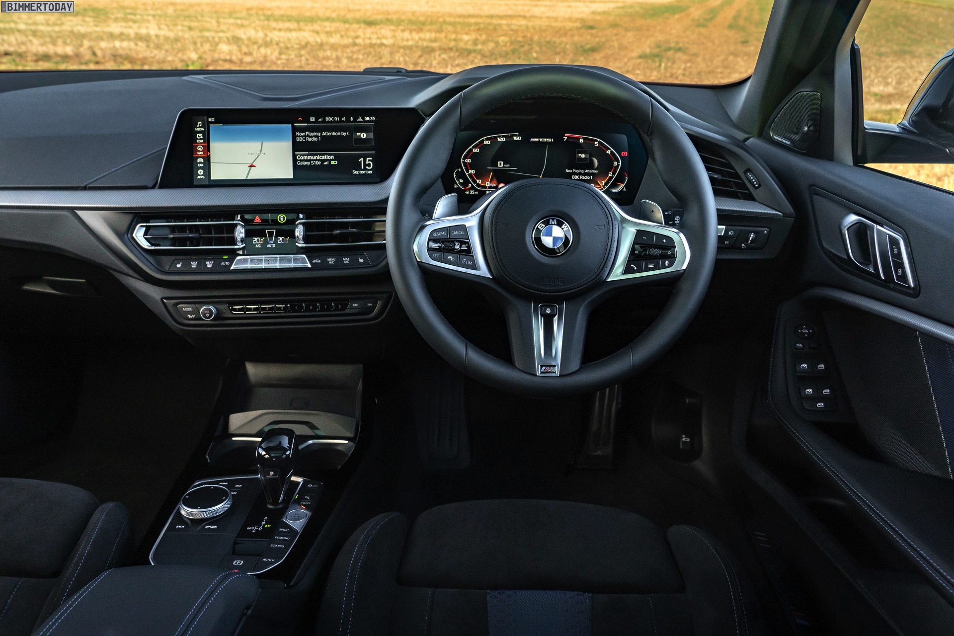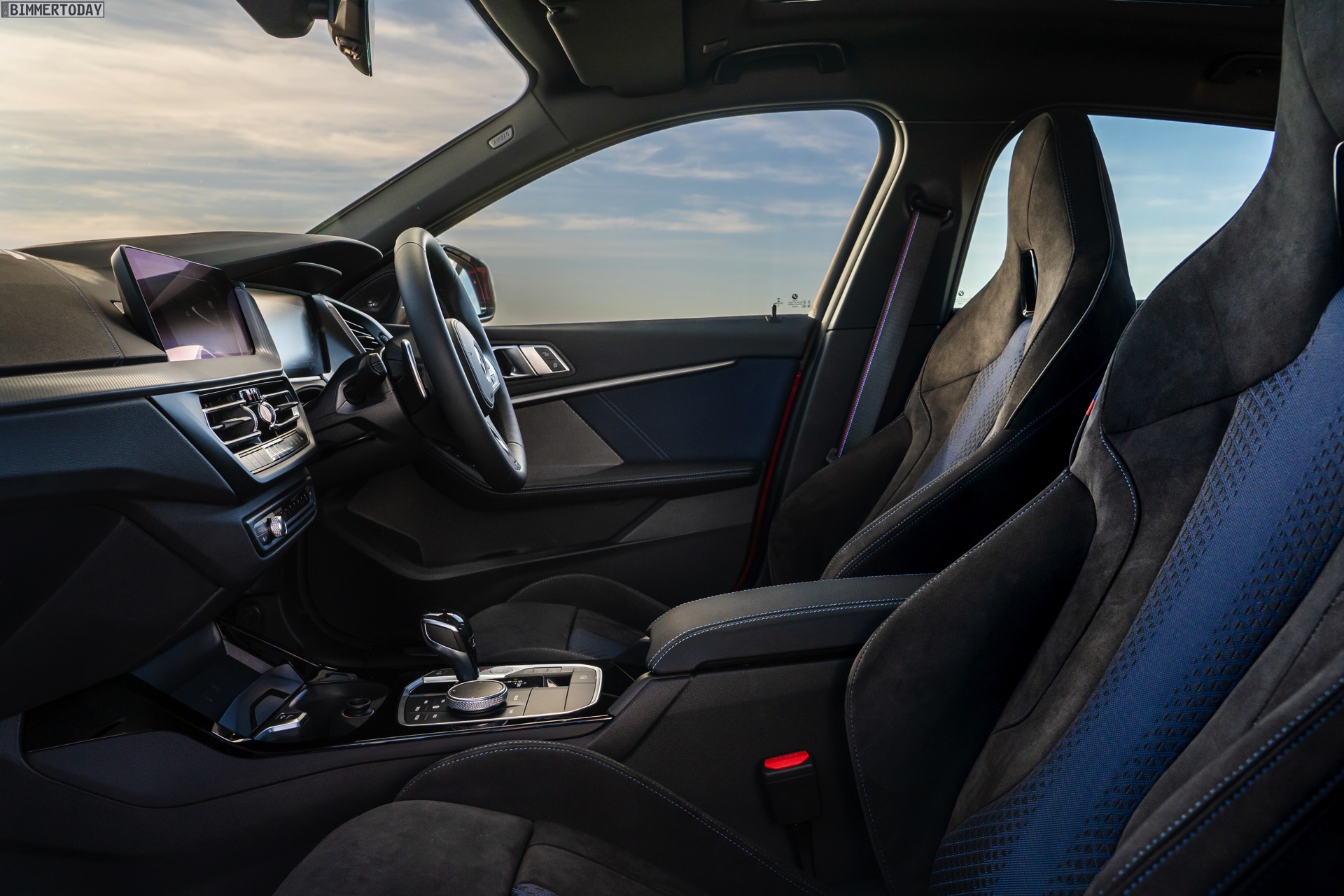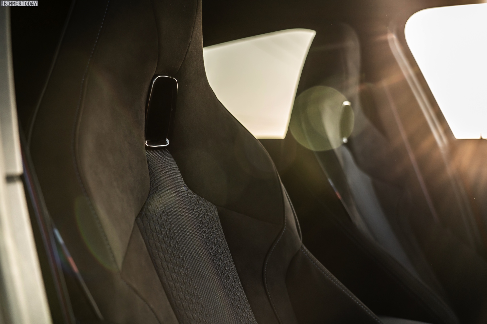 Im Innenraum trägt der gezeigte Rechtslenker die Kombination von Stoff Trigon und Alcantara, wobei Akzente in den M-Farben den sportlichen Anspruch betonen. Verbaut sind auch die optionalen Sicherheitsgurte mit M-Streifen und das BMW Live Cockpit Professional mit zwei 10,25 Zoll großen Displays.