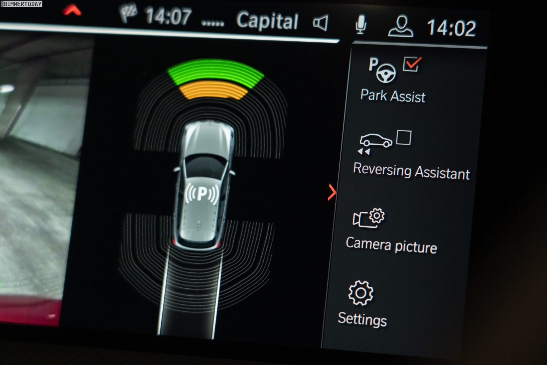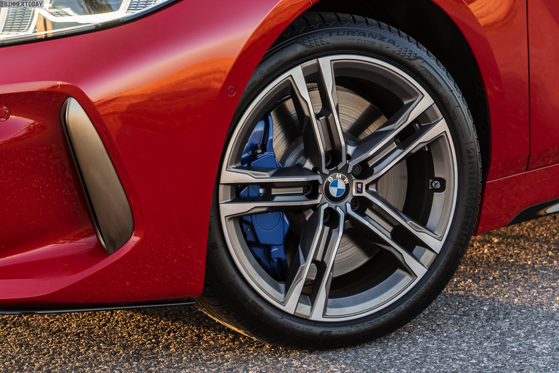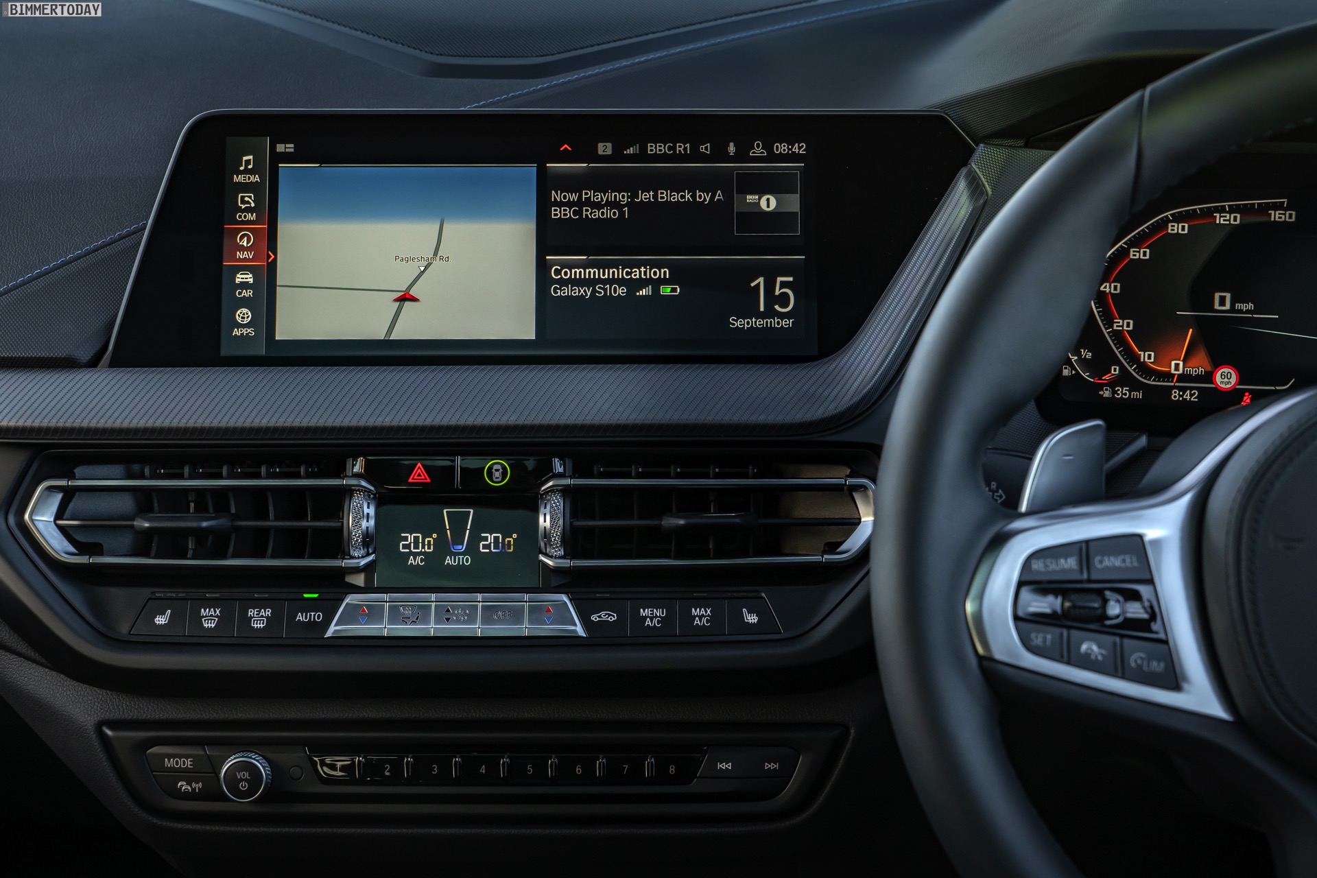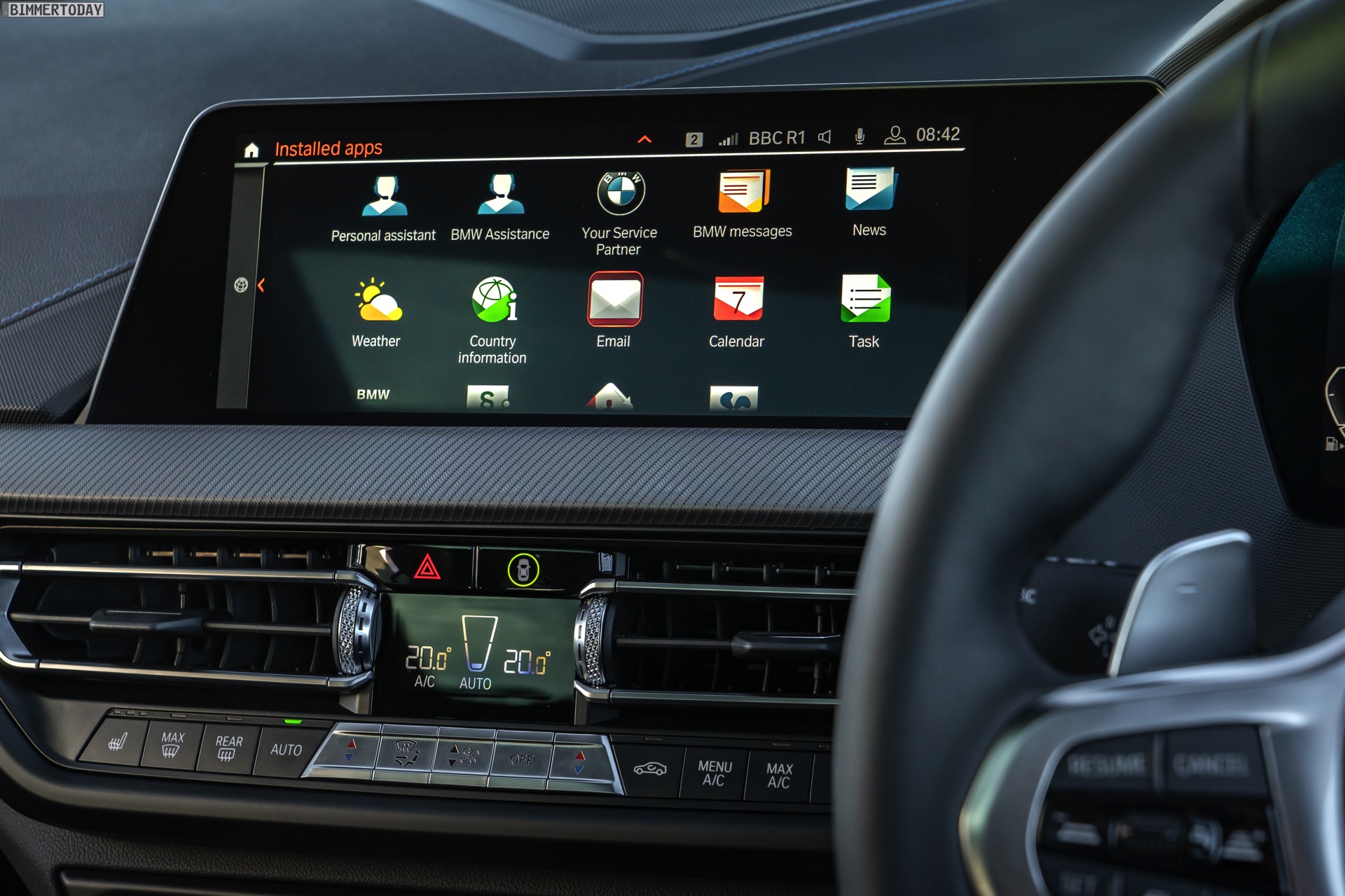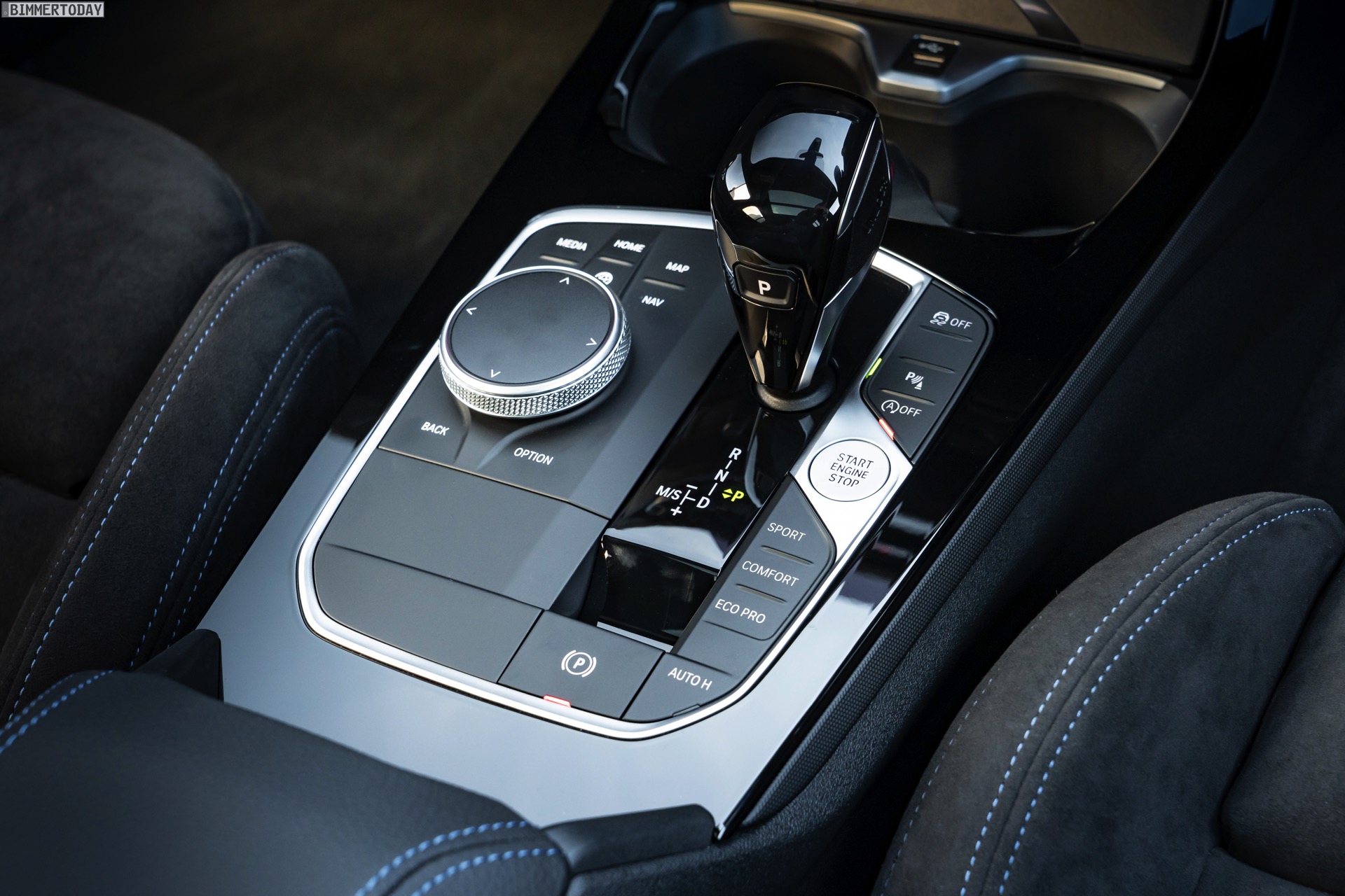 Im Innenraum trägt der gezeigte Rechtslenker die Kombination von Stoff Trigon und Alcantara, wobei Akzente in den M-Farben den sportlichen Anspruch betonen. Verbaut sind auch die optionalen Sicherheitsgurte mit M-Streifen und das BMW Live Cockpit Professional mit zwei 10,25 Zoll großen Displays.
