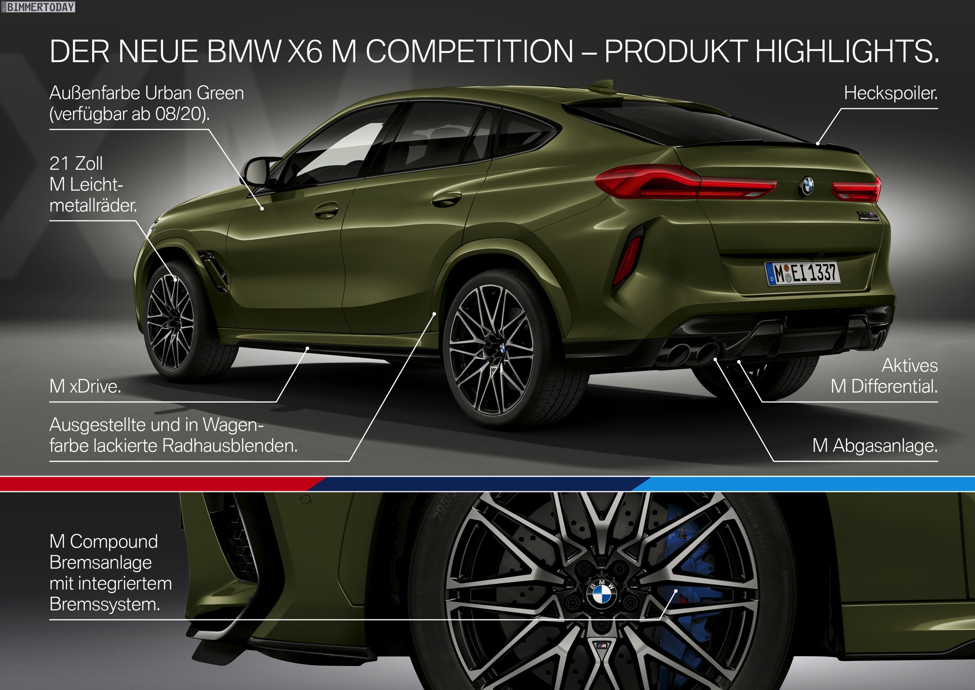 Wer keine Angst vor neugierigen Blicken hat und sich mit seinem BMW X6 M Competition stattdessen volle Aufmerksamkeit sichern will, erhält mit der Lackierung in Urban Green Uni genau die richtige Alternative zum üblichen Farbprogramm. Das dunkle Grün steht ab August 2020 und damit vier Monate nach dem offiziellen Marktstart zur Wahl und ist trotz seines individuellen Looks nicht mit einem Aufpreis verbunden.