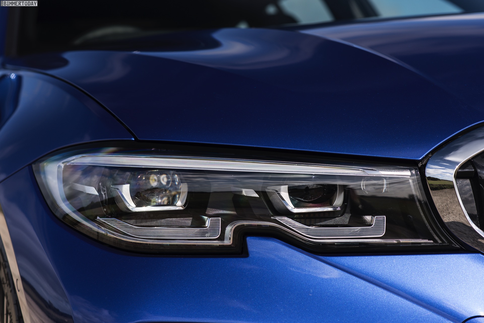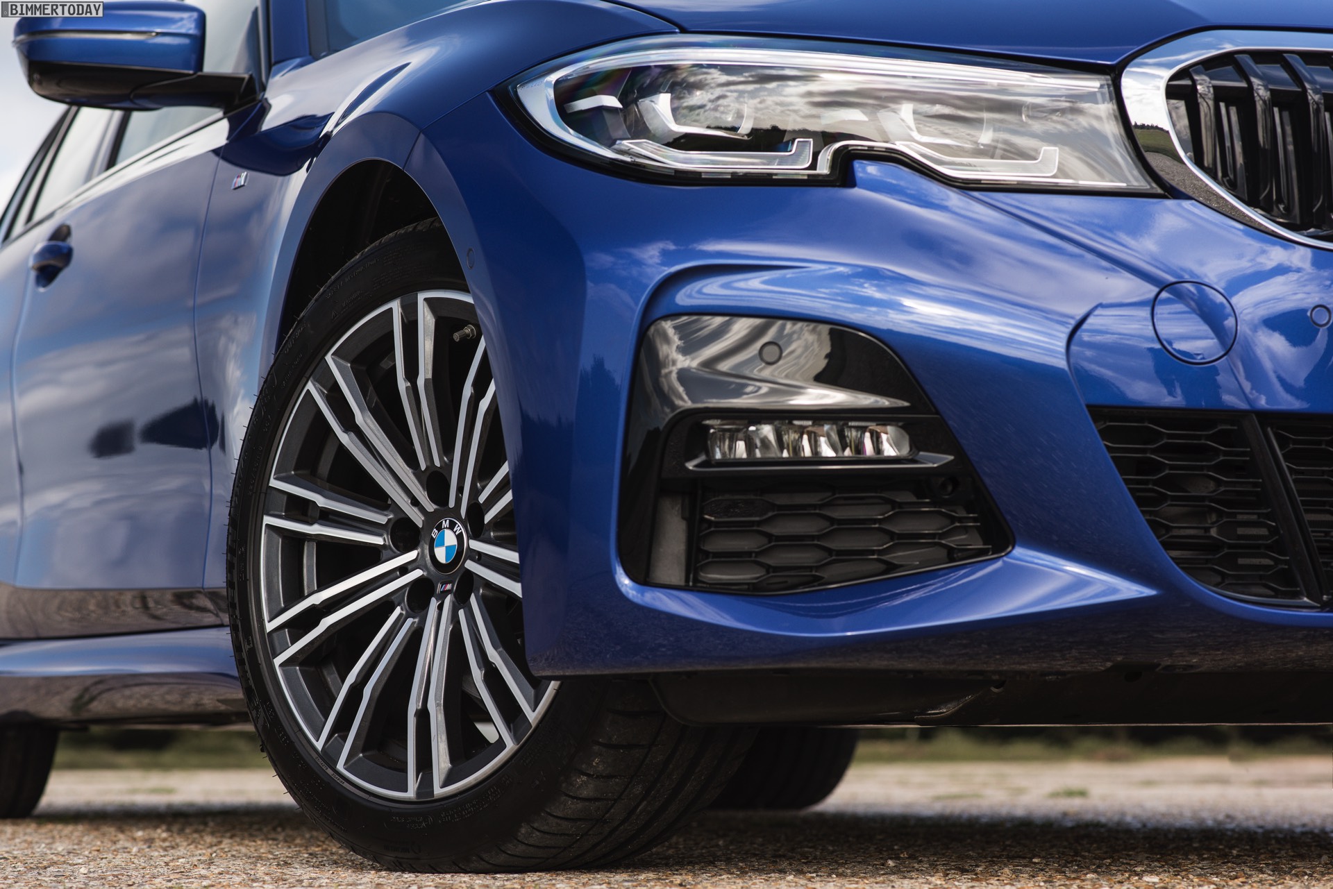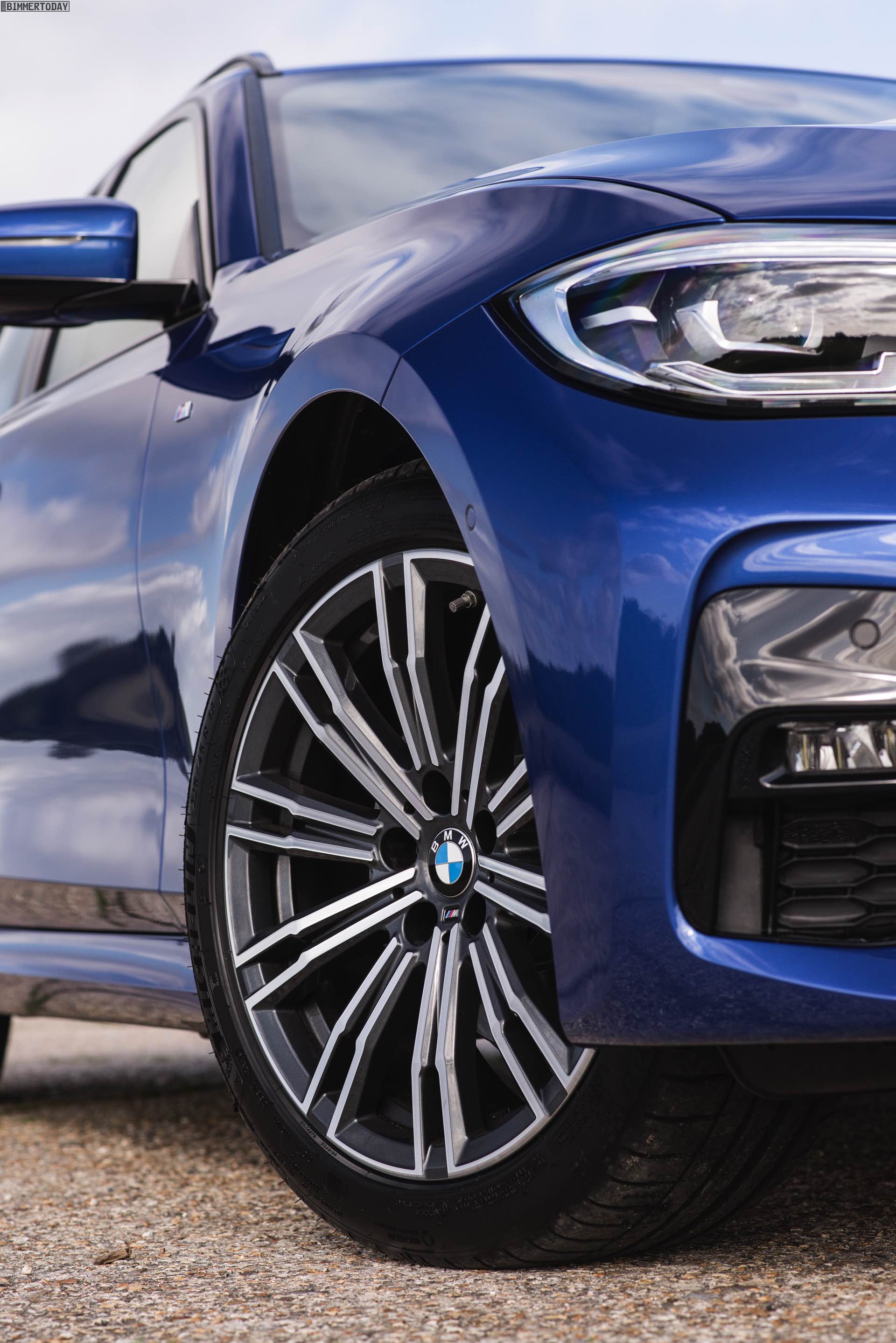 Der farbigere der beiden nun in Szene gesetzten BMW 3er G21 setzt auf die exklusiv mit dem M Sportpaket erhältliche Lackierung in Portimao Blau, die das beim Vorgänger angebotene Estorilblau ersetzt. 18 Zoll große Leichtmetallräder vom Typ Doppelspeiche 790 M Bicolor zeigen, dass es nicht immer die optionalen 19-Zöller sein müssen.