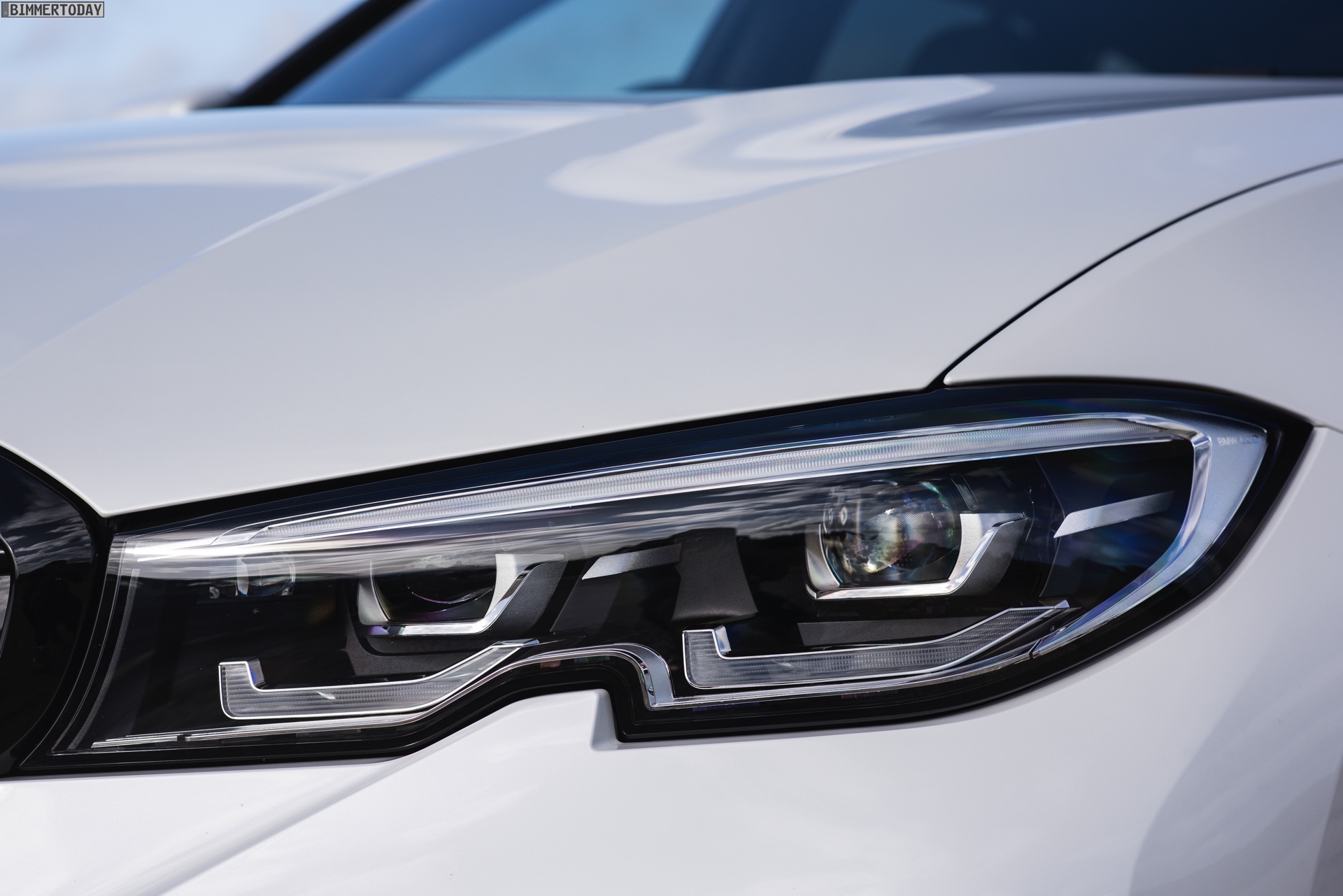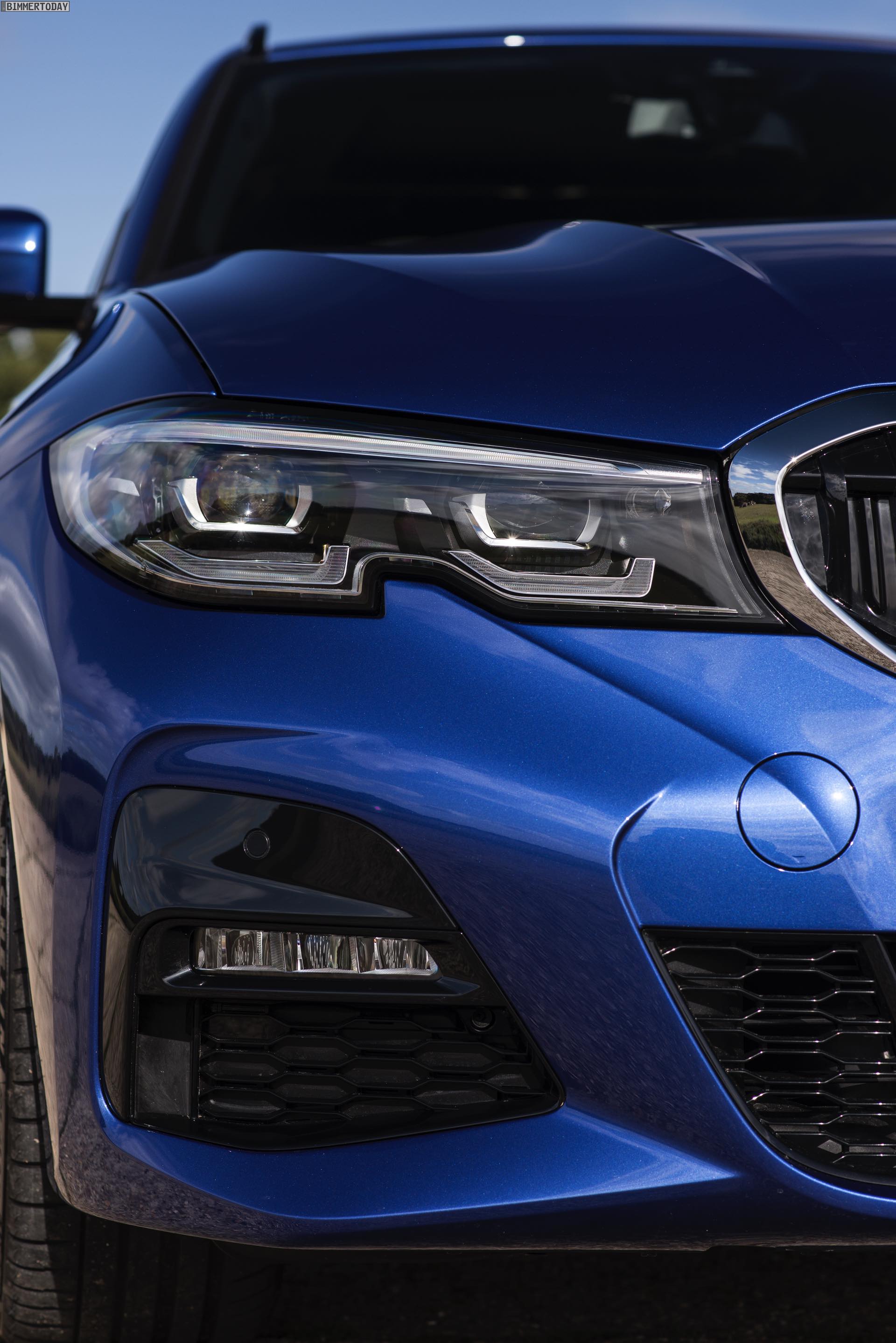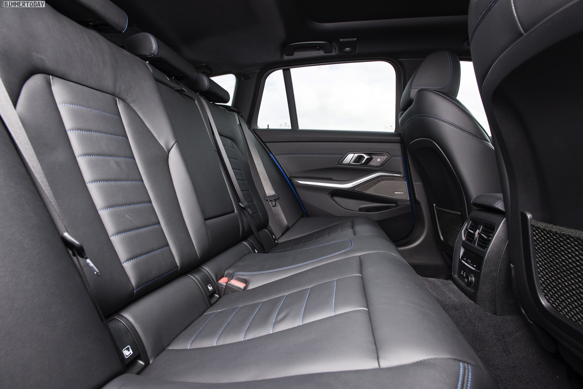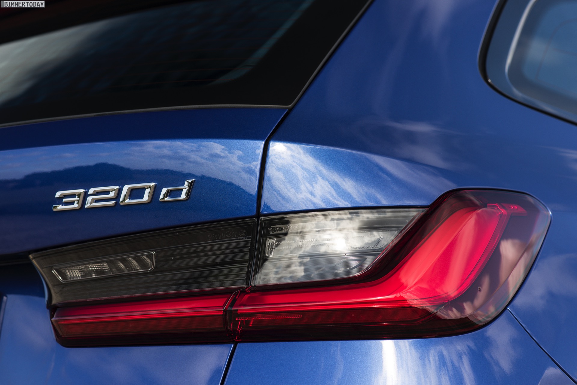 Der farbigere der beiden nun in Szene gesetzten BMW 3er G21 setzt auf die exklusiv mit dem M Sportpaket erhältliche Lackierung in Portimao Blau, die das beim Vorgänger angebotene Estorilblau ersetzt. 18 Zoll große Leichtmetallräder vom Typ Doppelspeiche 790 M Bicolor zeigen, dass es nicht immer die optionalen 19-Zöller sein müssen.