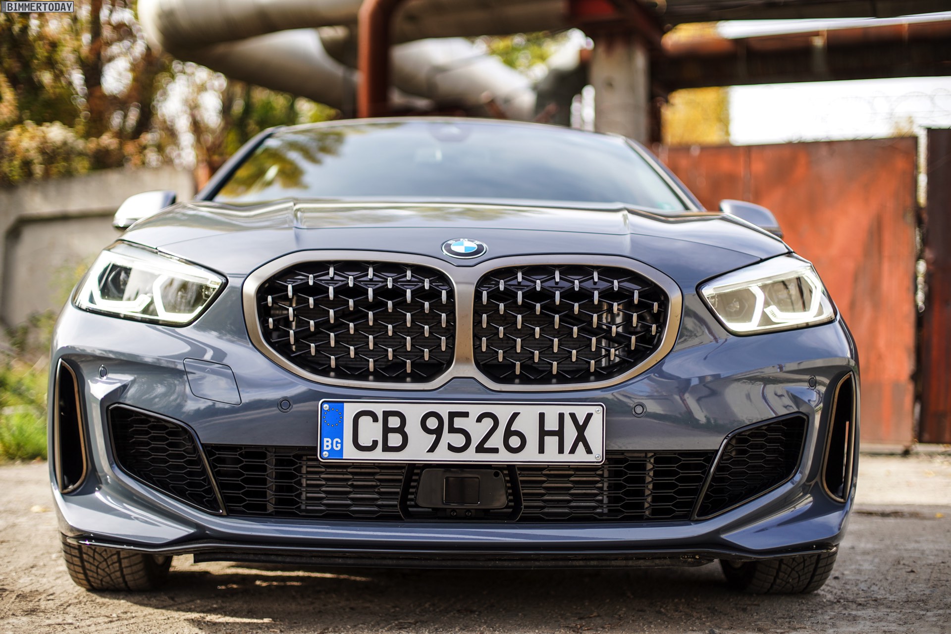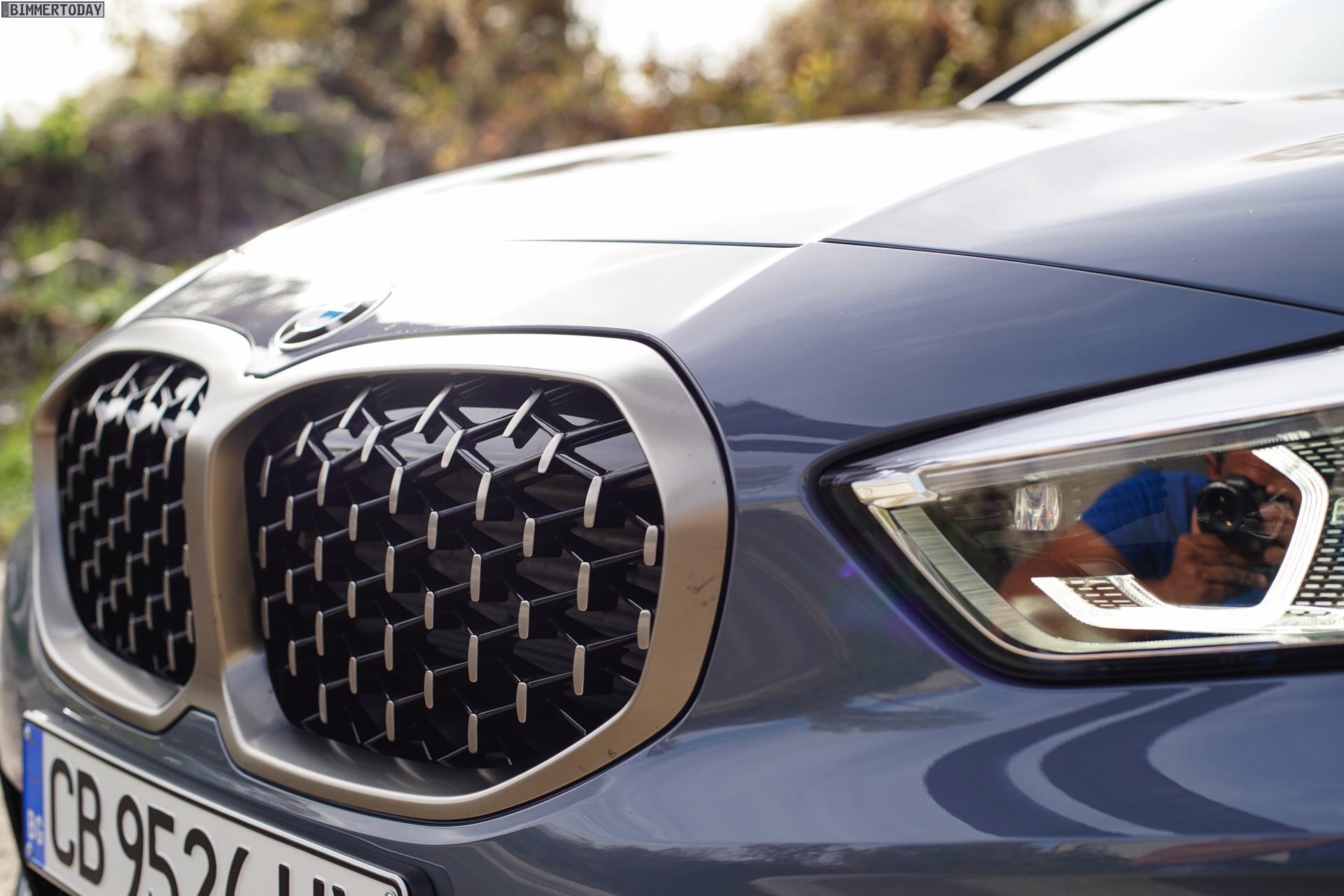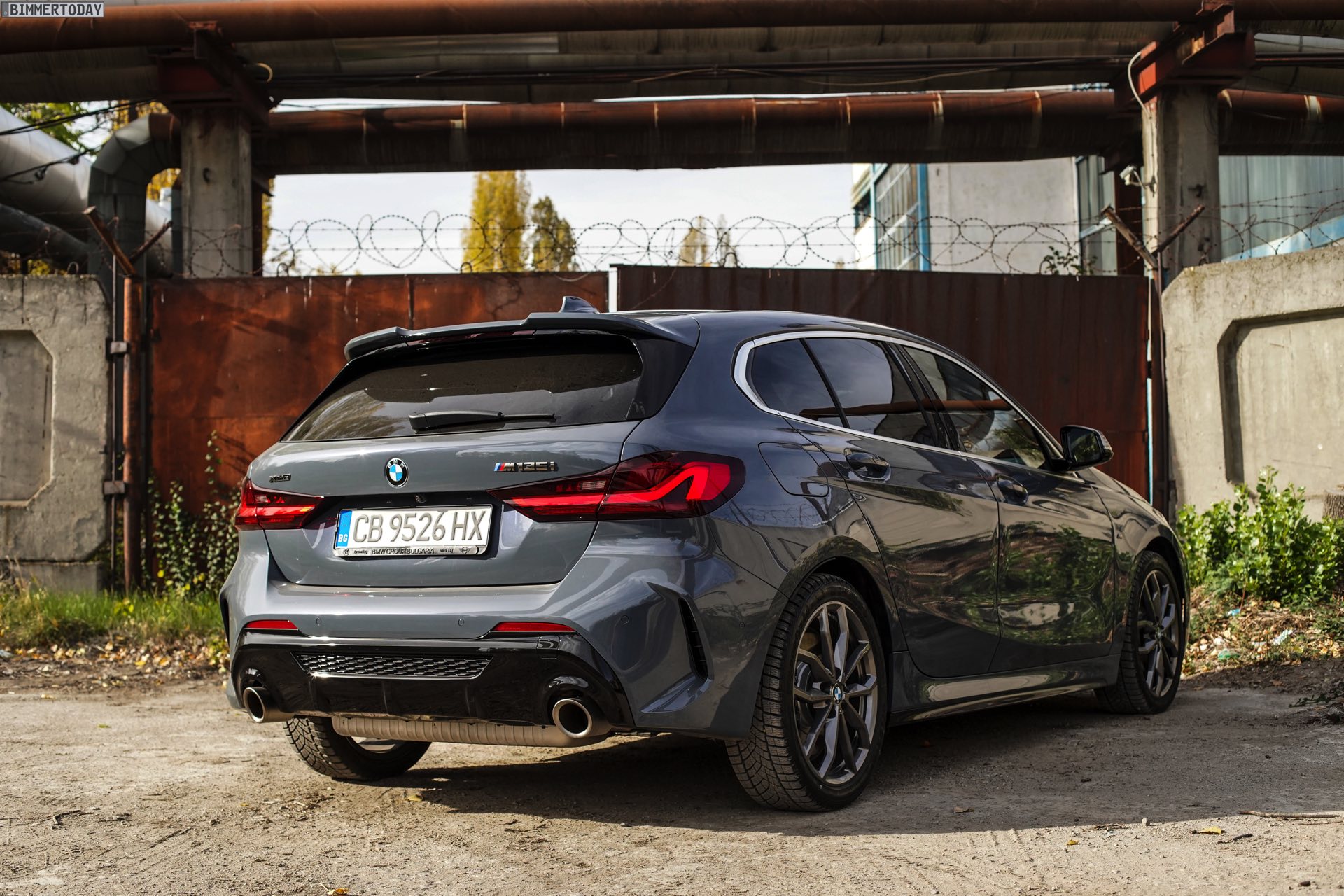 Die dem Topmodell M135i vorbehaltenen Akzente in Cerium Grey setzen weitere exklusive Akzente und werten das gezeigte Fahrzeug zusätzlich auf. Neben der Einfassung für die M135i-spezifische Mesh-Niere sind auch die Außenspiegel, Elemente der äußeren Lufteinlässe in der Frontschürze und die Endrohr-Blenden in Cerium Grey gehalten. Wer es lieber schwarz mag, kann im Fall des M135i zum M Performance Paket greifen und erhält dann neben leichteren Schmiederädern auch eine Shadow Line mit erweiterten Umfängen, die alle Anflüge von Cerium Grey ersetzt.