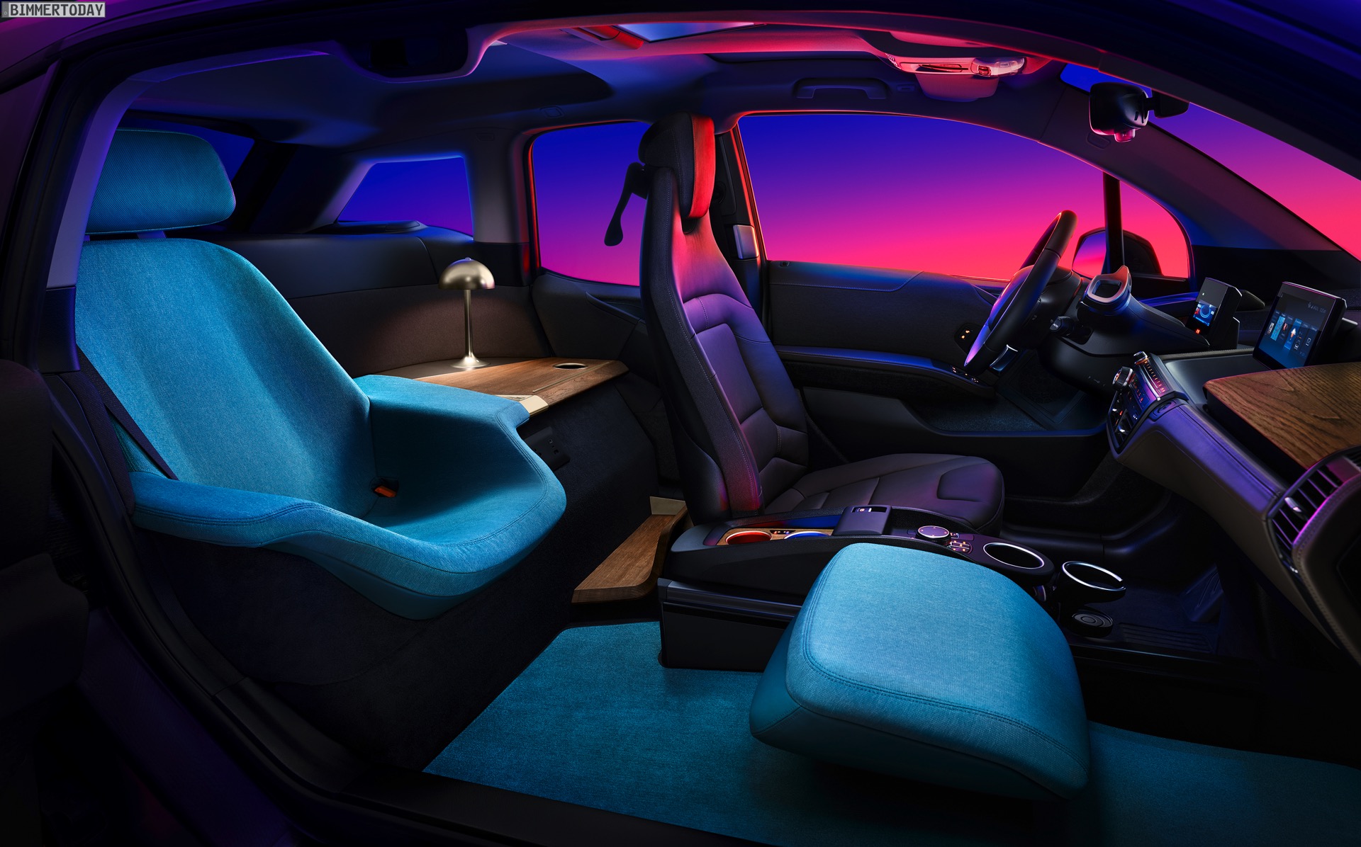 Im BMW i3 Urbain Suite entsprechen nur noch der Fahrersitz und das Armaturenbrett der Serie, alle anderen Elemente des Innenraums wurden zum Wohl des Fond-Passagieres komplett neu gestaltet. Das aus dem Dachhimmel ausklappbare Display kann zur Anzeige verschiedenster Arbeits- und Unterhaltungs-Inhalte genutzt werden, bei entsprechender Netzabdeckung können Online-Inhalte per 5G-Verbindung ins Auto geholt werden. Eine persönliche Sound-Zone sorgt dafür, dass sich auch Musik in überdurchschnittlich hoher Qualität genießen lässt.