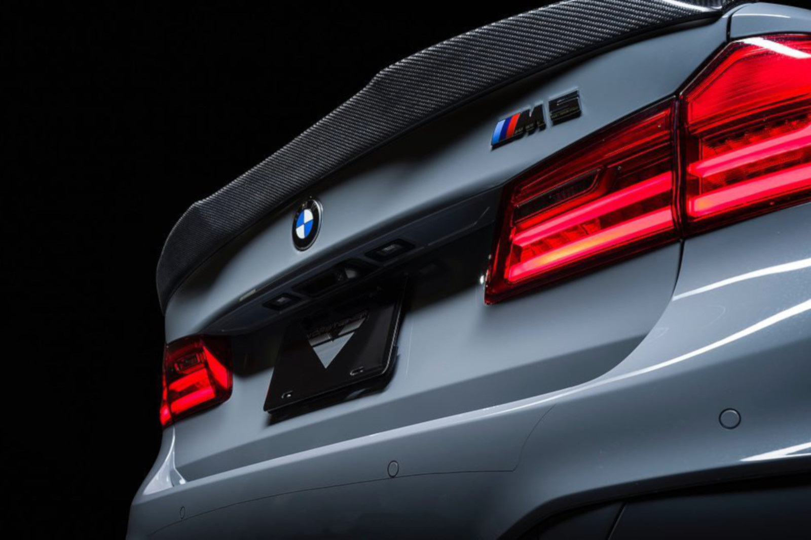 Komplett aus Carbon gefertigt sind der Frontsplitter-Aufsatz, der Diffusor-Einsatz für die Heckschürze und die mächtige Spoiler-Lippe für die Kofferraum-Haube. Gemeinsam schärfen die amerikanischen Aero-Teile den Auftritt des BMW M5 F90 massiv, egal ob der Betrachter die Front formatfüllend im Rückspiegel sieht oder schon das davoneilende Heck im Blick hat.