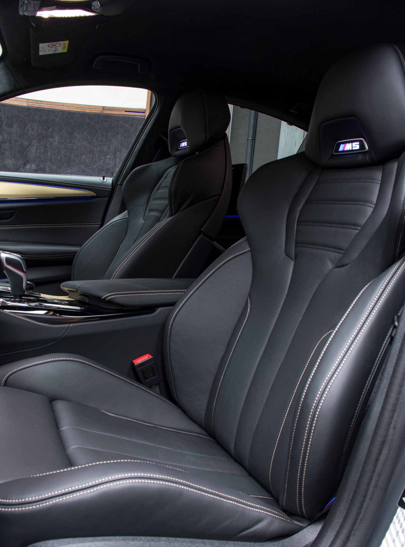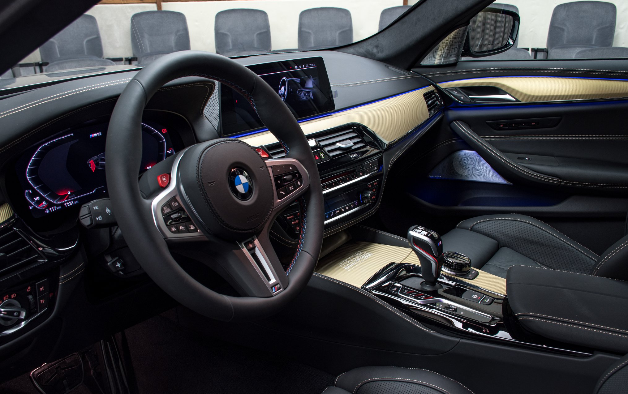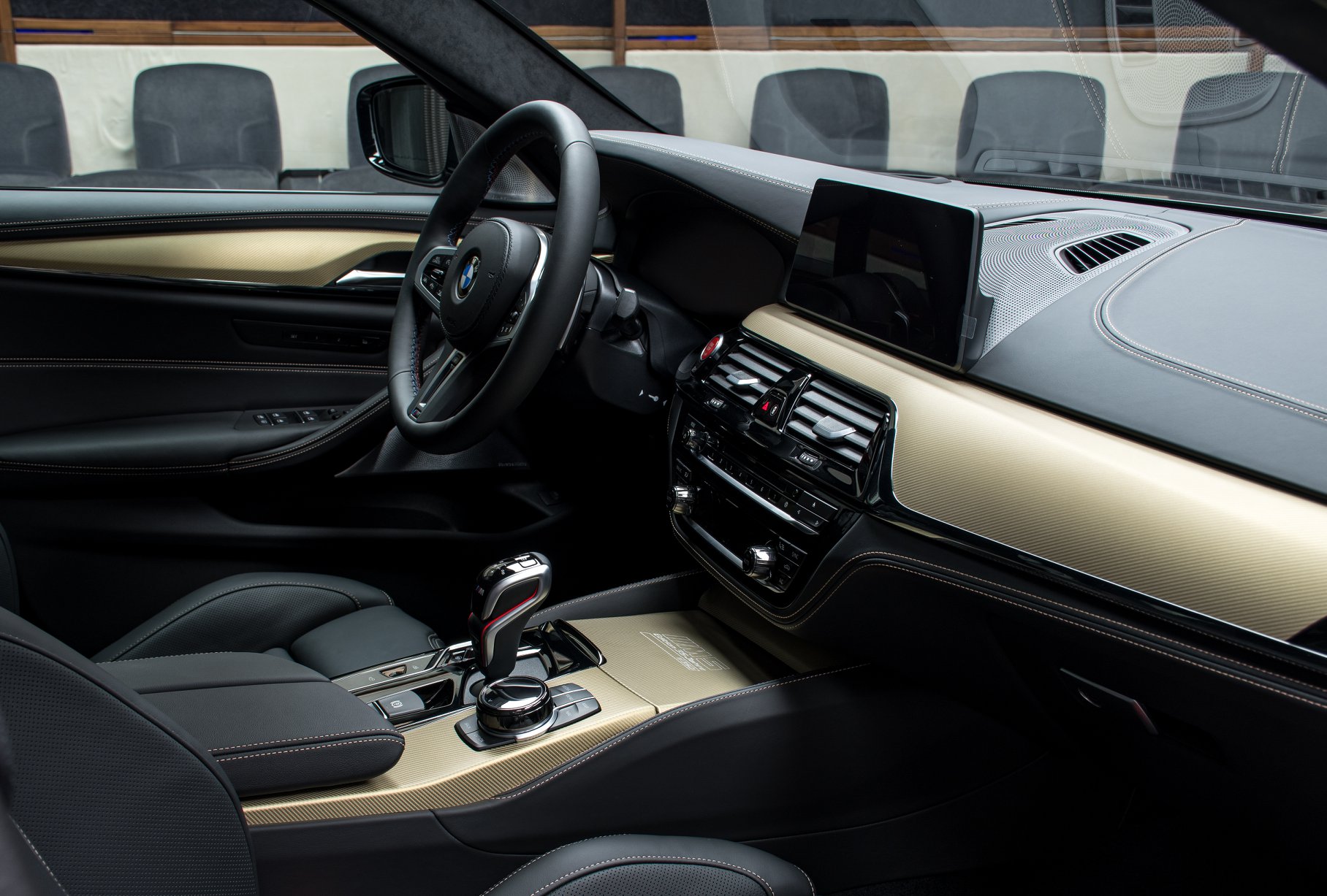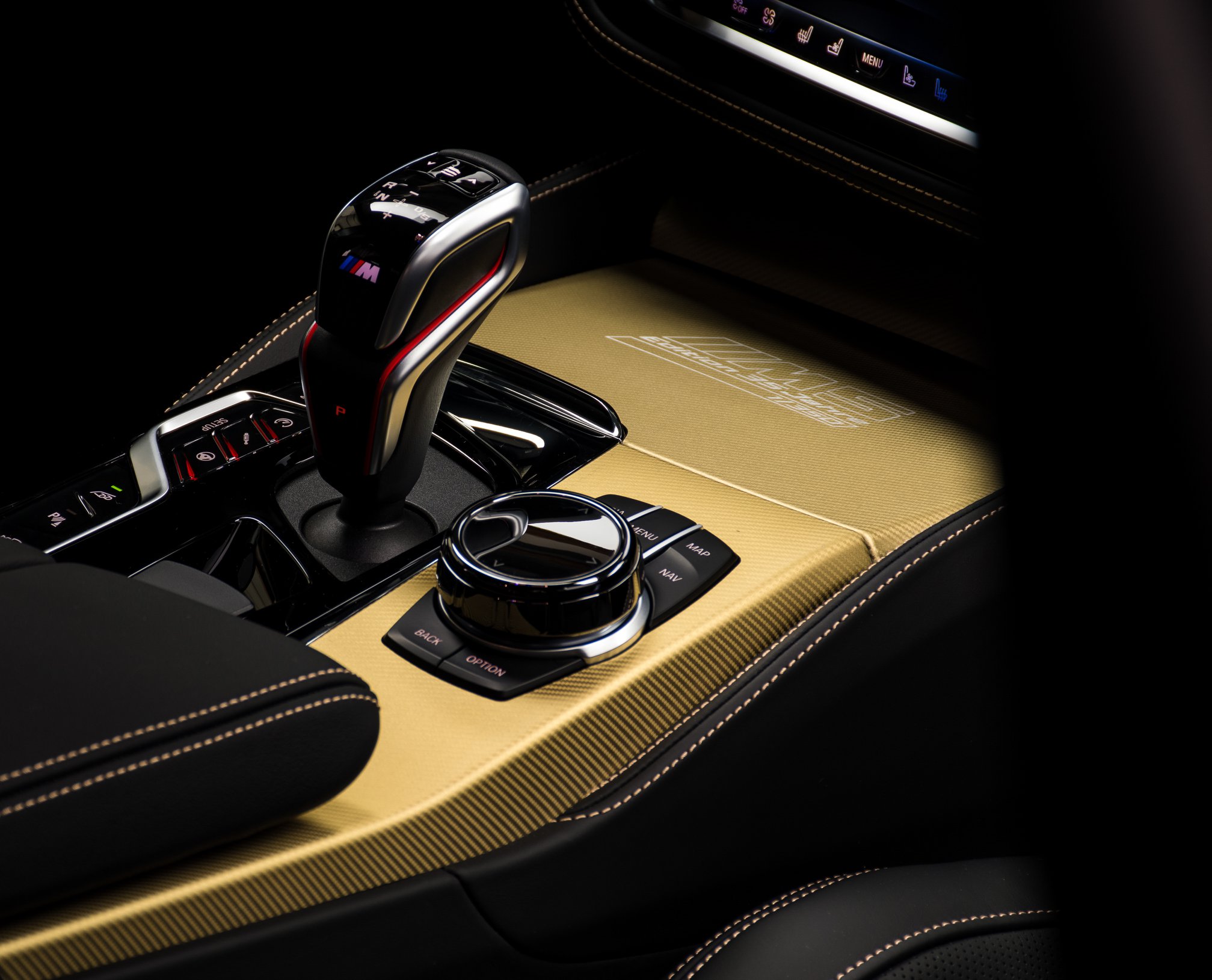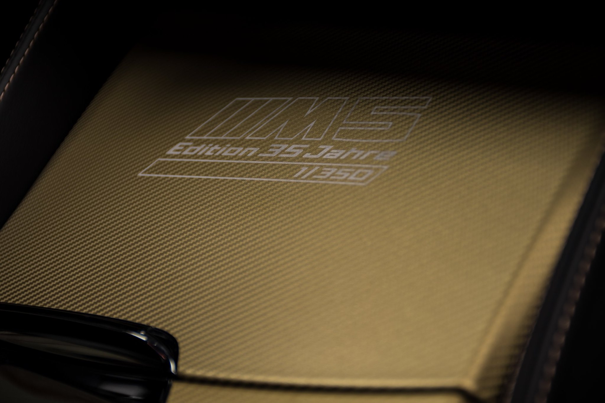 Gold ist auch im Innenraum präsent, denn das exklusive Sondermodell zum 35. Geburtstag des BMW M5 verfügt über einige farbige Kontraste in der vielleicht edelsten aller Farben. Die BMW Individual Lederausstattung Merino Black wird mit gelben Kontrastnähten kombiniert, noch wichtiger sind aber die Interieurleisten mit ihrer golden unterlegten Aluminium-Carbon-Struktur. Auf dem Cupholder vor dem Gangwahlhebel weist ein “M5 Edition 35 Jahre 1/350”-Schriftzug auf die Exklusivität des Fahrzeugs hin, auch die Einstiegsleisten tragen eine entsprechende Aufschrift.