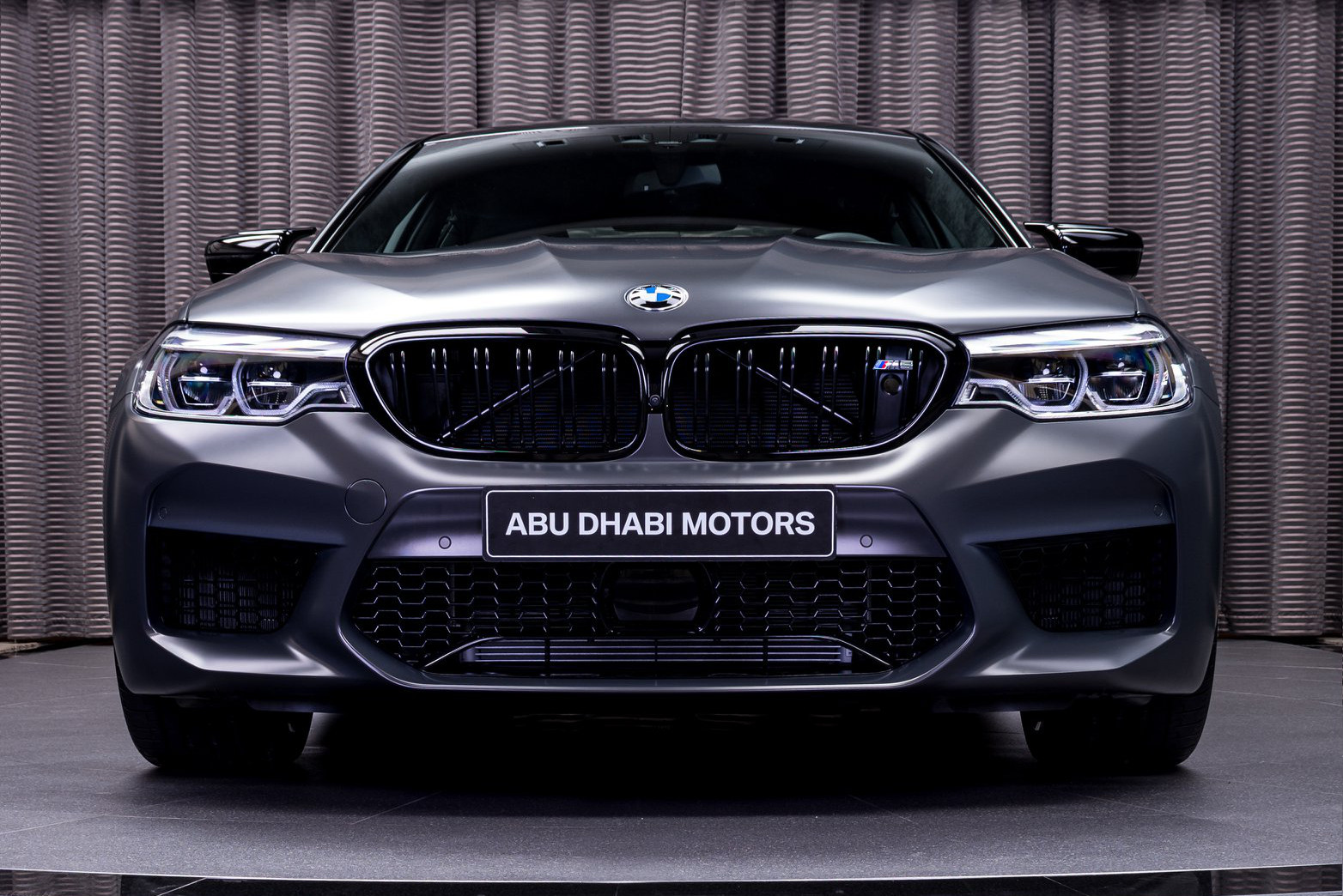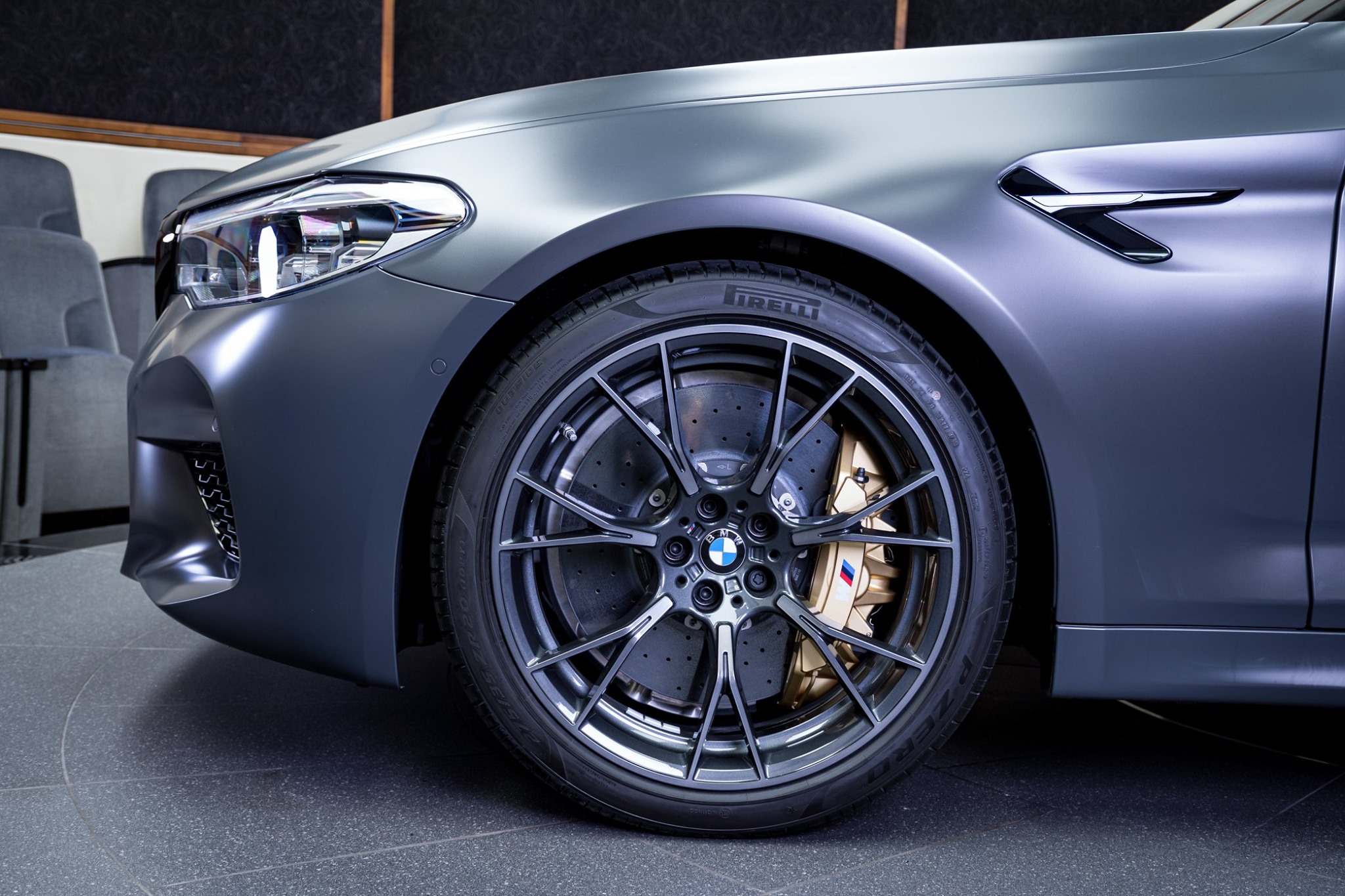 Wie beim M5 Competition üblich sind zahlreiche Exterieur-Details in Hochglanz-Schwarz ausgeführt. In Verbindung mit der dunklen und matten Lackierung in Frozen Dark Grey ergibt sich ein düsterer Auftritt, der bei so manchem Betrachter in Erinnerung bleiben dürfte. Natürlich sind auch die 20-Zoll-Felgen im Y-Speichen-Design in Schwarz gehalten – einen der wenigen farbigen Akzente setzen die goldenen Bremssättel der Carbon-Keramik-Bremsanlage.