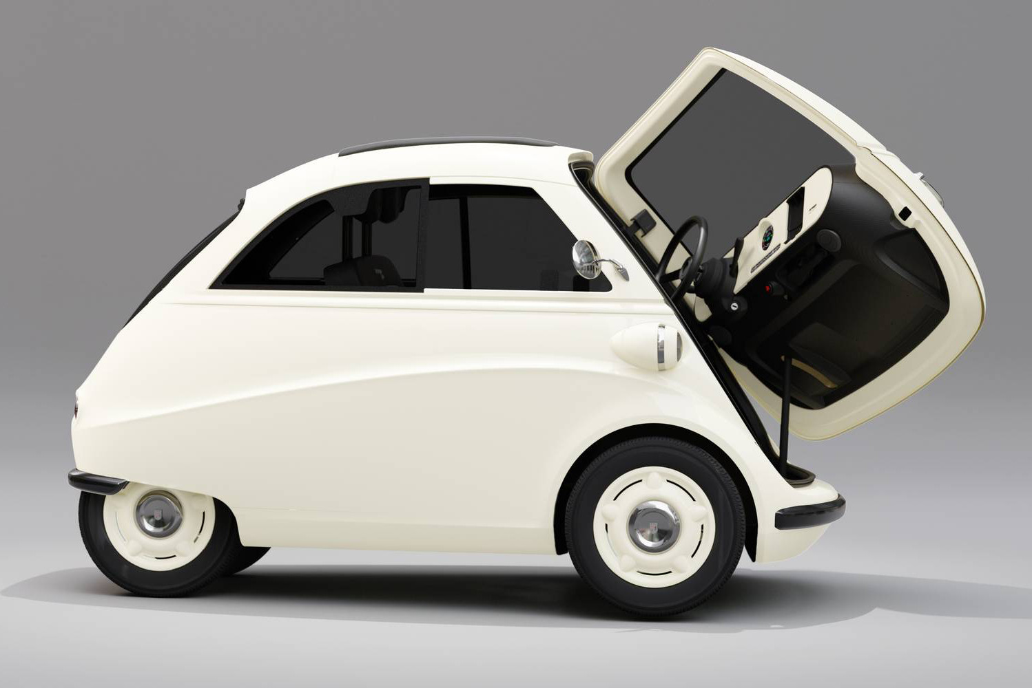 Das Design der BMW Isetta wird dabei nicht nur auf den ersten Blick übernommen, auch Details wie die Ladebuchse am Heck erinnern Kenner an das Original aus den 50er Jahren des letzten Jahrhunderts: Dort, wo jetzt Strom fließt, saß früher der Tankdeckel. Noch markanter ist aber zweifellos die Fronttür, über die die beiden Insassen in den Innenraum gelangen können.