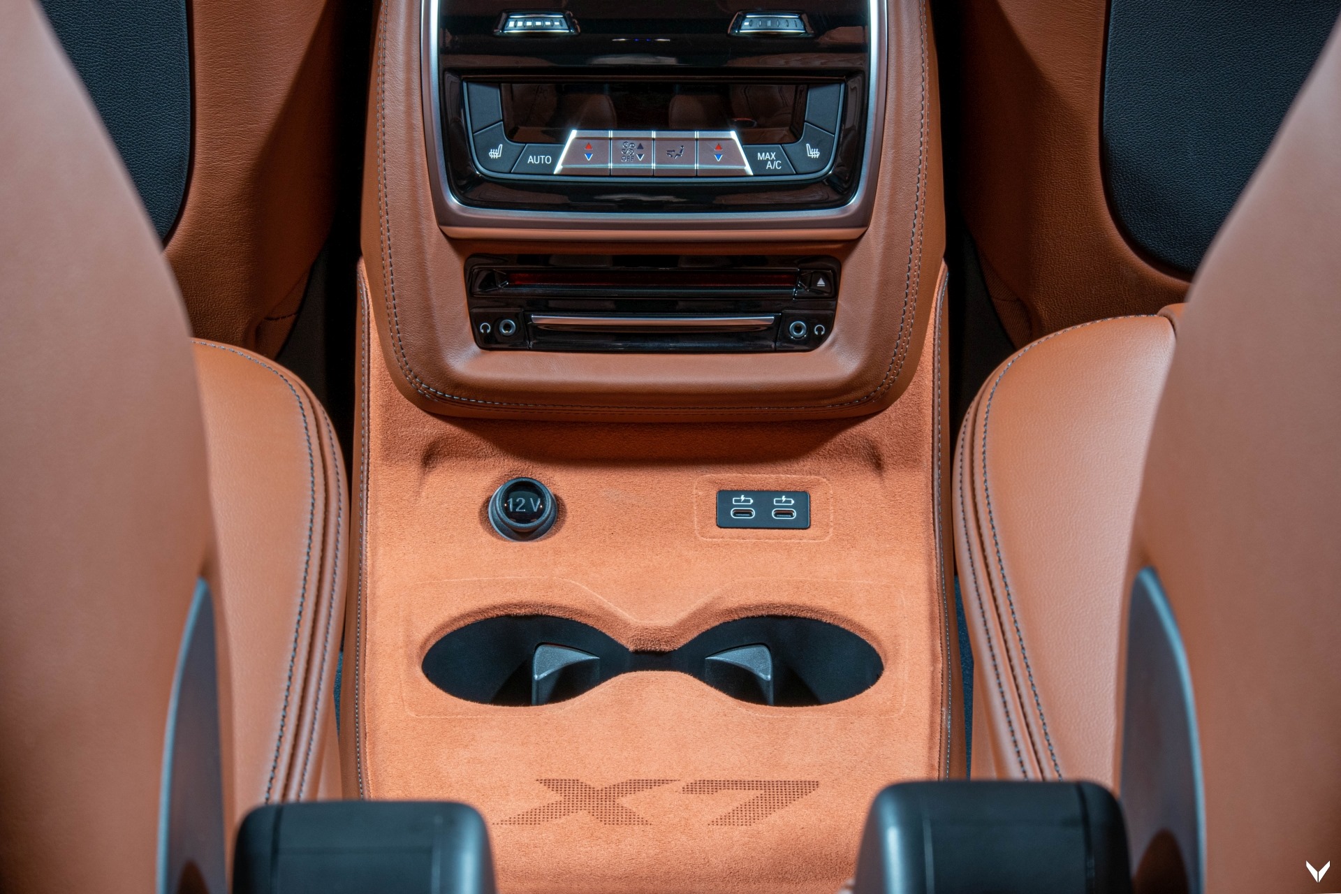 Der hier gezeigte Vilner BMW X7 M50d hat unter anderem eine auch in der zweiten Reihe mit viel Alcantara und abgestepptem Leder verkleidete Mittelkonsole erhalten. Besonders hochwertige Kissen für die Kopfstützen und der zum Teil mit abgestepptem Leder bezogene Dachhimmel werten den Innenraum zusätzlich auf. Ein weiteres Highlight sind die komplett mit Leder verkleideten Tür-Innenseiten, die auch im untersten Bereich noch ebenso hochwertig sind wie im oberen Drittel.