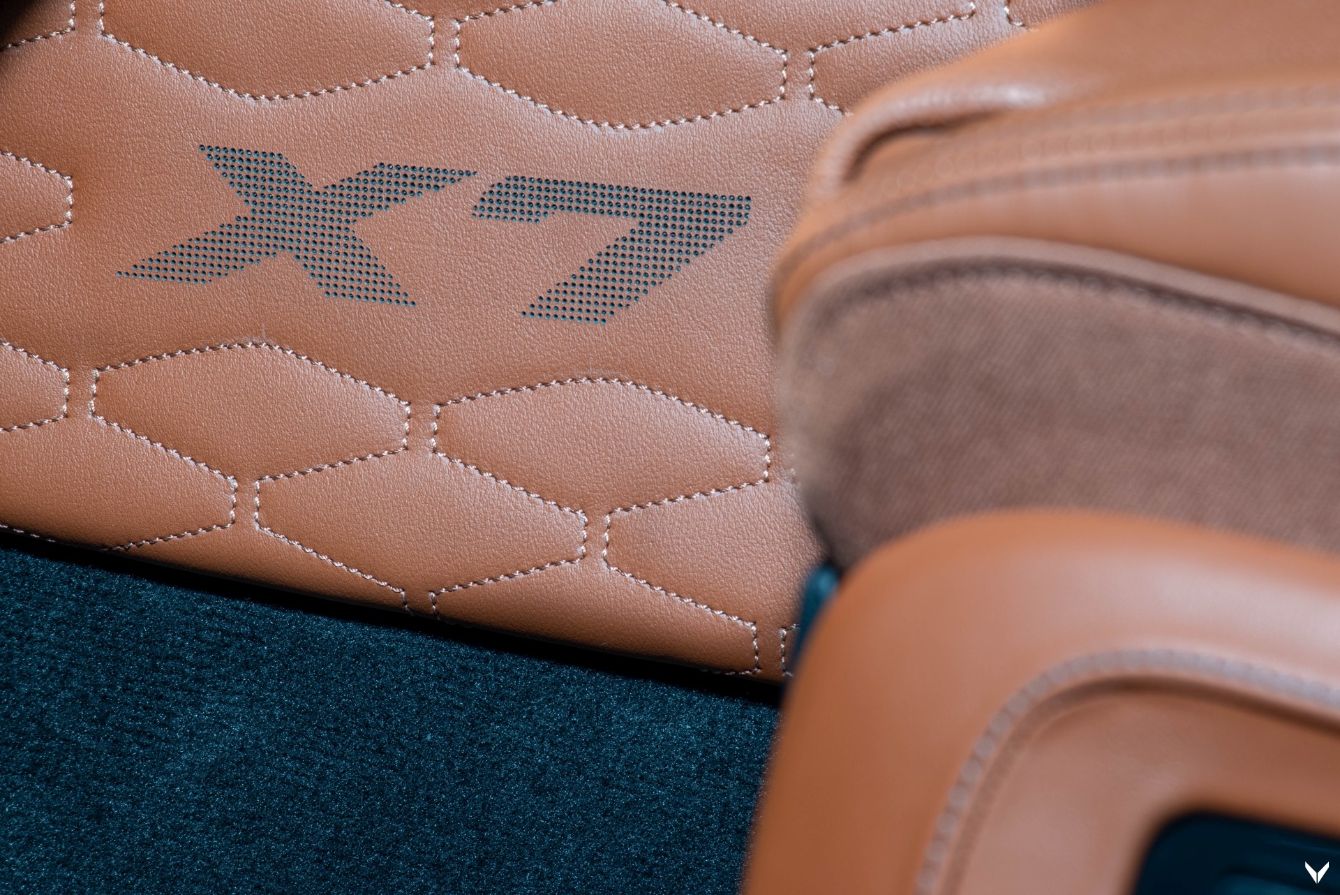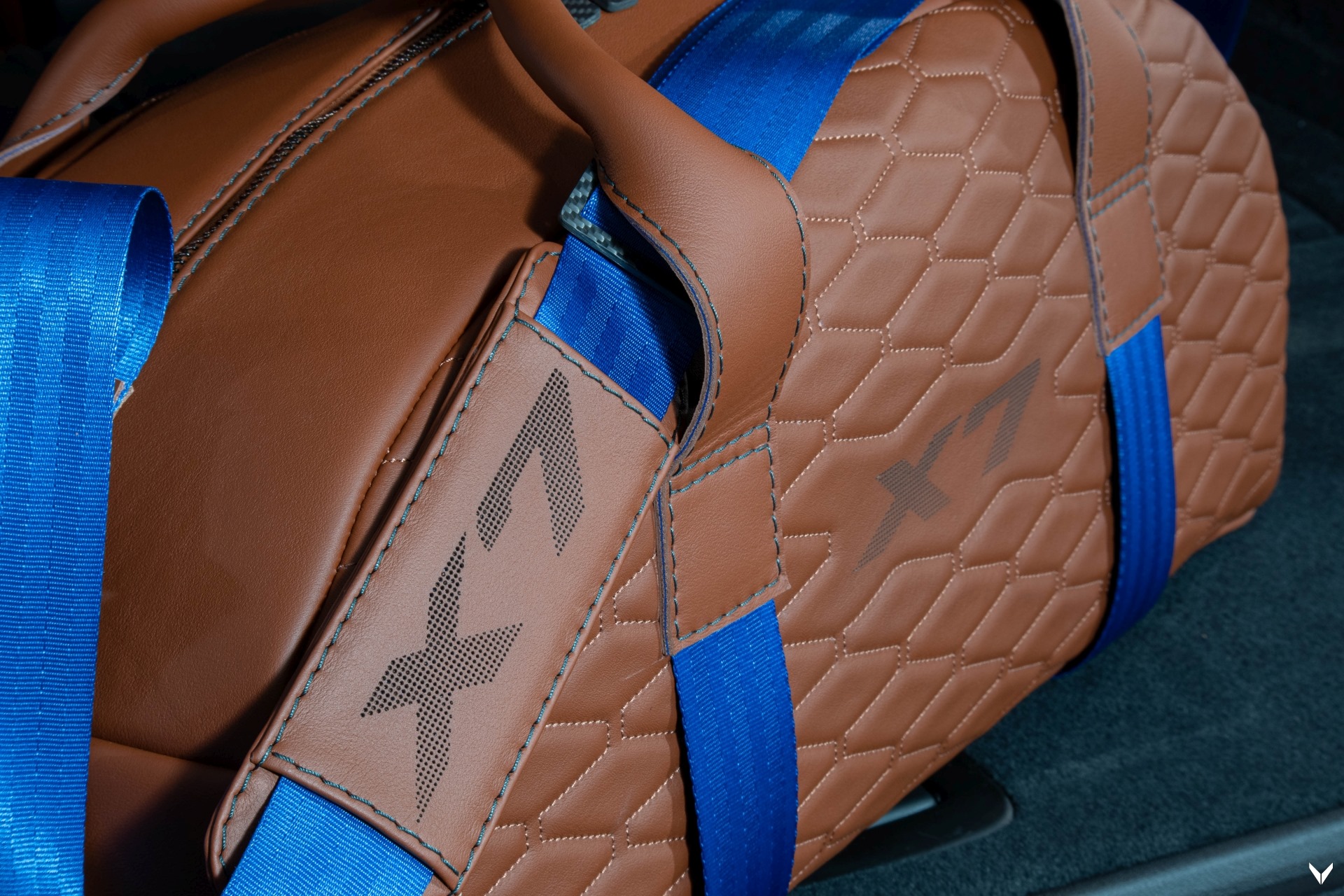 Einen farbigen Akzent setzen die leuchtend-blauen Sicherheitsgurte, die auch bei der von Vilner entworfenen Leder-Tasche zum Einsatz kommen. Die Tasche gibt dem Besitzer die Möglichkeit, auch außerhalb des Fahrzeugs auf seinen einzigartigen X7 hinzuweisen.