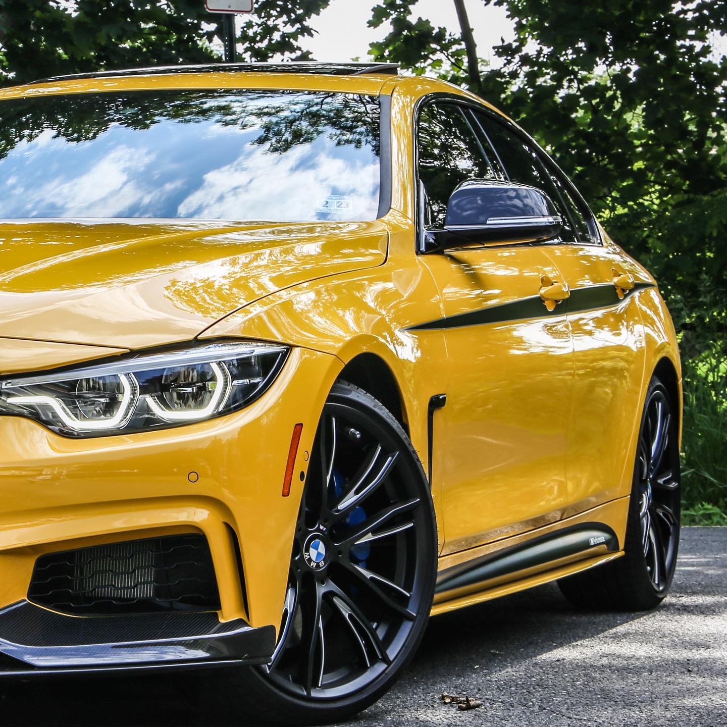 Weitere sportliche Akzente setzen das M Sportpaket und einige Tuning-Teile aus dem Programm von BMW M Performance. Letztere sind in Hochglanz-Schwarz gehalten und grenzen sich entsprechend stark von der gelben Lackierung ab. Nieren, Frontsplitter, Außenspiegel, Heckspoiler-Lippe und die seitliche Dekor-Beklebung bieten dem Auge Abwechslung von der gelben Individual-Farbe. Auch die überwiegend schwarzen Bicolor-Felgen passen perfekt zum gelb-schwarzen Look des viertürigen Coupés.