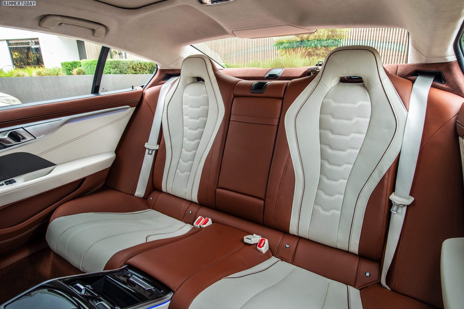 Im Innenraum des Rechtslenkers sehen wir die BMW Individual Volllederausstattung Merino in Elfenbeinweiß und Tartufo, die den edlen Auftritt stilsicher komplettiert.