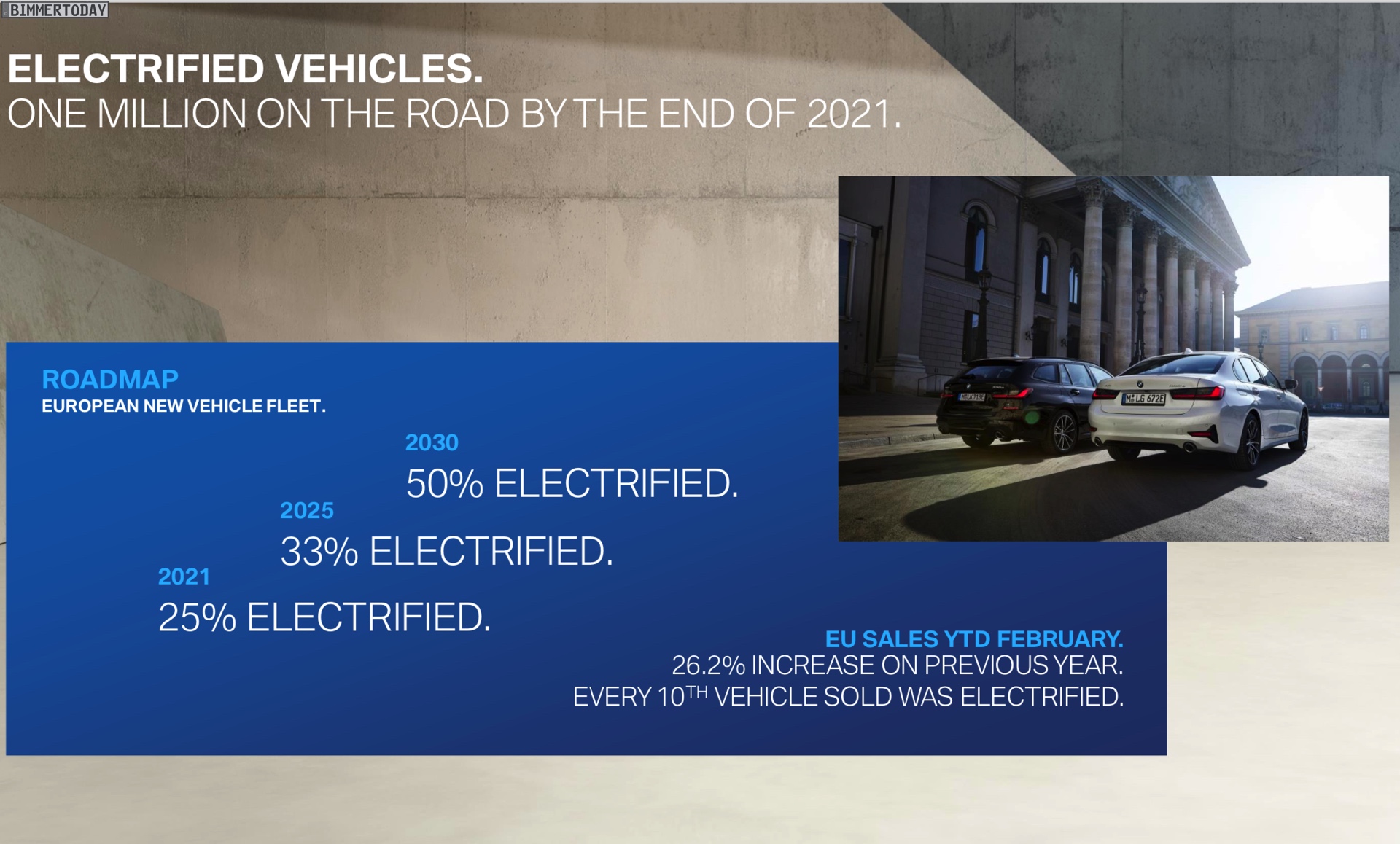 Der Motoren-Mix der europäischen BMW-Flotte wird sich in den nächsten Jahren weiter deutlich verändern. 50 Prozent aller Neuzulassungen sollen bis zum Jahr 2030 über einen elektrifizierten Antrieb verfügen, also entweder ein reines Elektroauto oder ein Plug-in-Hybrid sein. Aktuell bewegt sich dieser Anteil noch sehr weit unter 25 Prozent: Im Januar und Februar 2020 lag der Anteil nur bei rund 10 Prozent. Aber schon im kommenden Jahr 2021 soll die Marke von 25 Prozent erstmals erreicht werden.