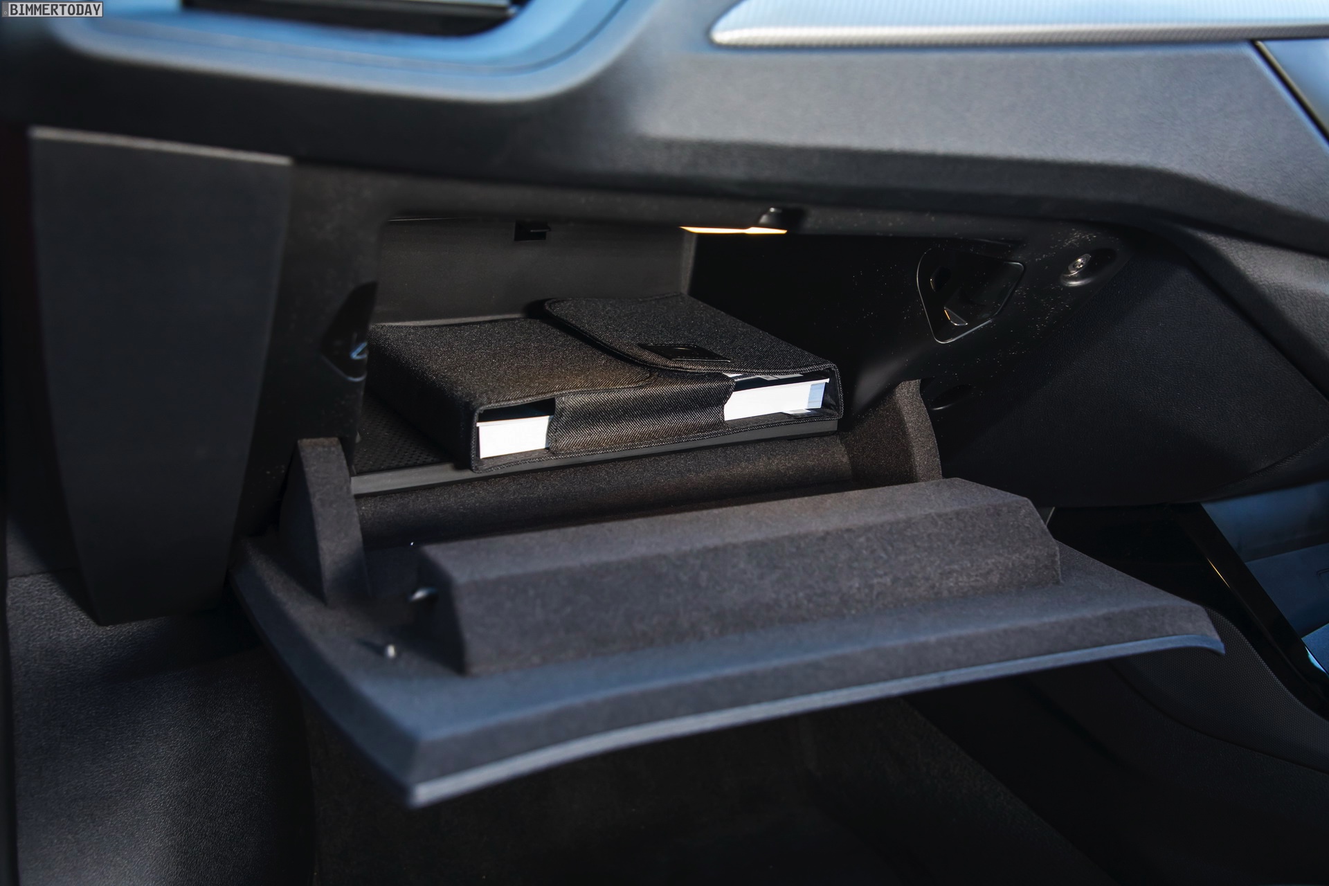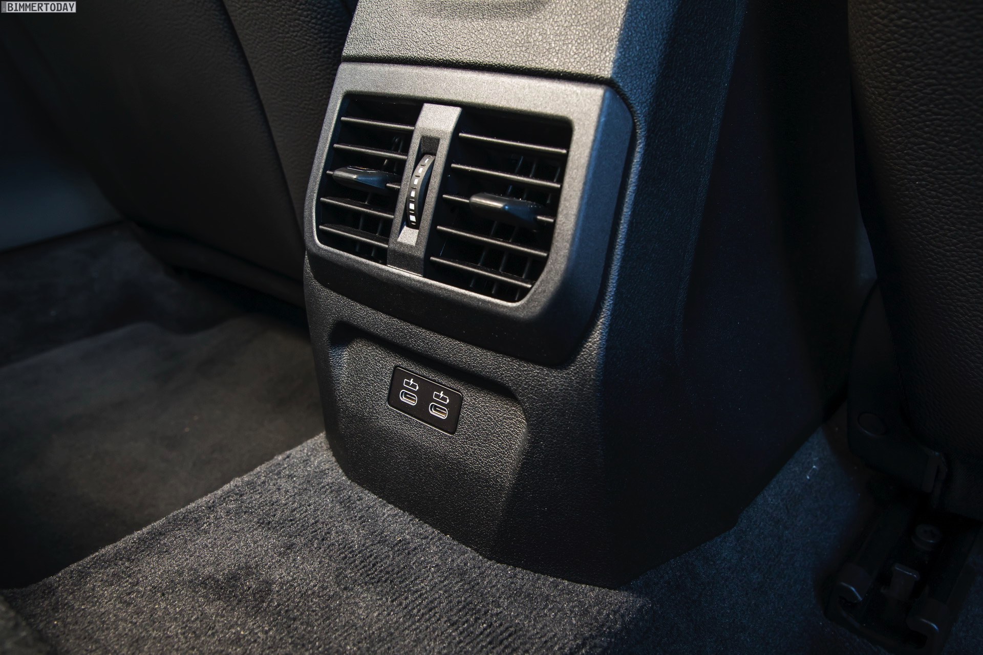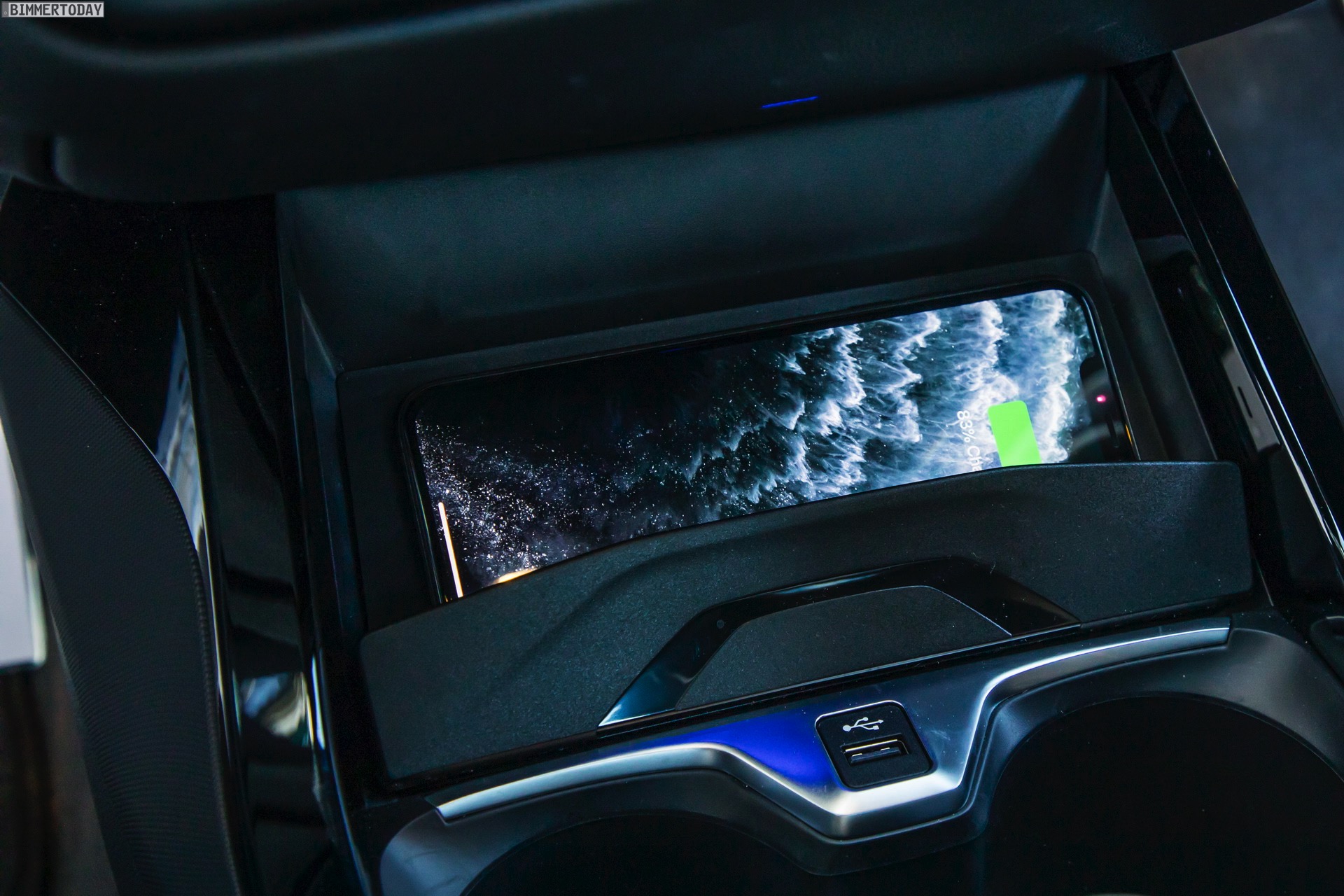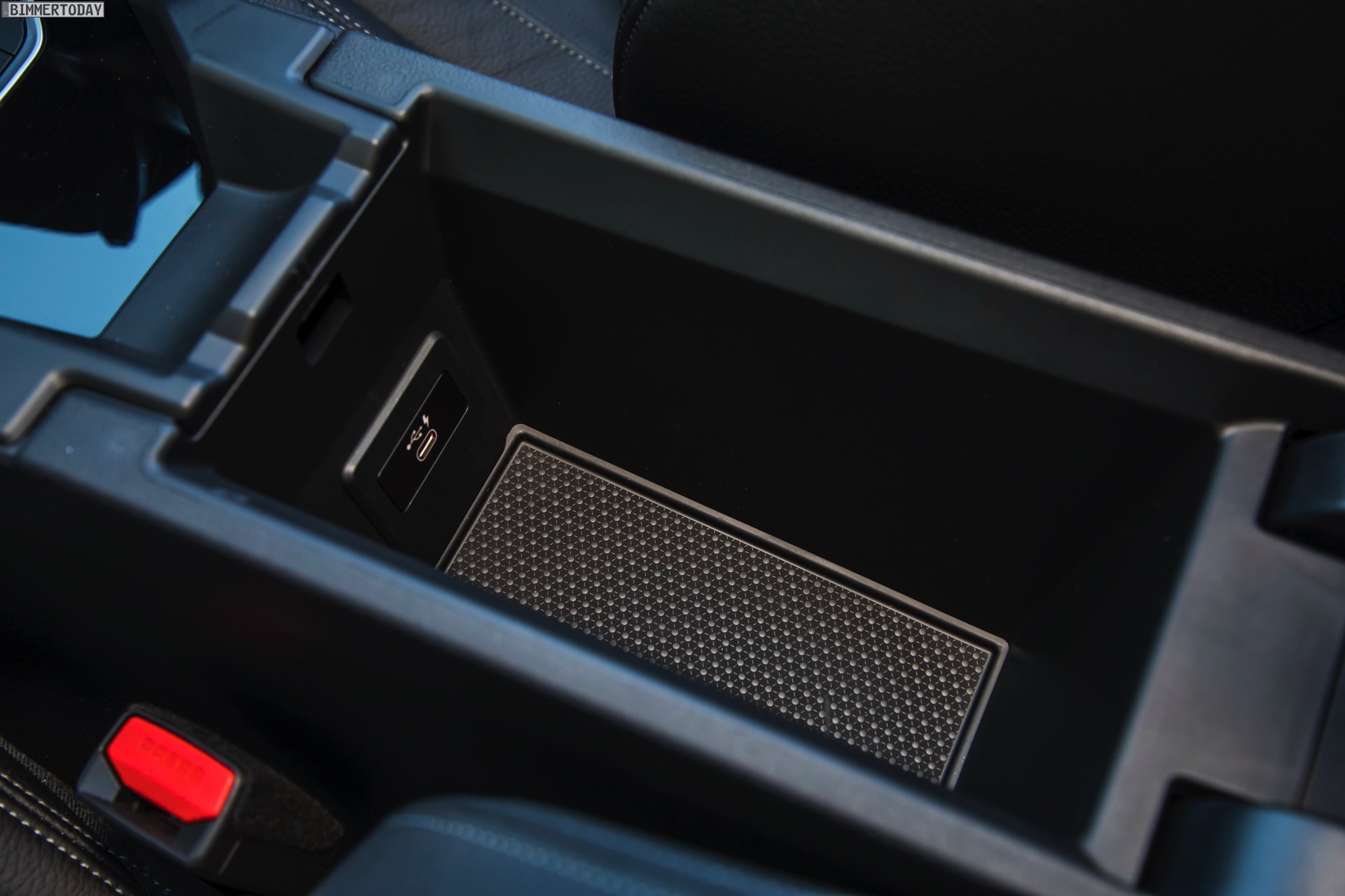 Auch vom Innenraum des Rechtslenkers mit schwarzer Lederausstattung Dakota und optionalen M Sportsitzen gibt es eine ganze Reihe von Fotos, die auch Details wie das Handschuhfach, die Ablagefläche zum kabellosen Laden von Smartphones oder die Aufbewahungsmöglichkeit mit USB-C-Anschluss unterhalb der Mittelarmlehne zeigen: