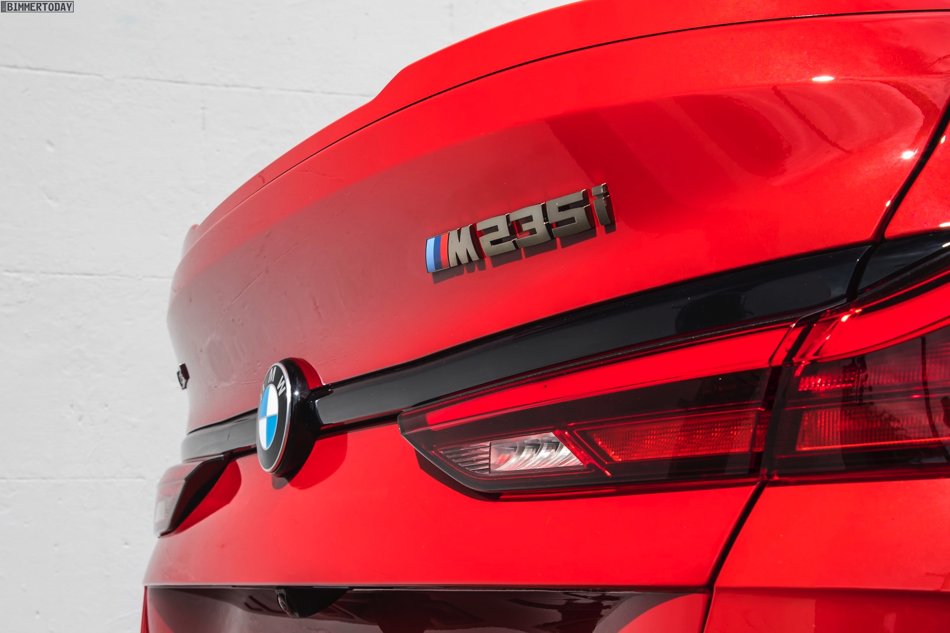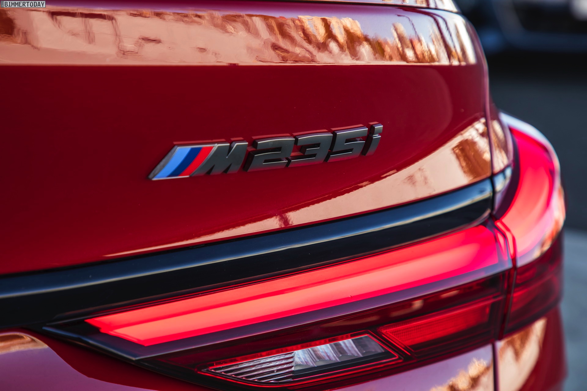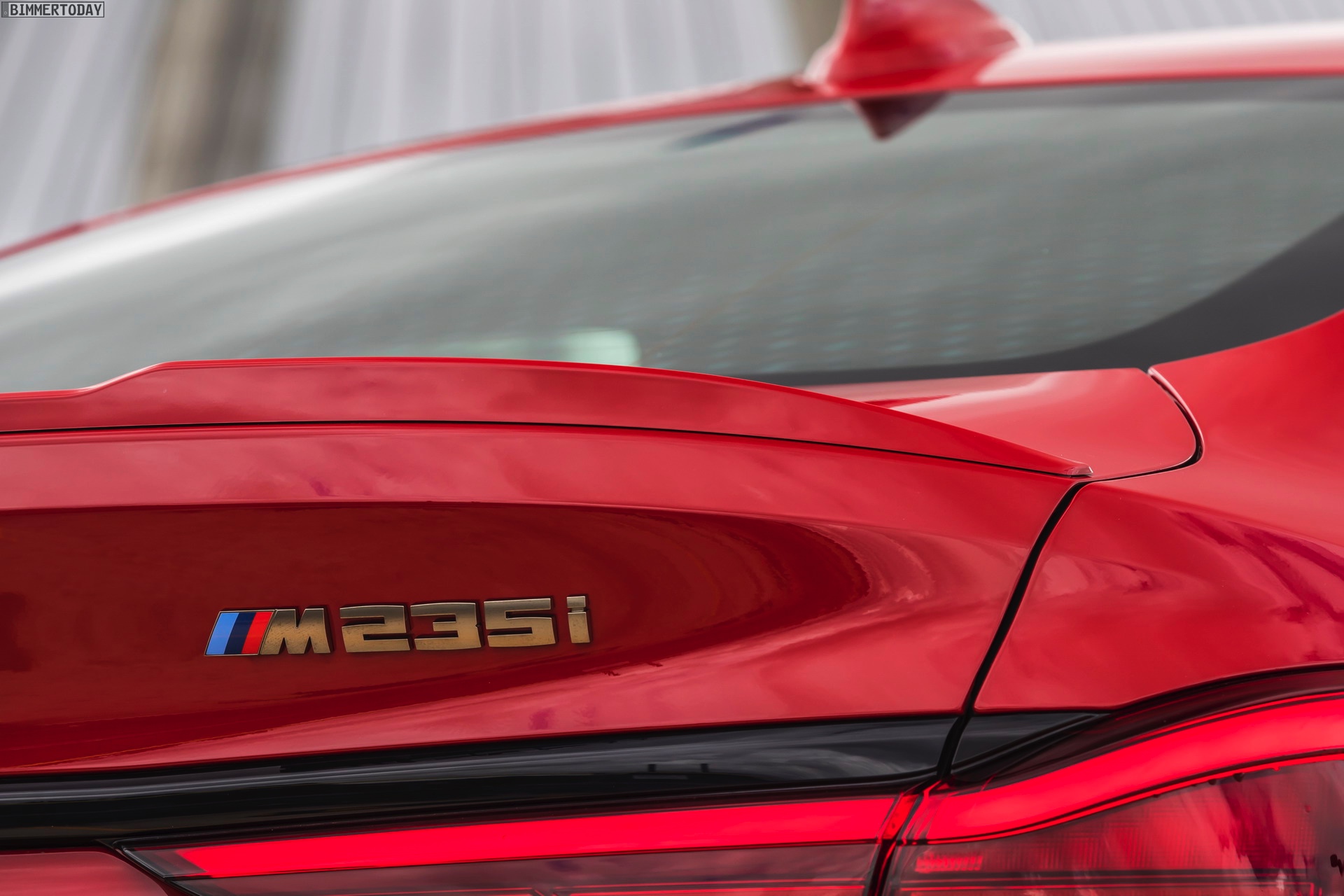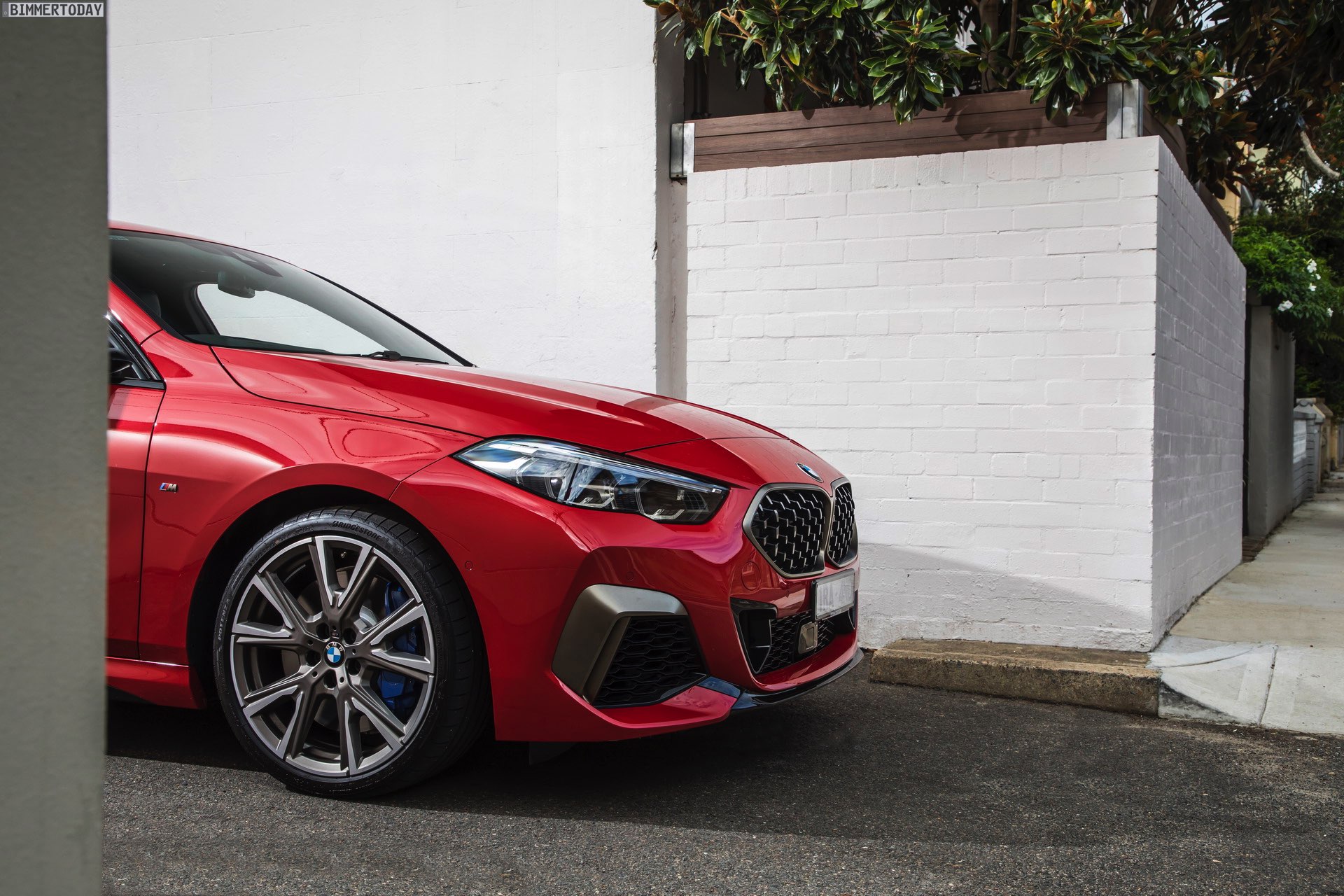 Während wir das kräftige Rot am BMW M235i Gran Coupé bisher stets in Verbindung mit M Performance Paket, dementsprechend erweiterter Shadow Line und folglich auch mit schwarz lackierten Mesh-Nieren zu sehen bekommen haben, zeigen uns die Australier erstmals eine Konfiguration mit serienmäßigen Design-Akzenten in Cerium Grey. Sowohl die Nieren als auch die seitlichen Lufteinlässe der Frontschürze, die Außenspiegel-Kappen und Endrohr-Blenden sowie der Modellschriftzug am Heck sind in der für M Performance-Modelle reservierten Farbe gehalten und grenzen den M235i so noch stärker von den schwächeren Modellen ab.