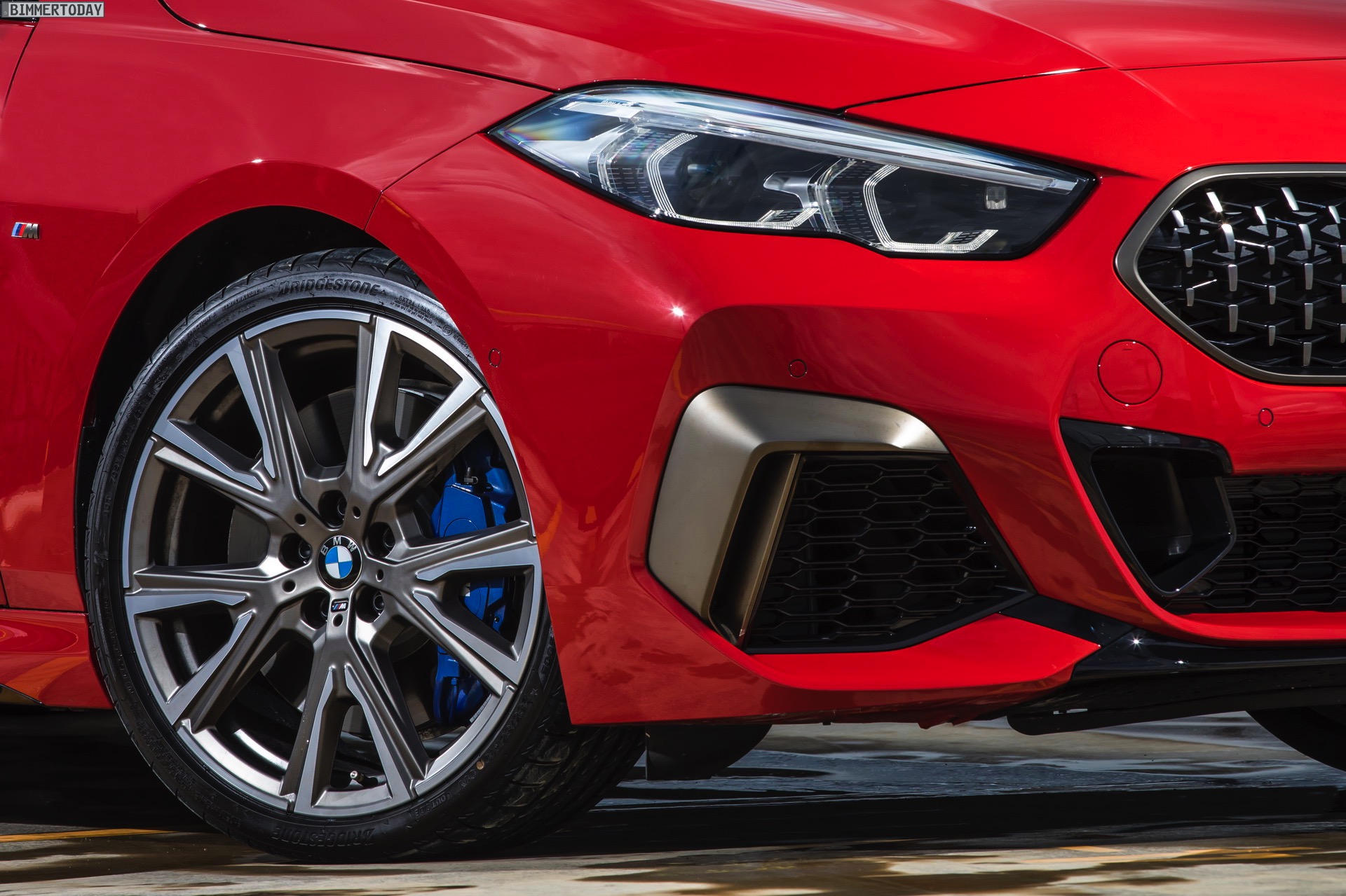 Elemente in Cerium Grey finden sich auch an den 19 Zoll großen M Leichtmetallrädern V-Speiche 557 M Bicolor, die nur für das BMW M235i Gran Coupé erhältlich sind und in Deutschland 650 Euro Aufpreis gegenüber den serienmäßigen 18-Zöllern kosten. Hinter den Felgen lassen sich die blauen Bremssättel der M Sportbremse erkennen, die beim M235i immer verbaut wird und für die schwächeren Modelle optional erhältlich ist.
