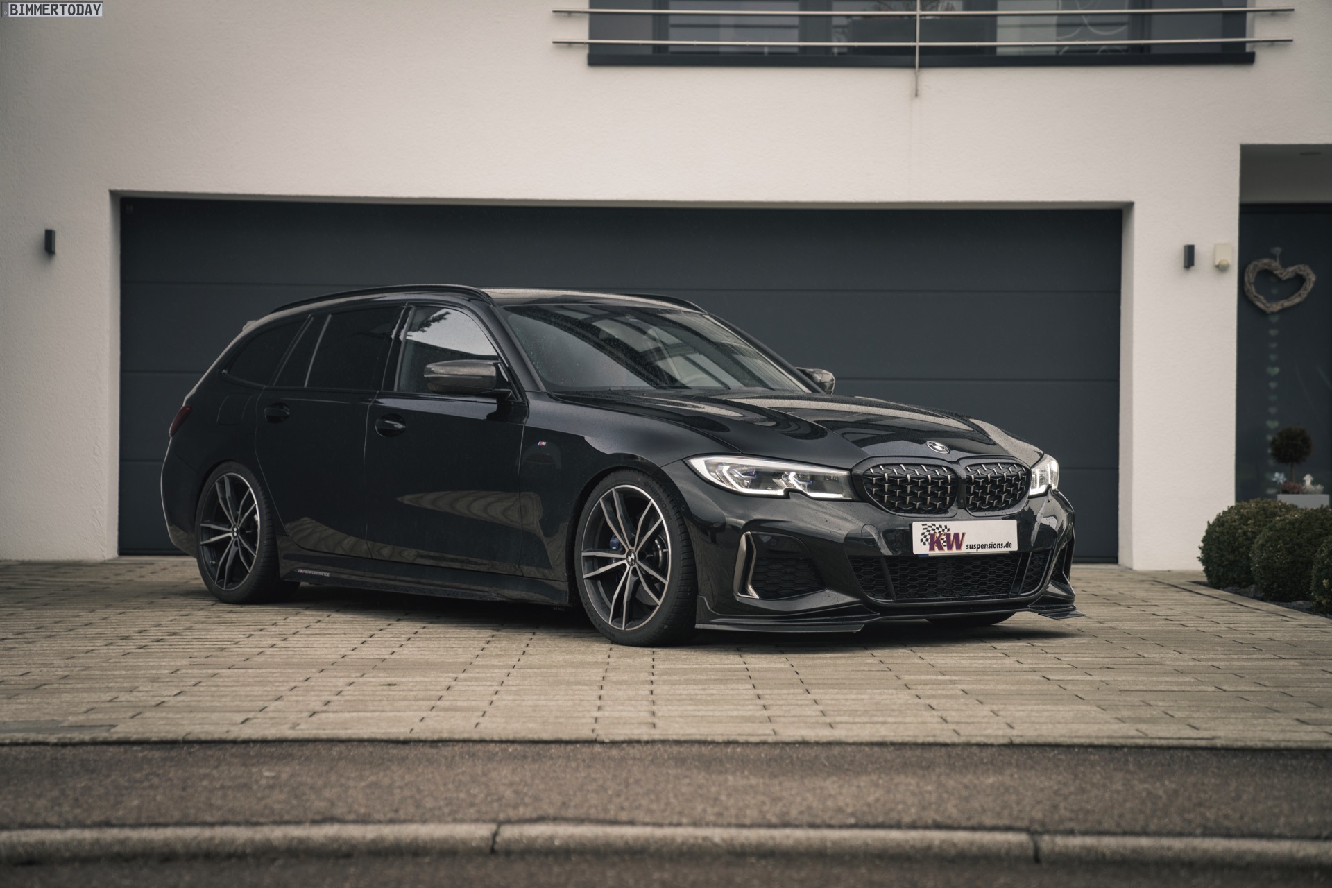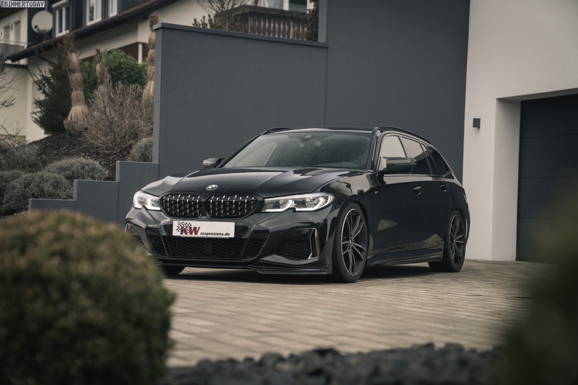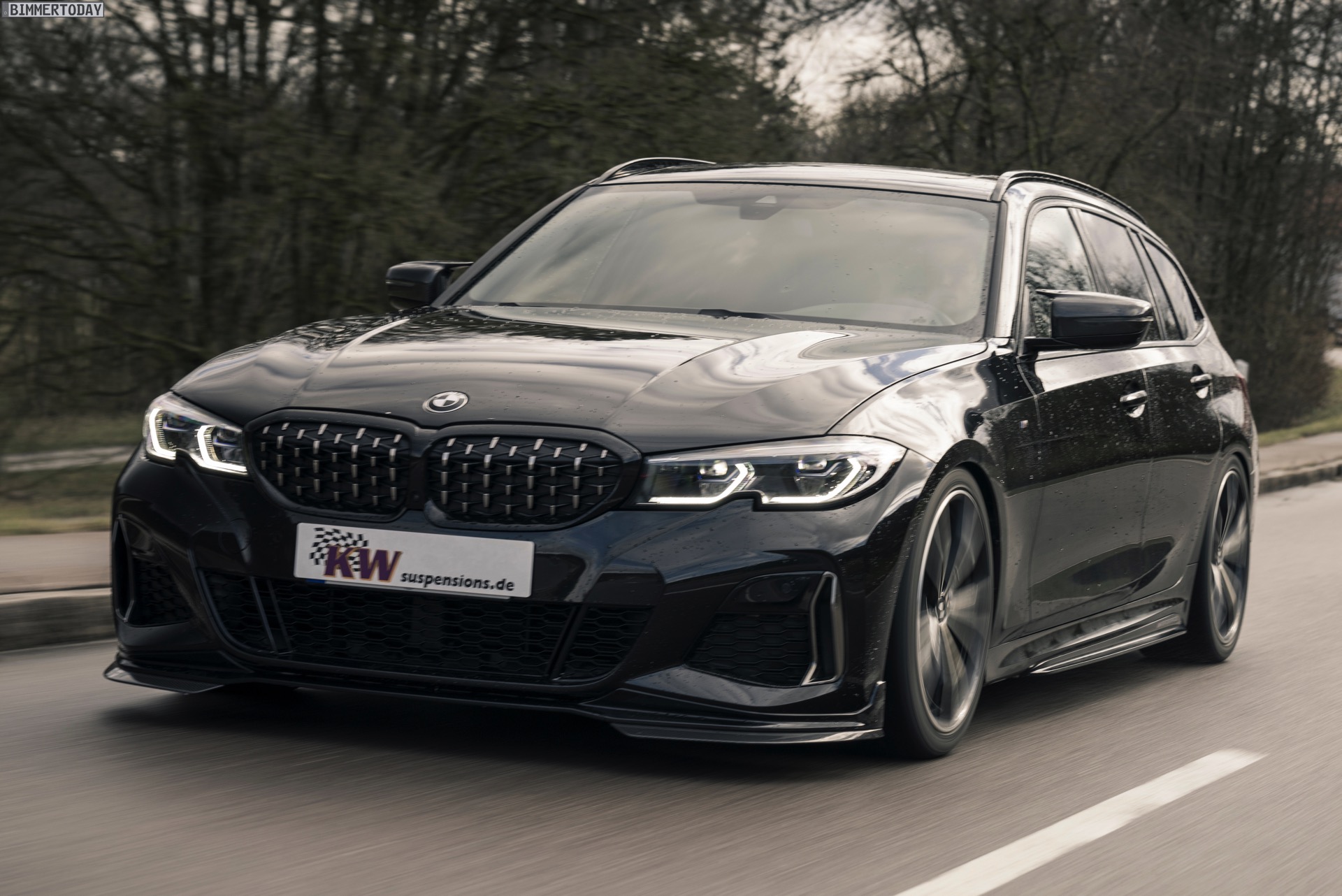 Wie die ersten Fotos zeigen, schließt diese Definition den BMW M340i Touring und seinen Diesel-Bruder M340d ausdrücklich mit ein. Der an seiner Mesh-Niere gut erkennbare Power-Kombi glänzt auf den Bildern ganz in Schwarz, trägt die Shadow Line mit erweiterten Umfängen und zusätzlich auch noch einige M Performance Tuning-Parts. Der eigentliche Hingucker ist aber die Nähe zum Asphalt, denn beim hier gezeigten G21 ist auch ein KW Gewindefahrwerk verbaut. So sind vorne wie hinten 40 bis 60 Millimeter Tieferlegung möglich – selbstverständlich mit Teilegutachten und problemlos eintragbar.