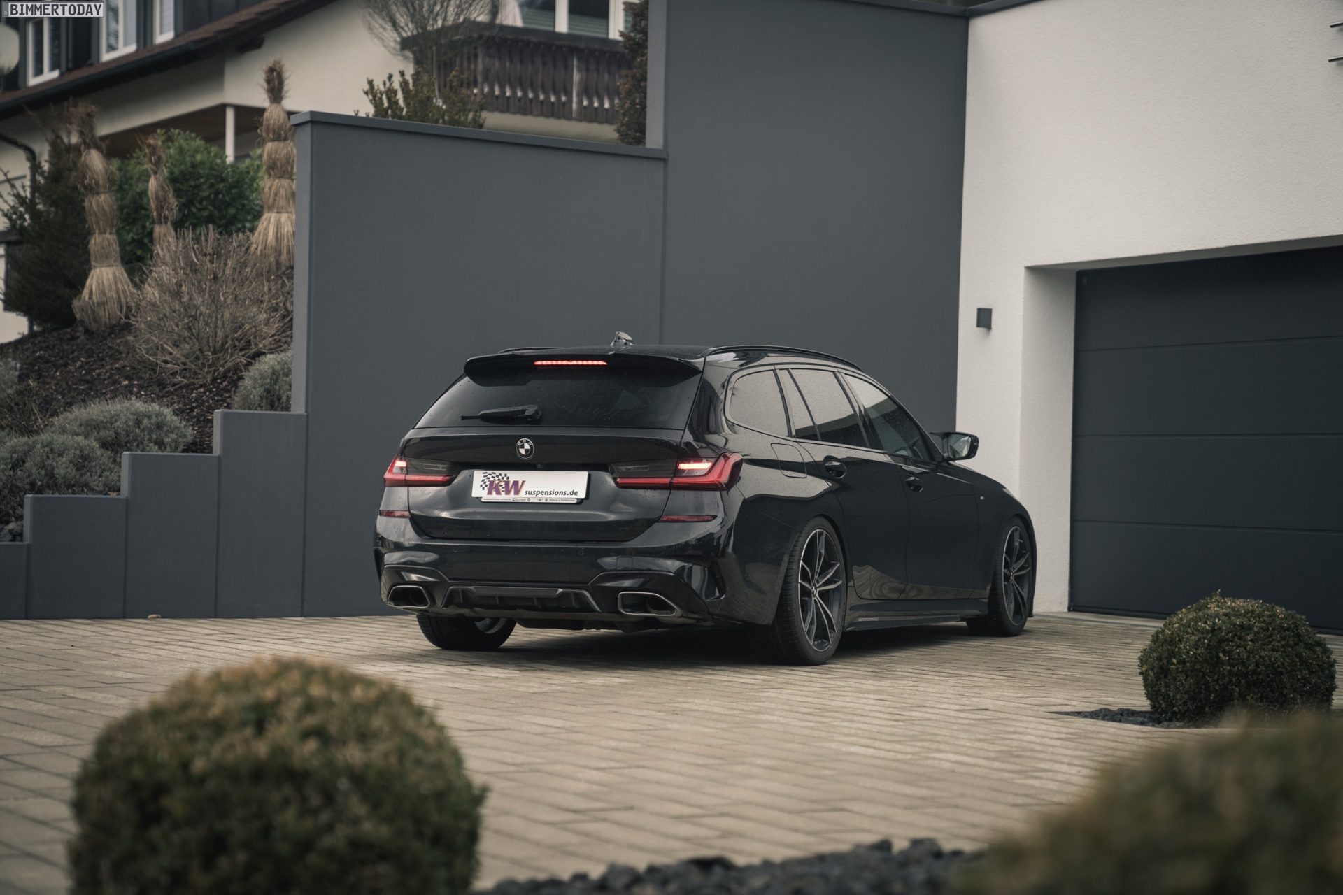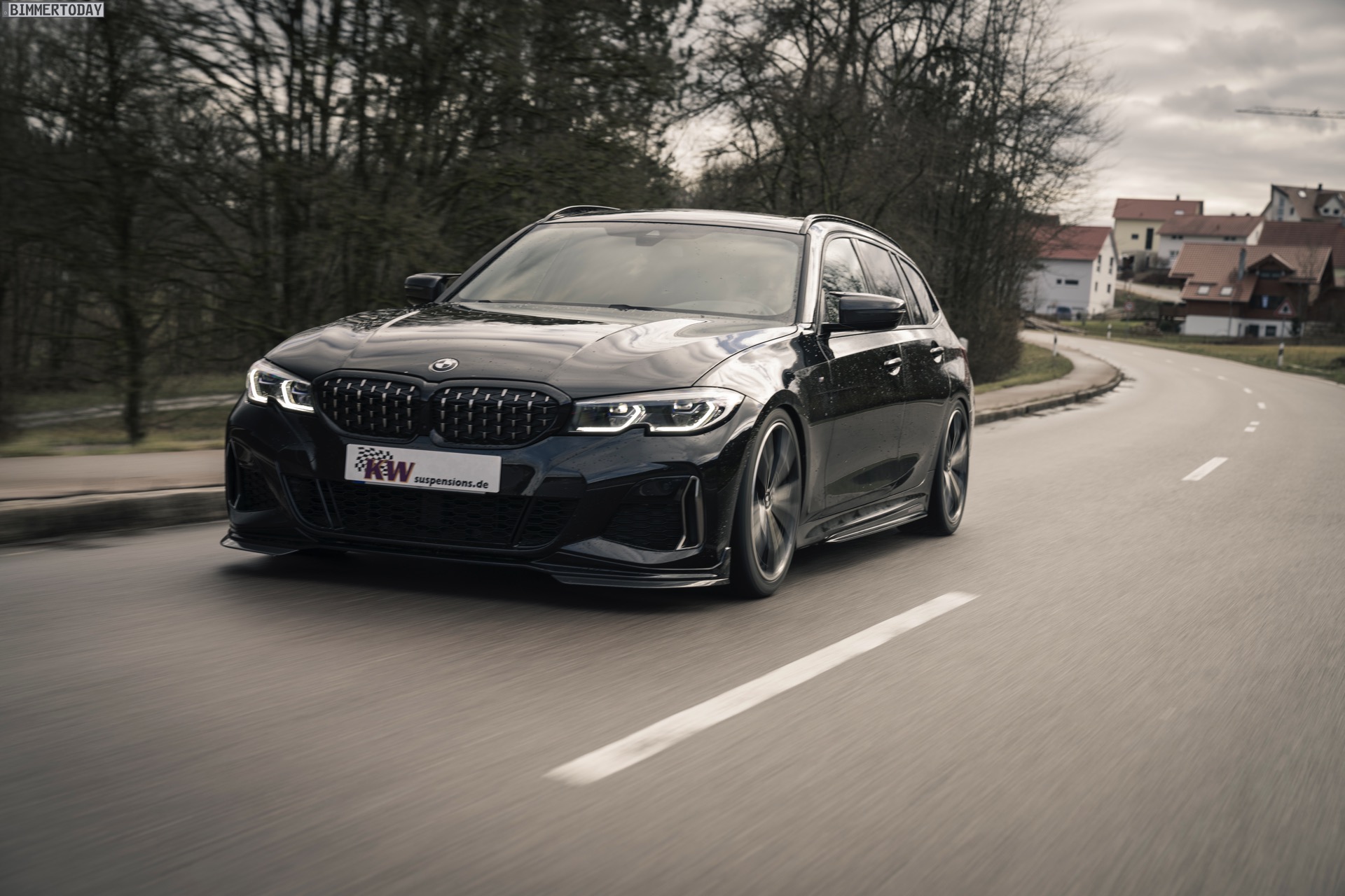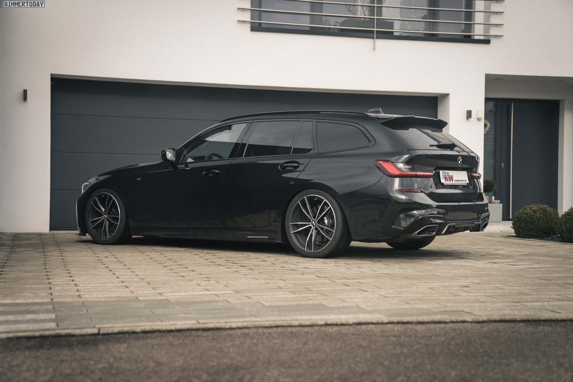 Wie die ersten Fotos zeigen, schließt diese Definition den BMW M340i Touring und seinen Diesel-Bruder M340d ausdrücklich mit ein. Der an seiner Mesh-Niere gut erkennbare Power-Kombi glänzt auf den Bildern ganz in Schwarz, trägt die Shadow Line mit erweiterten Umfängen und zusätzlich auch noch einige M Performance Tuning-Parts. Der eigentliche Hingucker ist aber die Nähe zum Asphalt, denn beim hier gezeigten G21 ist auch ein KW Gewindefahrwerk verbaut. So sind vorne wie hinten 40 bis 60 Millimeter Tieferlegung möglich – selbstverständlich mit Teilegutachten und problemlos eintragbar.