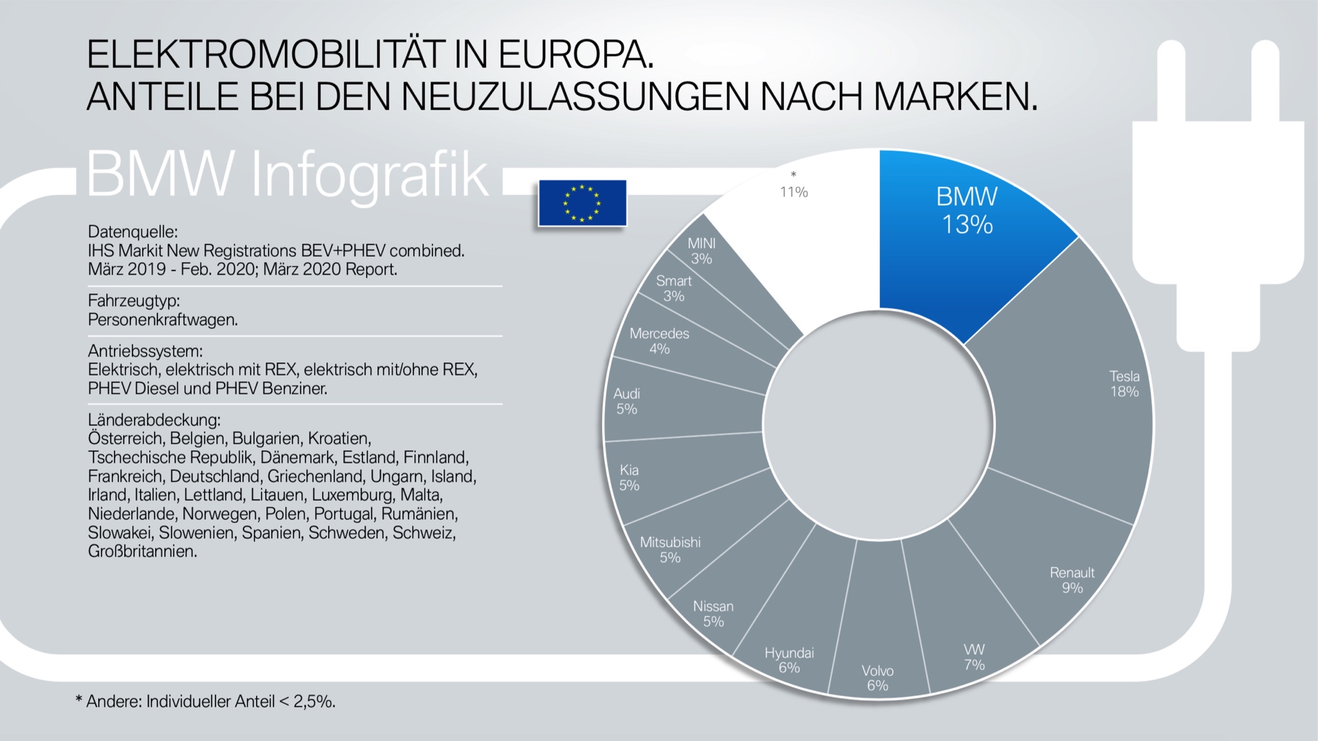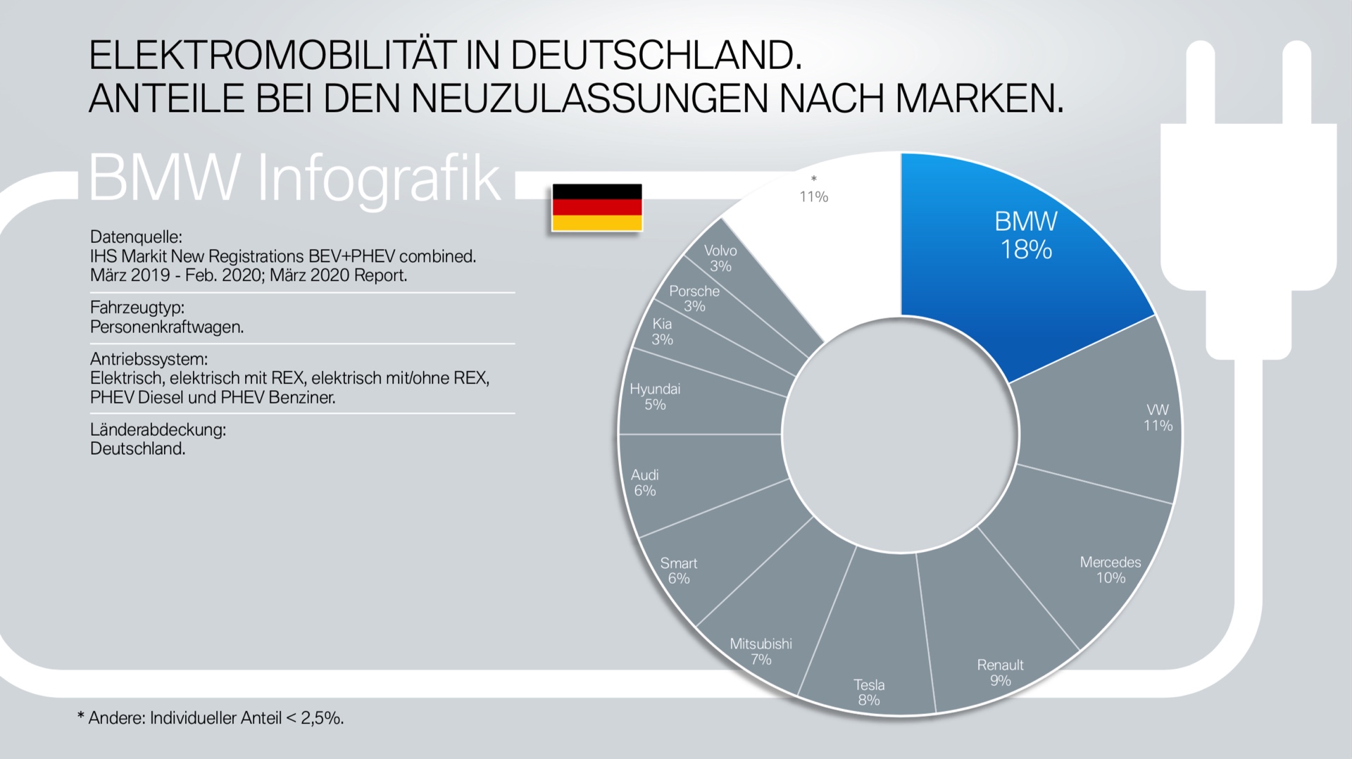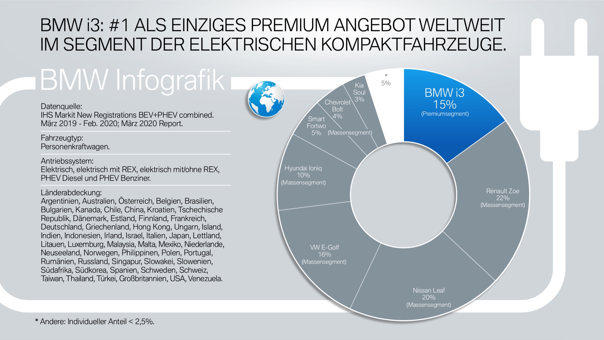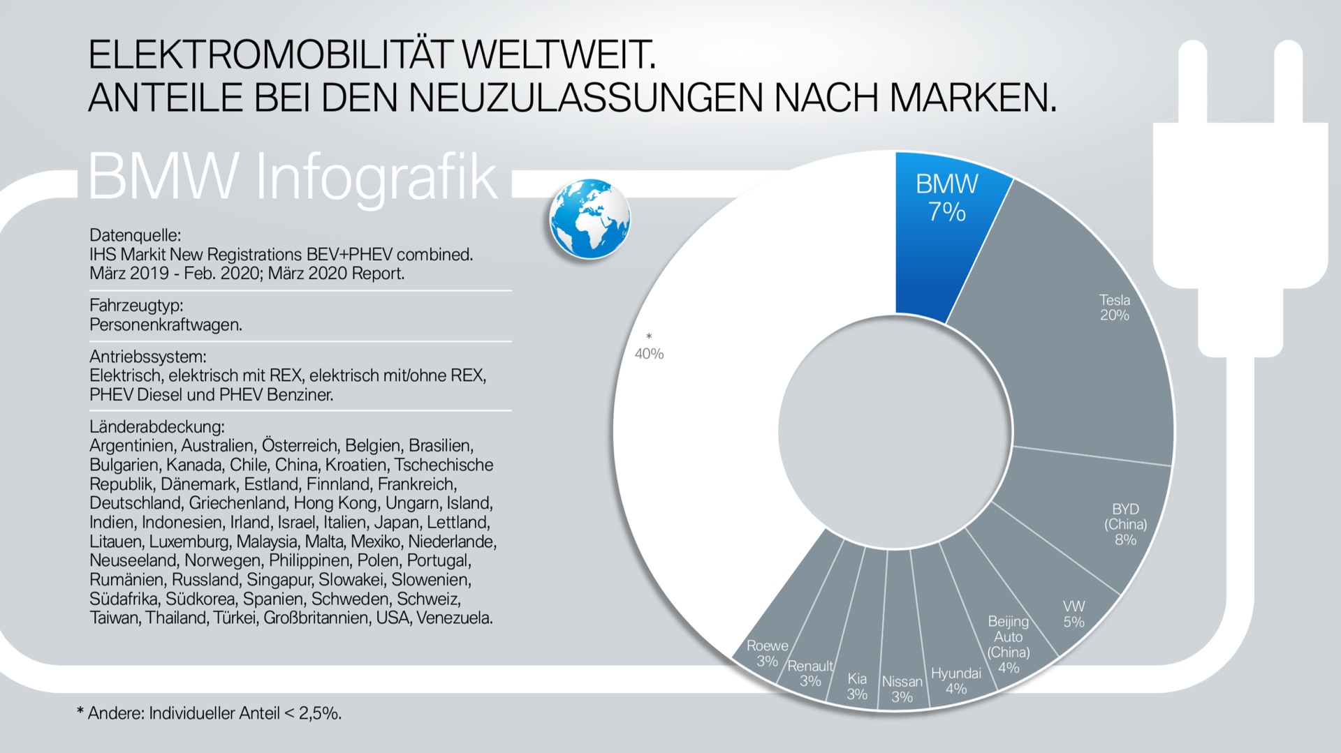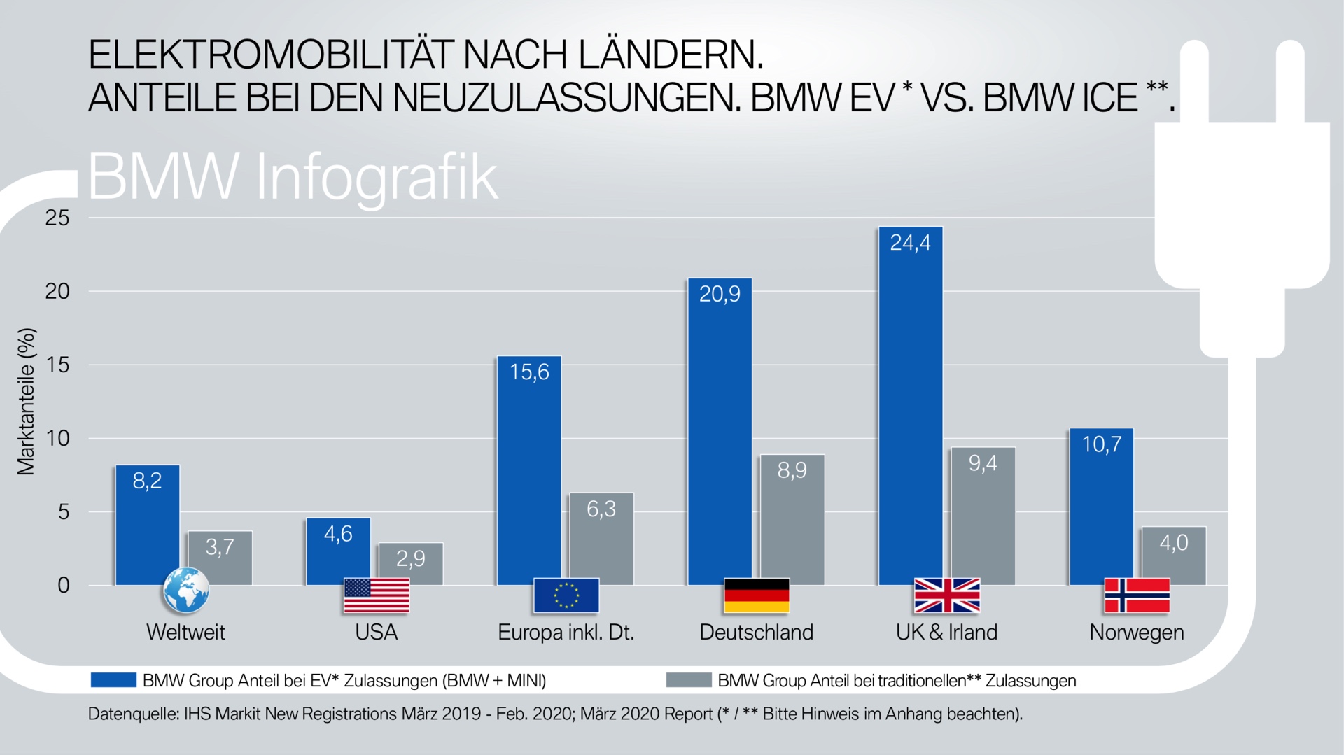 Das breite Angebot der BMW Elektroautos und Plug-in-Hybride hat sich im vergangenen Jahr deutlich auf die Marktanteile der BMW Group ausgewirkt. Von März 2019 bis Februar 2020 lag der Anteil der Münchner an den weltweiten Neuzulassungen von Benzinern und Dieseln bei 3,7 Prozent – unter den Elektroautos und Plug-in-Hybriden lag der Anteil mit 8,2 Prozent mehr als doppelt so hoch! Ein ganz ähnliches Bild wie bei den weltweiten Zahlen zeigt sich auch beim Blick auf wichtige Einzelmärkte.