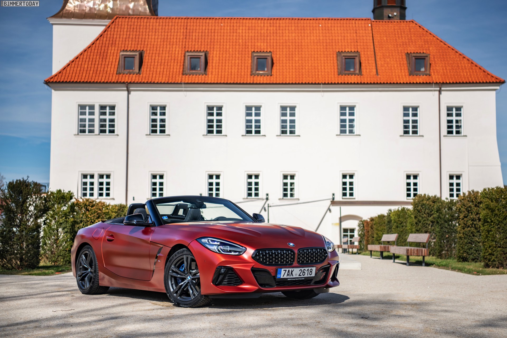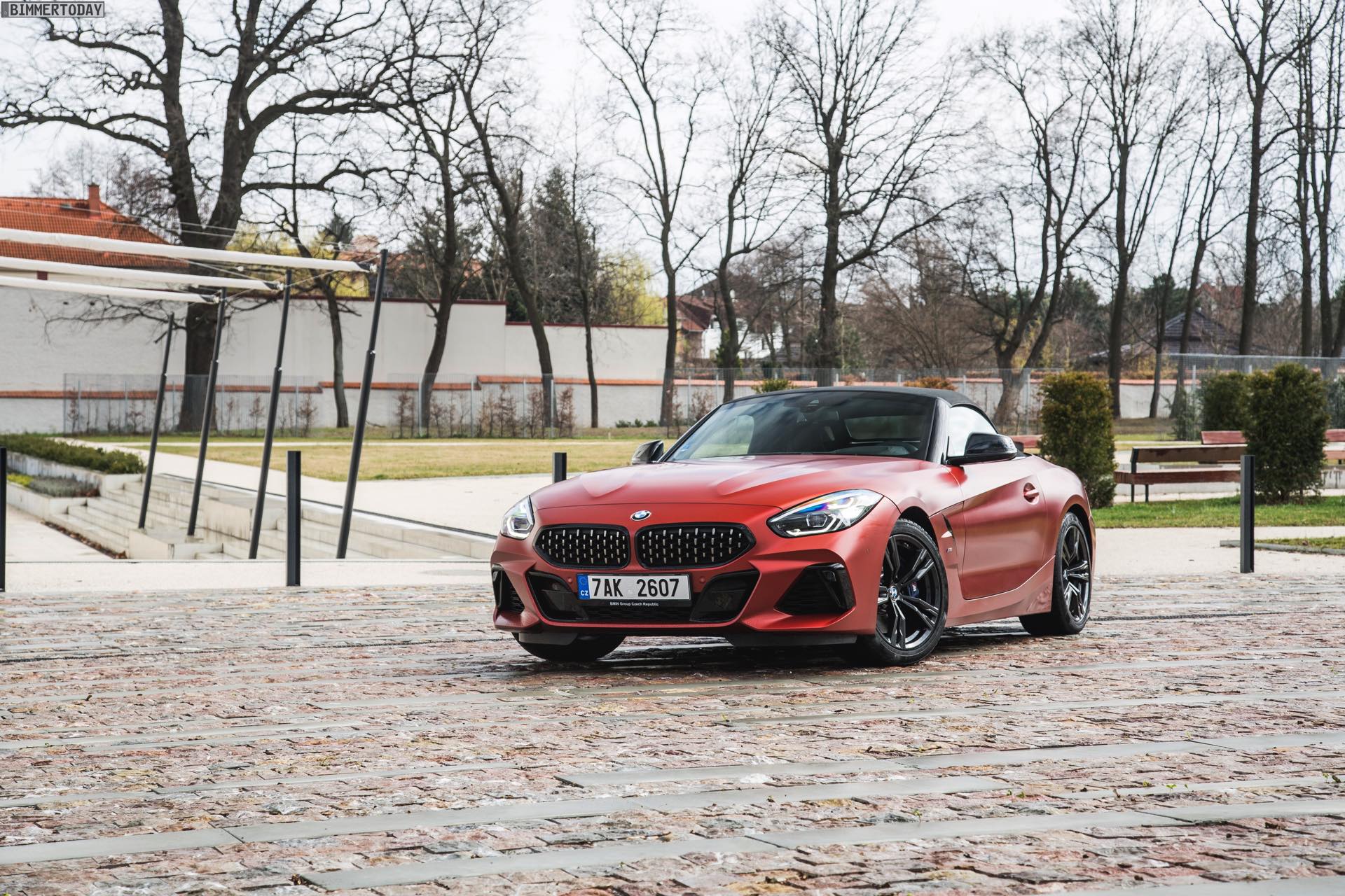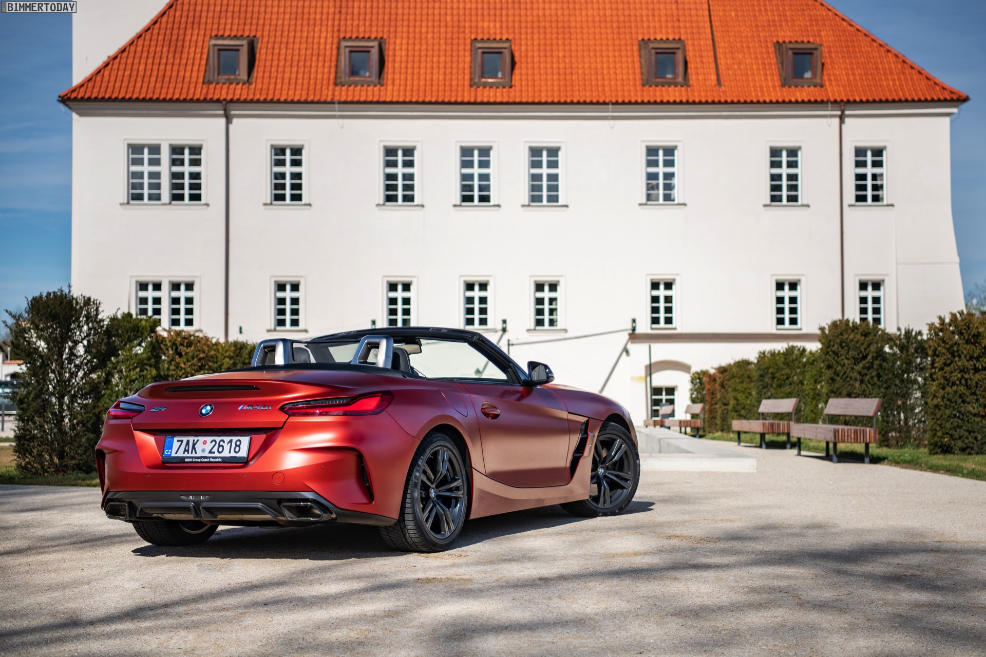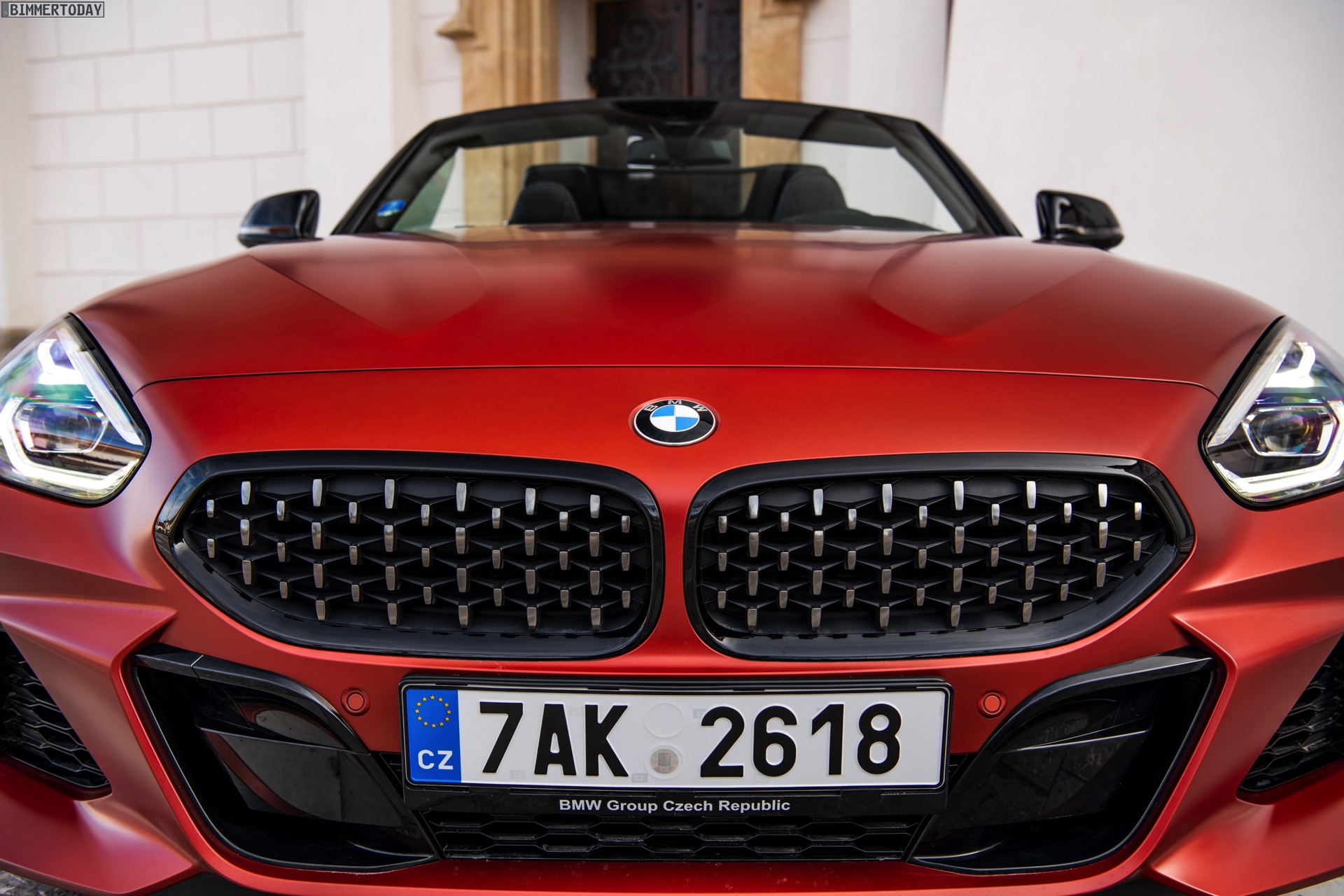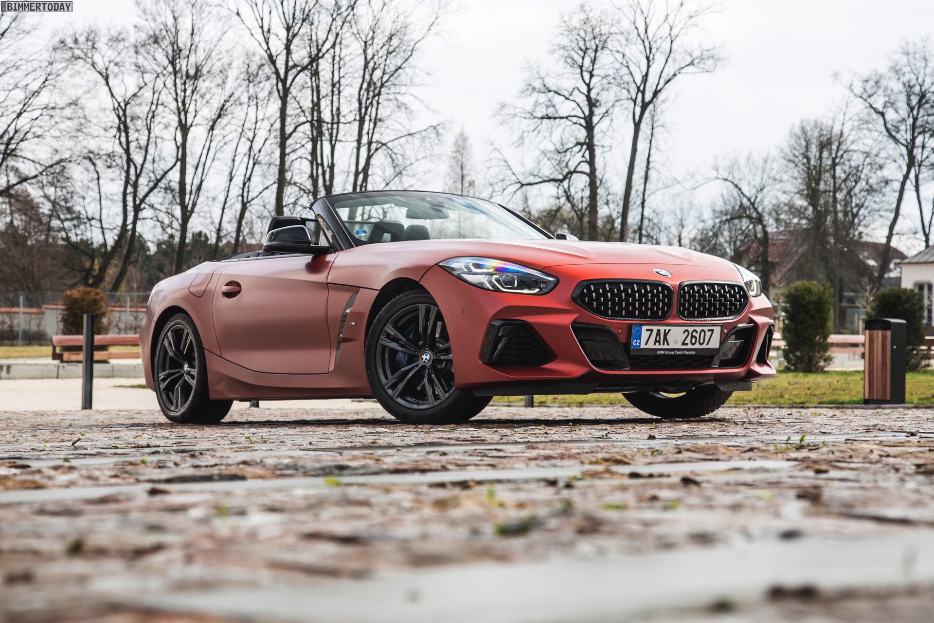 Dass er dabei mitunter auch artgerecht bewegt wird, sehen wir auf den Bildern einer Foto-Produktion aus der Tschechischen Republik. Kein Zweifel: Die schiere Kraft des Reihensechszylinders verführt am Steuer des BMW Z4 M40i zum einen oder anderen Drift und lässt das knackige Heck in kundiger Hand vor Freude tanzen. Zwar bleibt bei diesem Anblick kaum Zeit für eine Konzentration auf die matte Lackierung im exklusiven Farbton Frozen Orange Metallic, aber es gibt zum Glück auch einige statische Fotos mit stehendem Fahrzeug.