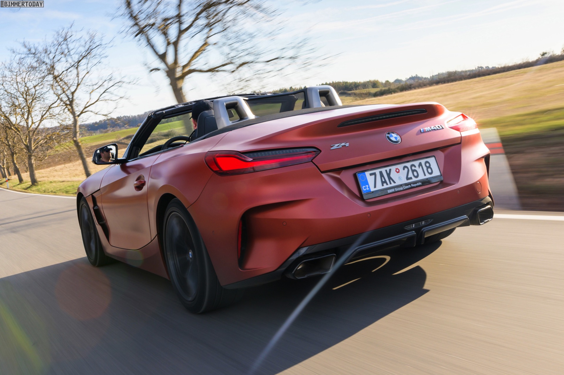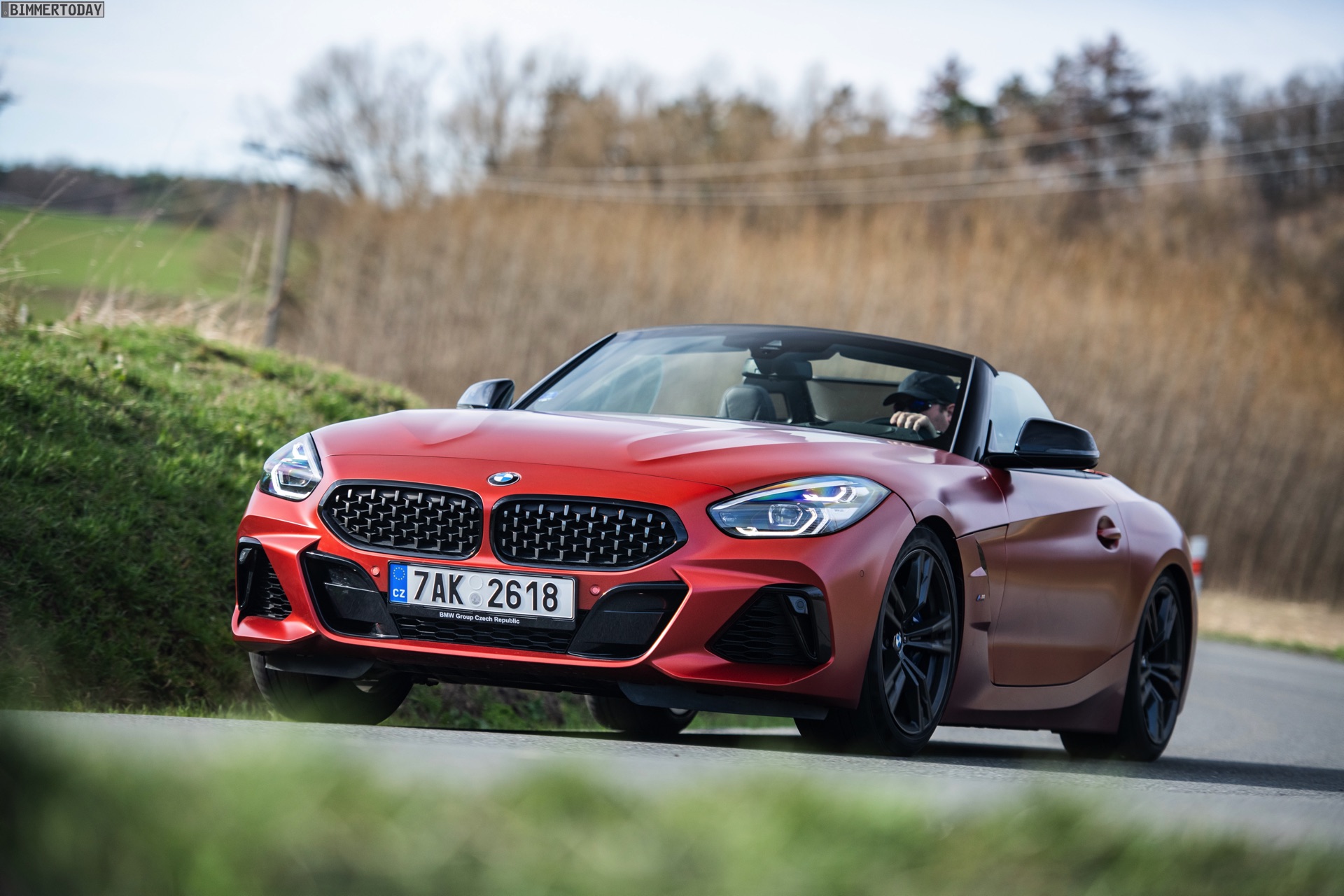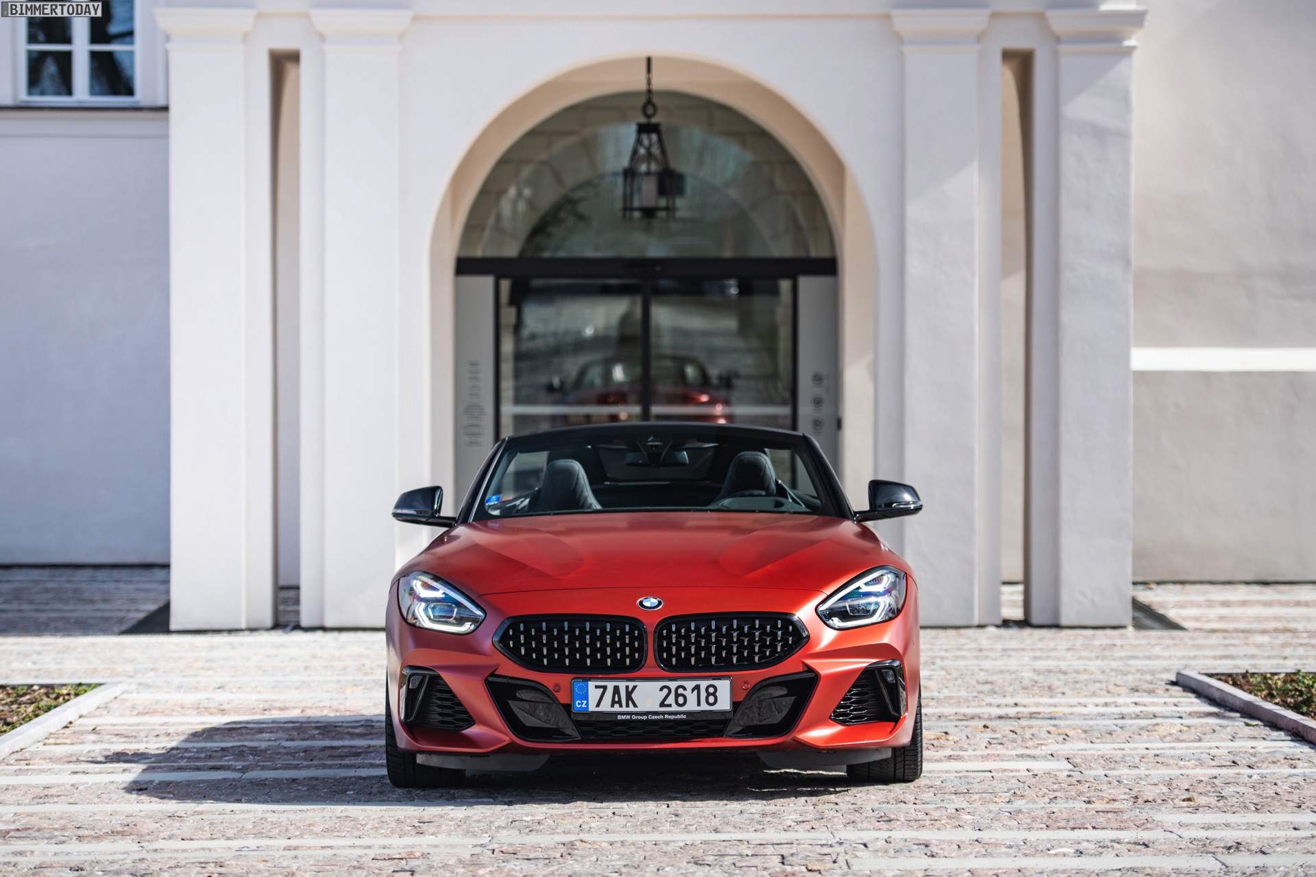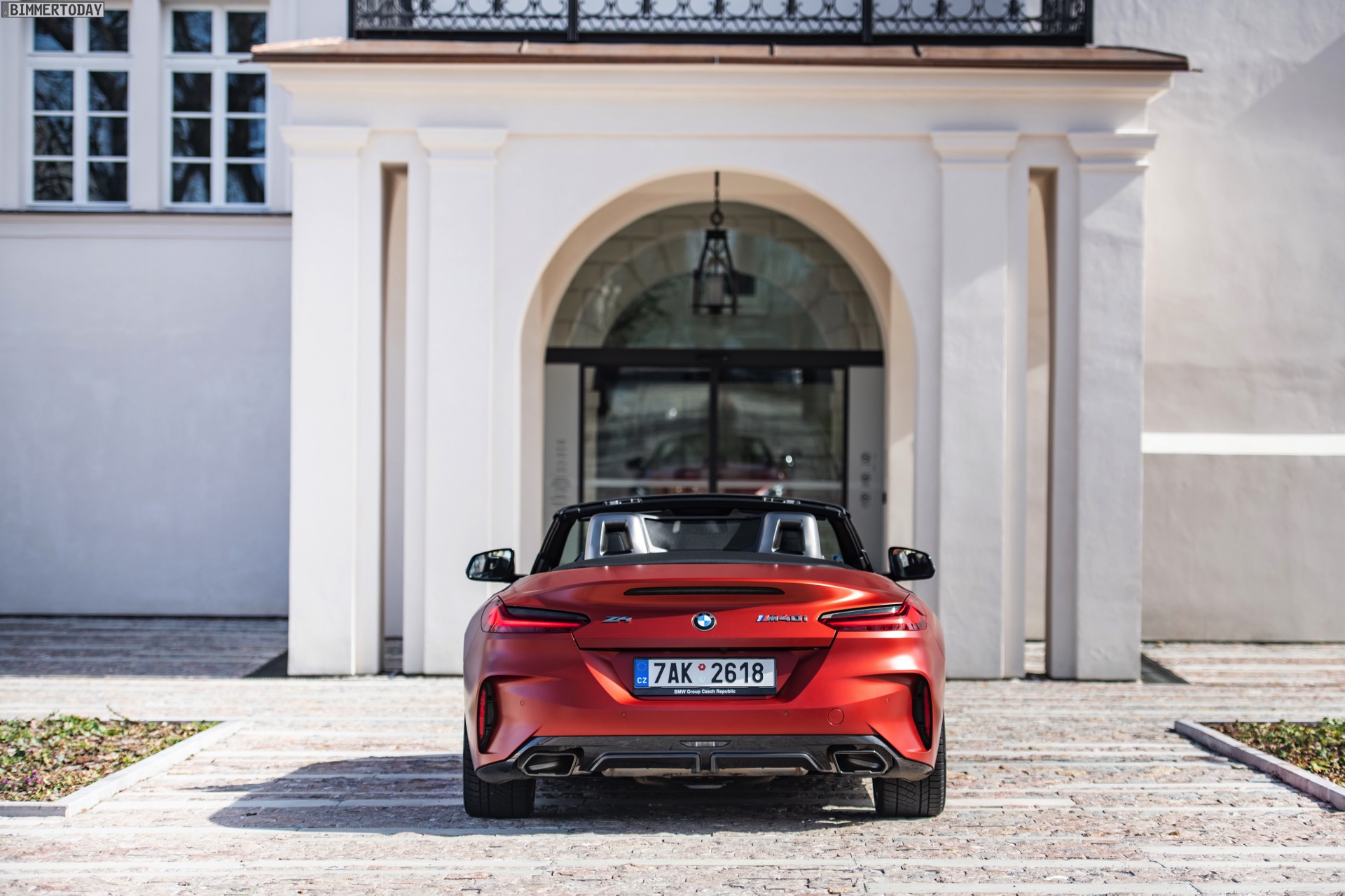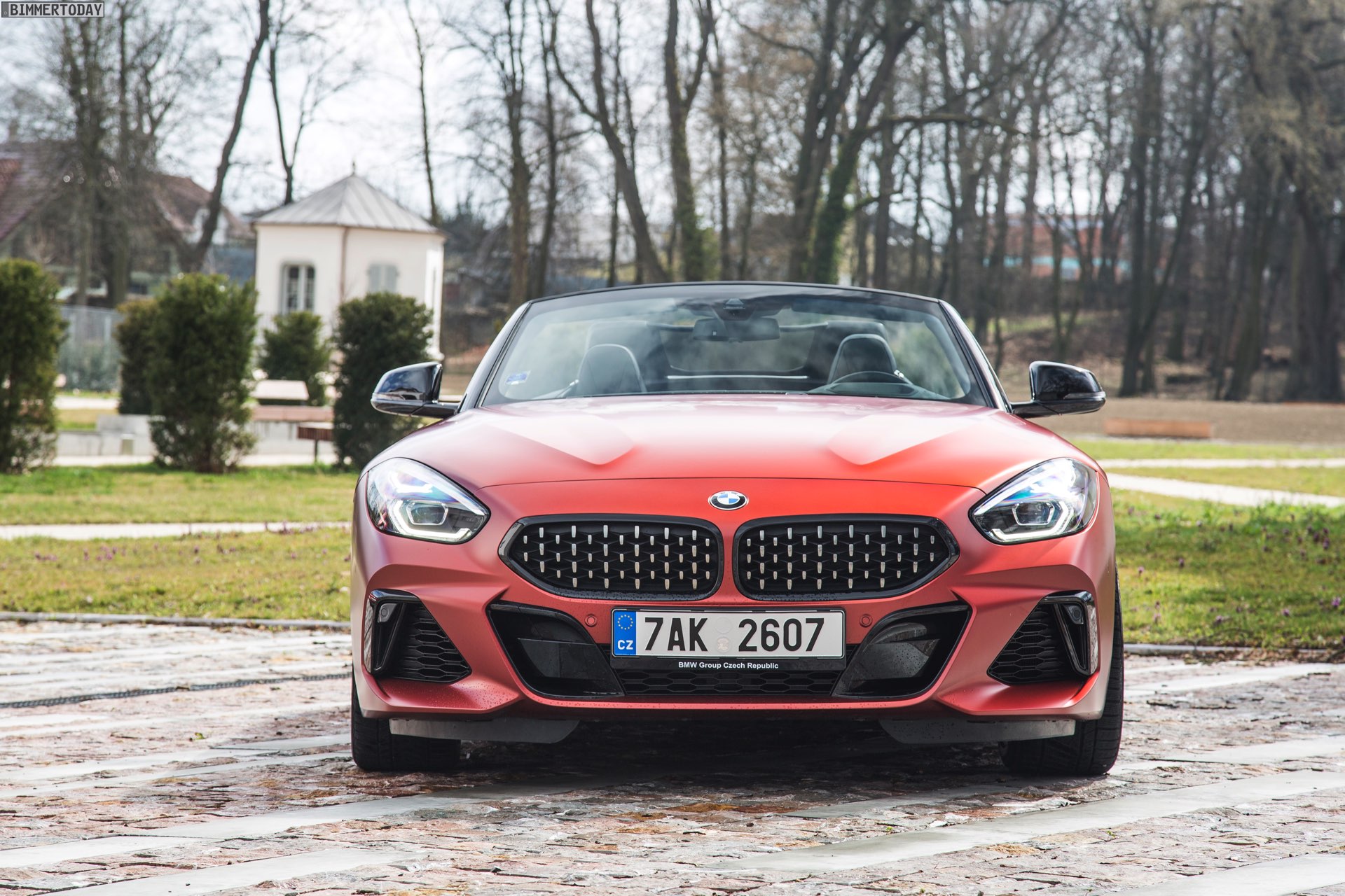 Dass er dabei mitunter auch artgerecht bewegt wird, sehen wir auf den Bildern einer Foto-Produktion aus der Tschechischen Republik. Kein Zweifel: Die schiere Kraft des Reihensechszylinders verführt am Steuer des BMW Z4 M40i zum einen oder anderen Drift und lässt das knackige Heck in kundiger Hand vor Freude tanzen. Zwar bleibt bei diesem Anblick kaum Zeit für eine Konzentration auf die matte Lackierung im exklusiven Farbton Frozen Orange Metallic, aber es gibt zum Glück auch einige statische Fotos mit stehendem Fahrzeug.