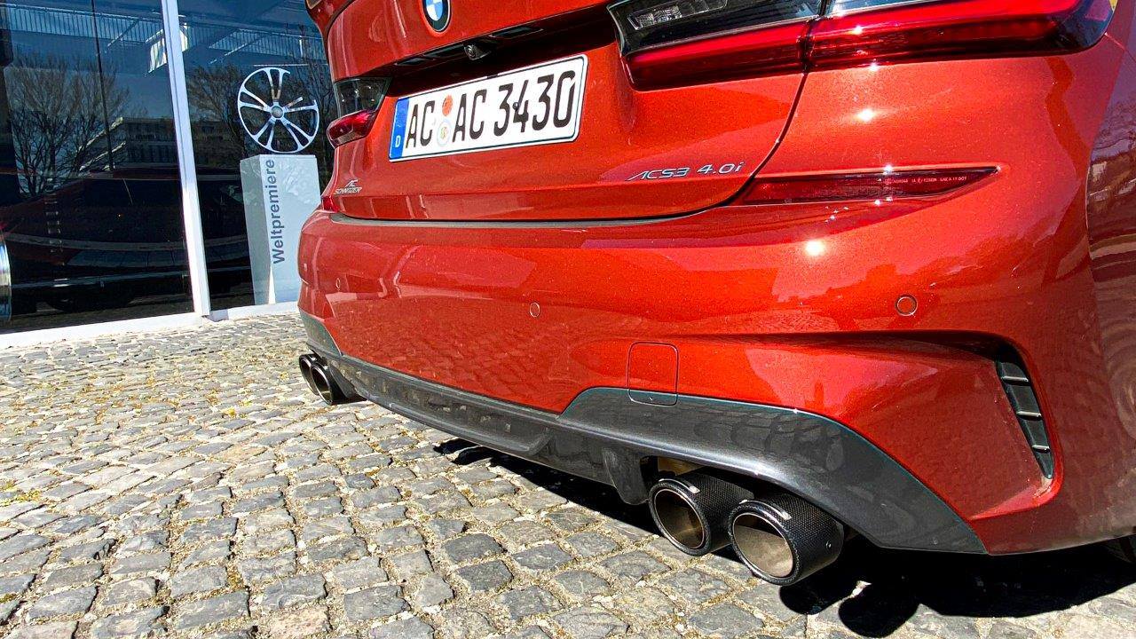 Sowohl für die Optik als auch für die Aerodynamik haben die Aachener einige sportliche Karosserie-Anbauteile verbaut, die das Design der 3er Limousine mit M Sportpaket weiter schärfen. Ergänzend zu den seitlichen Frontschürzen-Aufsätzen trägt der BMW M340i einen Frontsplitter, optisch passende Seitenschweller-Elemente sowie einen Dachkanten-Spoiler und eine Spoiler-Lippe auf der Kofferraum-Haube. Abgerundet wird das Tuning-Paket mit einem Edelstahl-Schalldämpfer, der das Heck des M340i mit vier Endrohren aufwertet und zudem für einen noch satteren Sound sorgt.