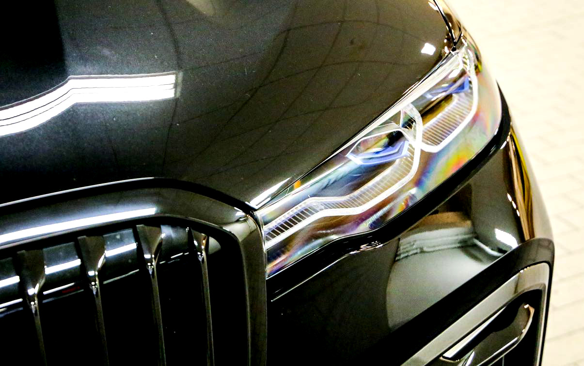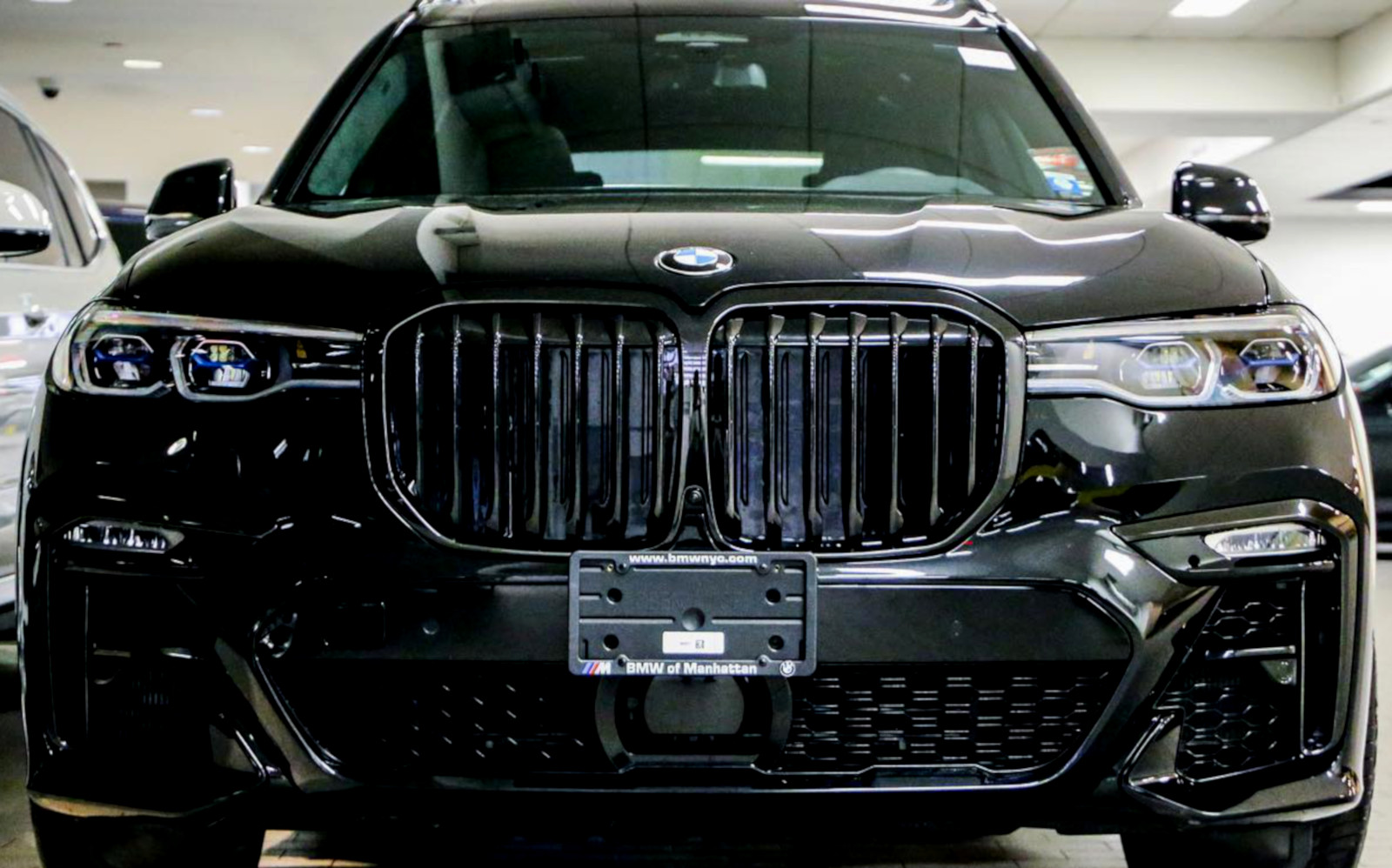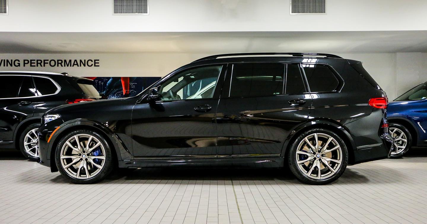 Zum mächtigen Auftritt des BMW X7 trägt natürlich auch das Design bei, das keinen Hehl aus dem Anspruch des Edel-Offroaders macht. Vor allem die riesige Doppel-Niere an der Front hat anfangs für viele Diskussionen gesorgt, wird von der Zielgruppe aber offenbar sehr geschätzt. Die dunkelste aller ab Werk erhältlichen Konfigurationen sehen wir nun auf einer Foto-Serie von BMW of Manhattan, denn im Showroom der New Yorker Niederlassung steht ein BMW X7 M50i, der seine schwarze Lackierung mit der BMW Individual Hochglanz Shadow Line mit erweiterten Umfängen kombiniert.