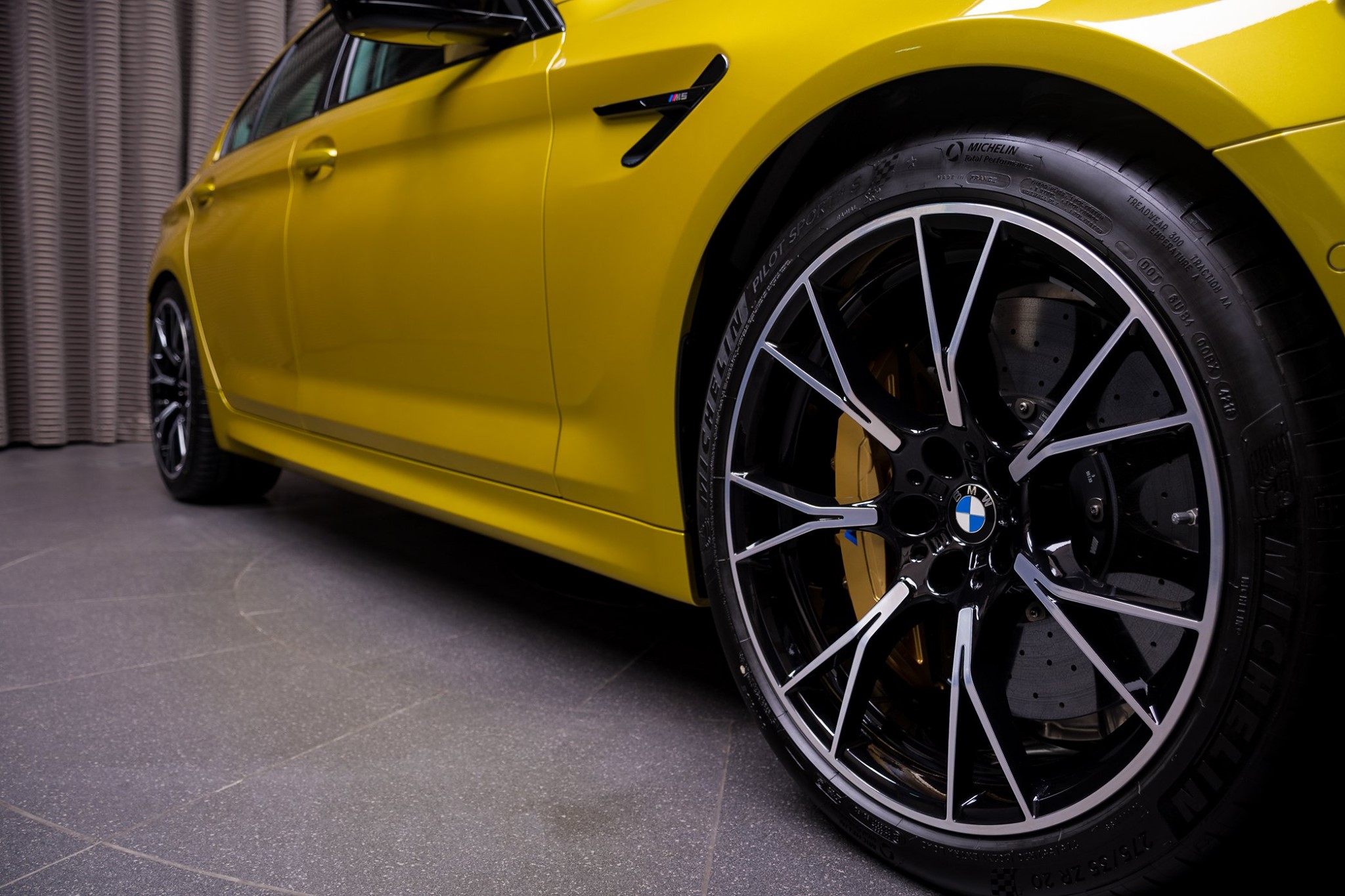 Weitere dunkle Details sind der M5 Competition-Schriftzug am Heck und natürlich das auch beim Standard-M5 serienmäßige Carbon-Dach. Abgerundet wird der kontraststarke Schwarz-Gold-Look durch die in dunklem Orbitgrau gehaltenen Elemente der 20 Zoll großen Leichtmetallräder Y-Speiche 789 M Bicolor, die exklusiv für den M5 Competition erhältlich sind. Hinter den Felgen glänzen die goldenen Bremssättel der M Carbon-Keramik-Bremsanlage, die selbst bei der 625-PS-Version mit einem stattlichen Aufpreis von 8.800 Euro verbunden sind.