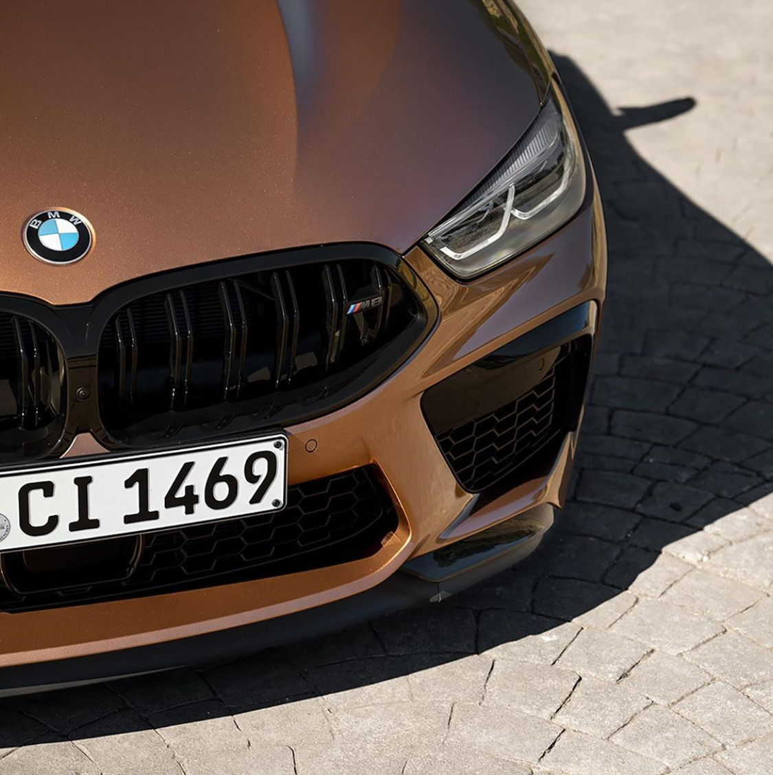 Nicht nur die beim BMW M8 Competition serienmäßig in Hochglanz-Schwarz gehaltenen Exterieur-Details harmonieren sehr gut mit der Lackierung in Zanzibar, auch die schwarzen Elemente der 20 Zoll großen Leichtmetallräder Sternspeiche 811 M Bicolor tragen zum stimmigen Gesamtauftritt bei. Im Innenraum können wir die Vollleder-Ausstattung Merino Feinnarbe in Silverstone und Schwarz erahnen, die für einen sehr edlen Touch sorgt und den Drang zum Einsteigen noch verstärkt.