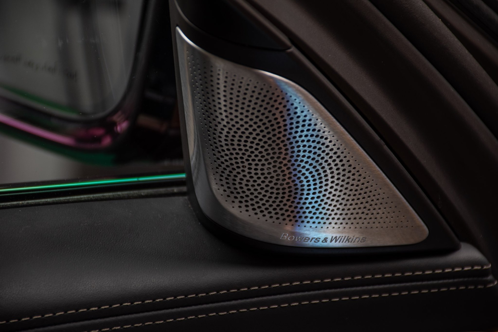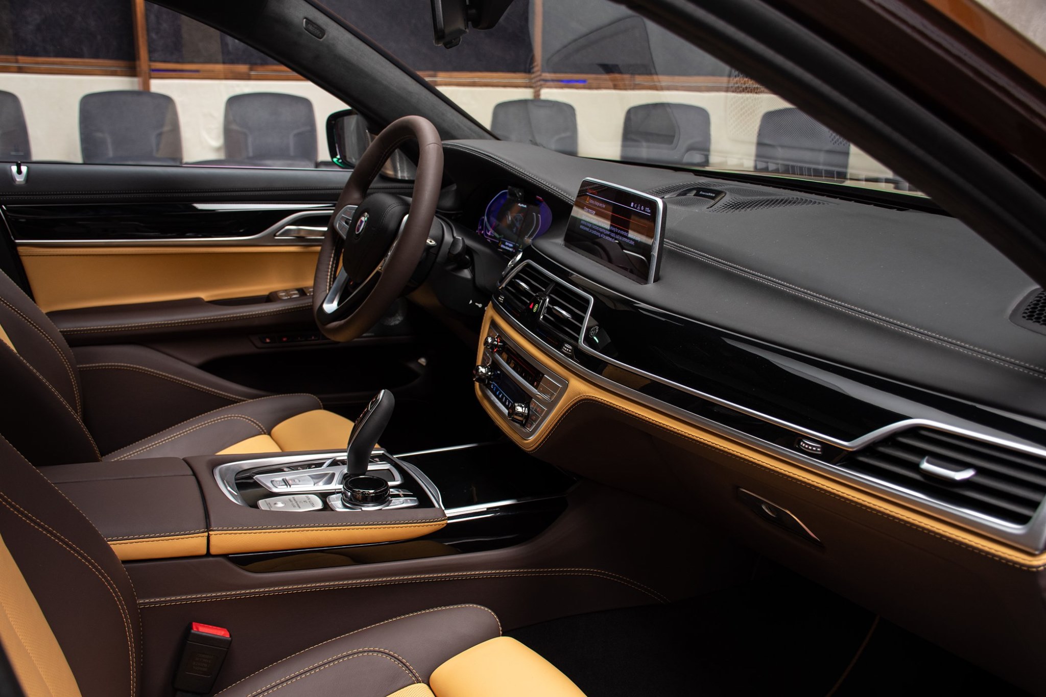 In verschiedenen Braun-Tönen präsentiert sich auch das Interieur des in Abu Dhabi ausgestellten Fahrzeugs. Die Bicolor-Ausstattung in den Farben Caramel und Cohiba wird mit dunklen Hölzern kombiniert und sorgt für eine wohnliche Atmosphäre. Farbige Kontrastnähte und die in die Kopfstützten geprägten Alpina-Wappen unterstreichen den hochwertigen Charakter, der von einem üppigen Platzangebot begleitet wird. Wie der Blick in den Fond eindeutig zeigt, kommt die BMW 7er Langversion G12 LCI als Basis zum Einsatz – einen B7 mit kurzem Radstand bietet Alpina in der aktuellen Generation mangels Nachfrage auch gar nicht an.