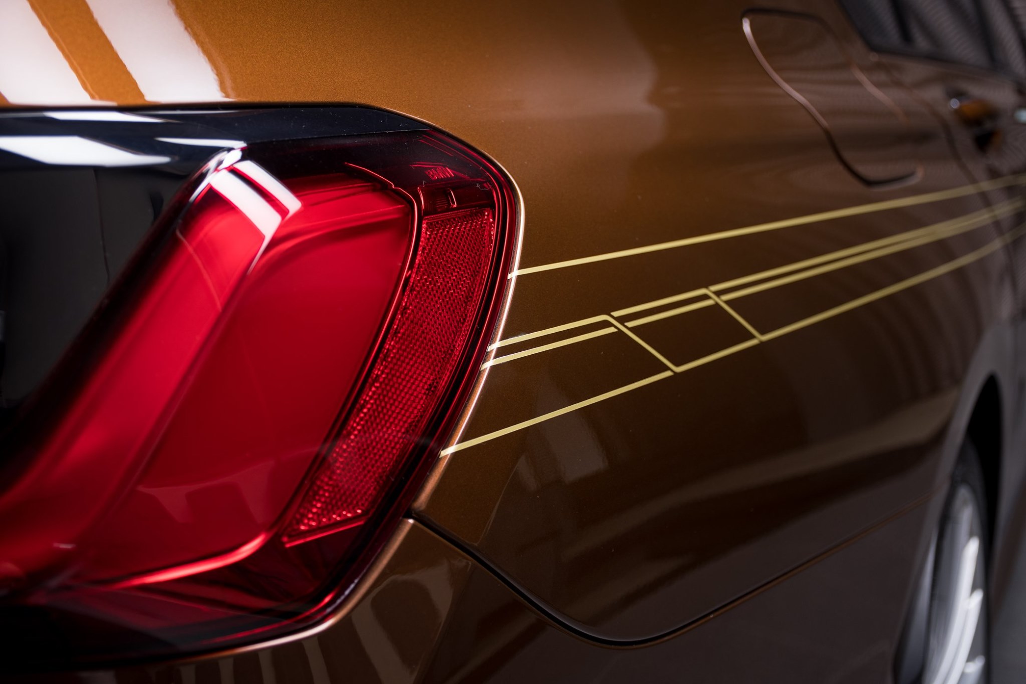 Sehr gut zur Lackierung in Kastanienbronze passt das goldene Alpina-Dekor, das in Buchloe auf Wunsch ohne Aufpreis verklebt wird. B7-Kunden können dabei zwischen Silber und Gold wählen, auch eine Beschränkung auf den Frontspoiler ist problemlos möglich. Und wer mit seinem BMW Alpina lieber etwas unter dem Radar bleiben will, kann ihn natürlich auch ohne Deko-Set bestellen. Für den prominenten Schriftzug am unteren Rand der Frontschürze stehen die Farben Silber, Gold und Schwarz hochglänzend zur Wahl.