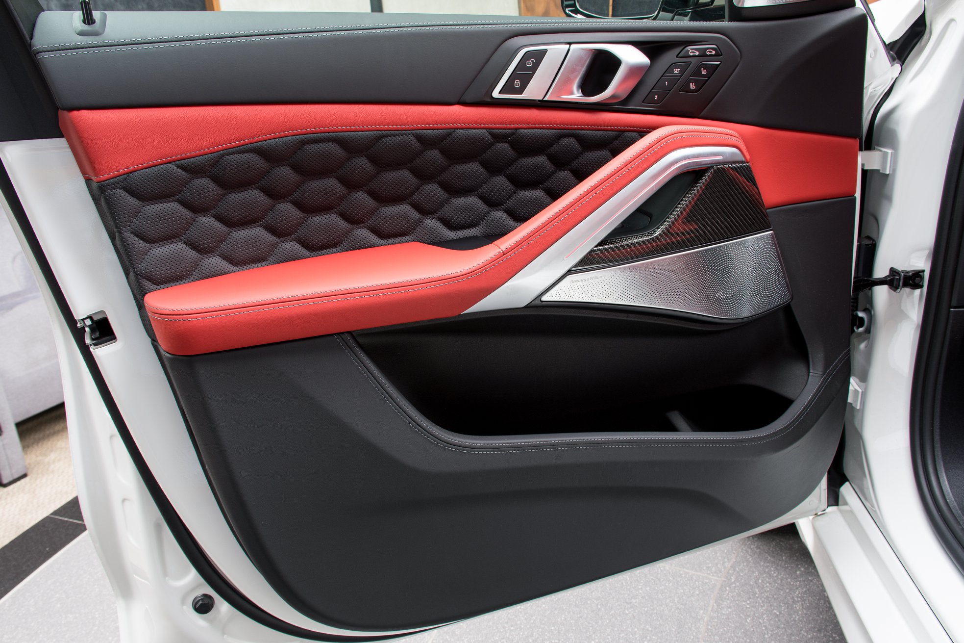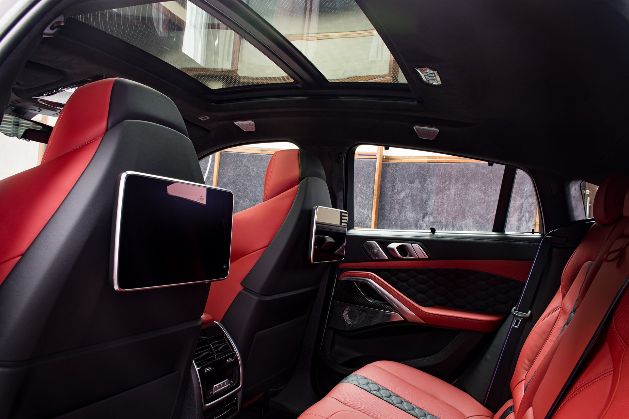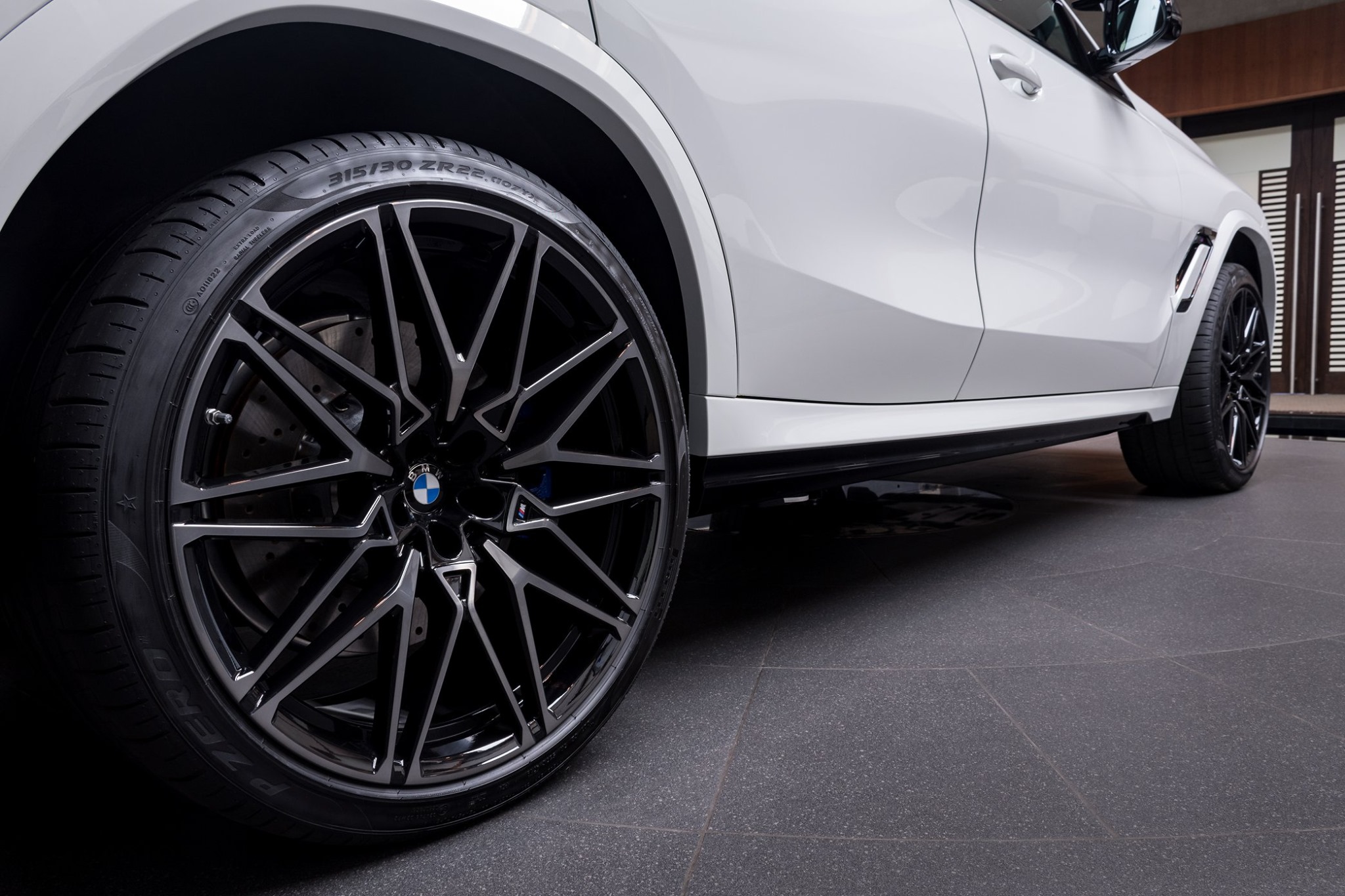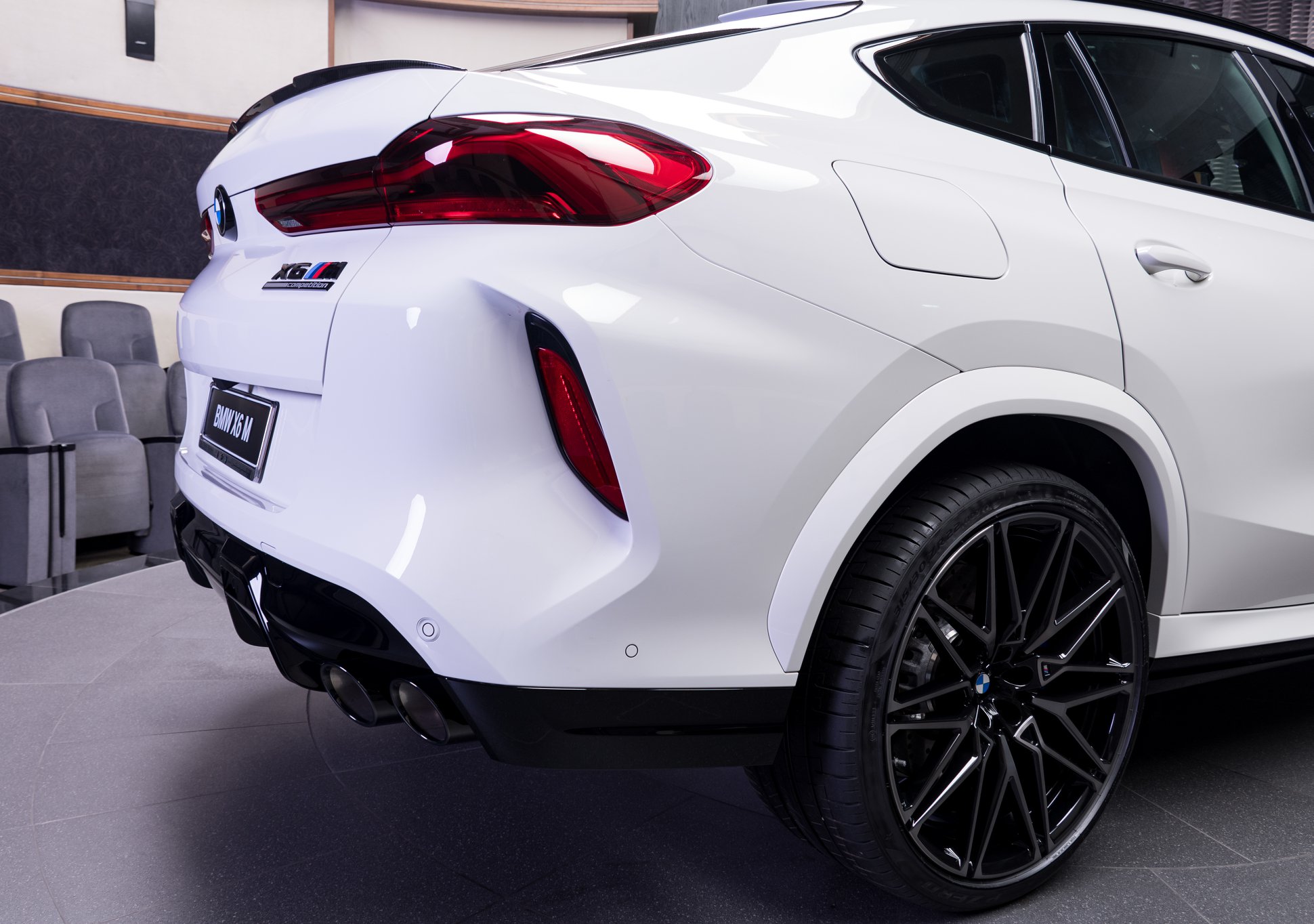 Auch wenn das Interieur aus farbiger Sicht der unumstrittene Blickfang ist, verdient auch das Exterieur einen genaueren Blick. Die Lackierung in Alpinweiß steht dabei im scharfen Kontrast zu den schwarzen Akzenten des BMW X6 M Competition, auch die Schmiedefelgen im Design Sternspeiche 818 M Bicolor glänzen mit schwarzen Details. Wie bei allen X5 M und X6 M sind auch beim gezeigten Fahrzeug unterschiedlich große Felgen verbaut: An der Vorderachse kommen 21-Zöller mit 295 Millimeter breiter Bereifung zum Einsatz, an der Hinterachse sind die 315-Millimeter-Reifen sogar auf 22-Zöllern montiert. Abgerundet wird das kontrastreiche Spiel von hellen und dunklen Farben durch Hightech-Akzente wie die Außenspiegelkappen und die Heckspoiler-Lippe aus Carbon.